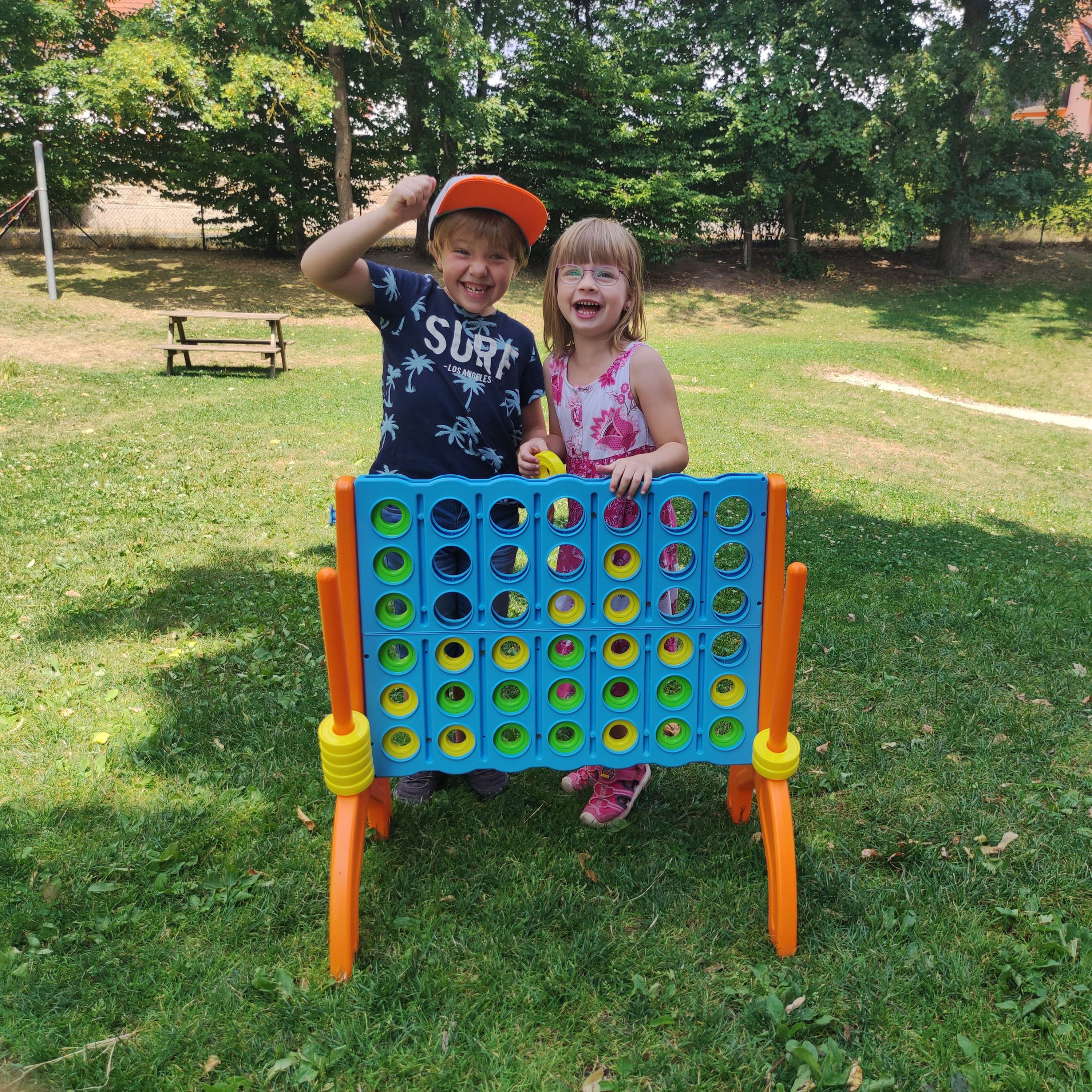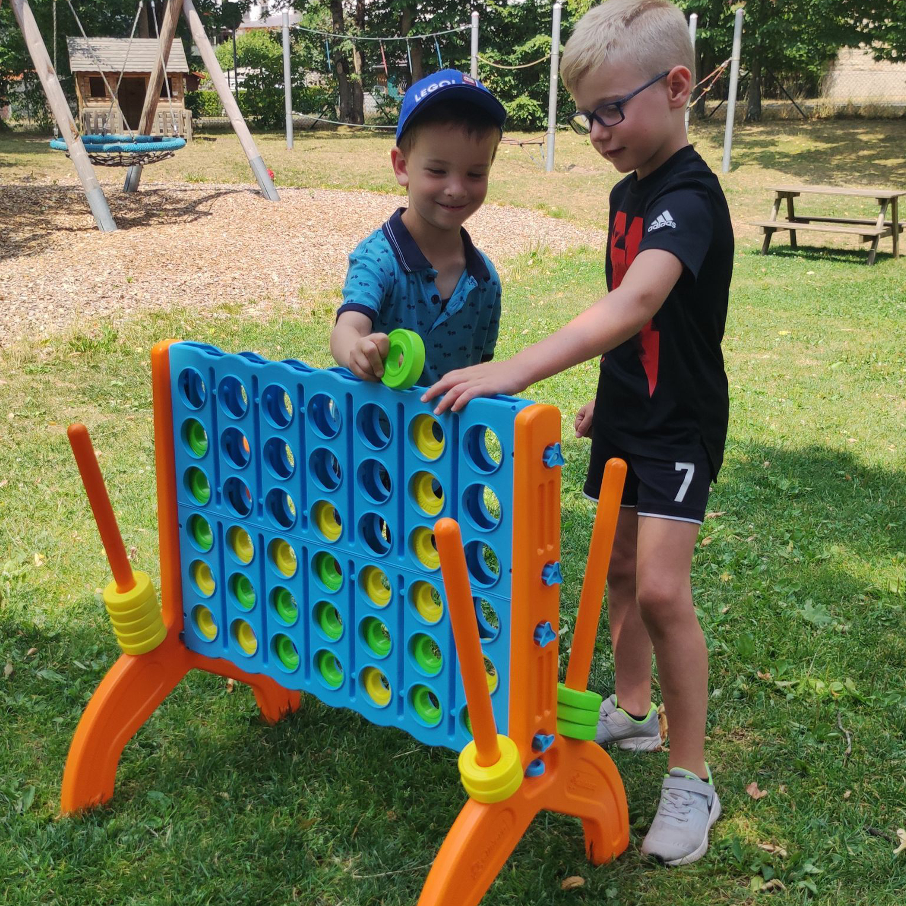 We hebben de populaire speelklassieker "4 op een rij" in een extra grote XL-versie. In elkaar gezet is hij ongeveer 73 × 49 × 72,5 cm. Wie brengt als eerste 4 speelstenen van zijn eigen kleur verticaal, horizontaal of diagonaal op een rij?