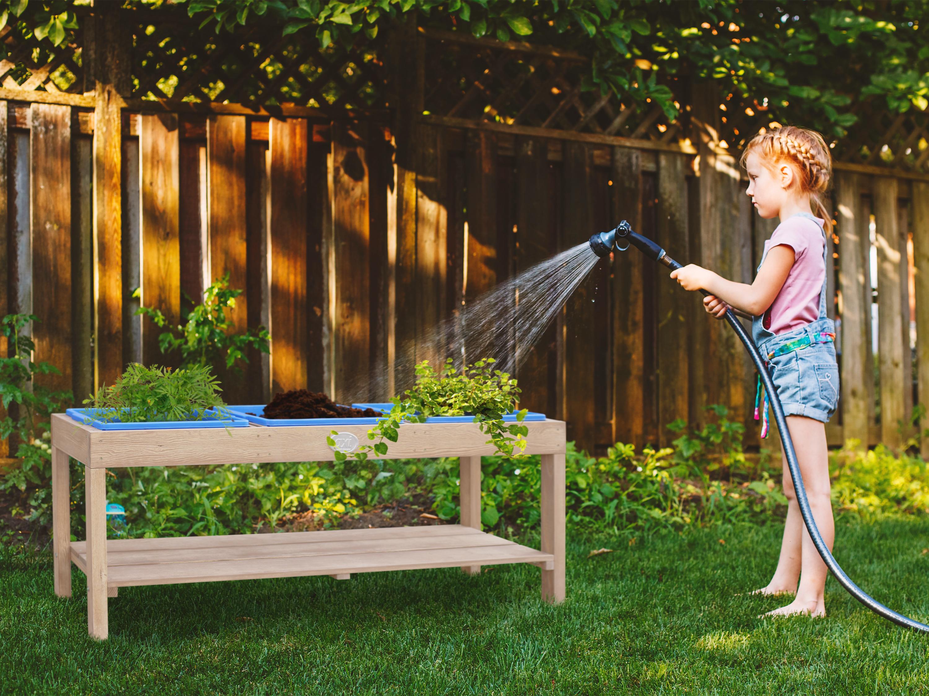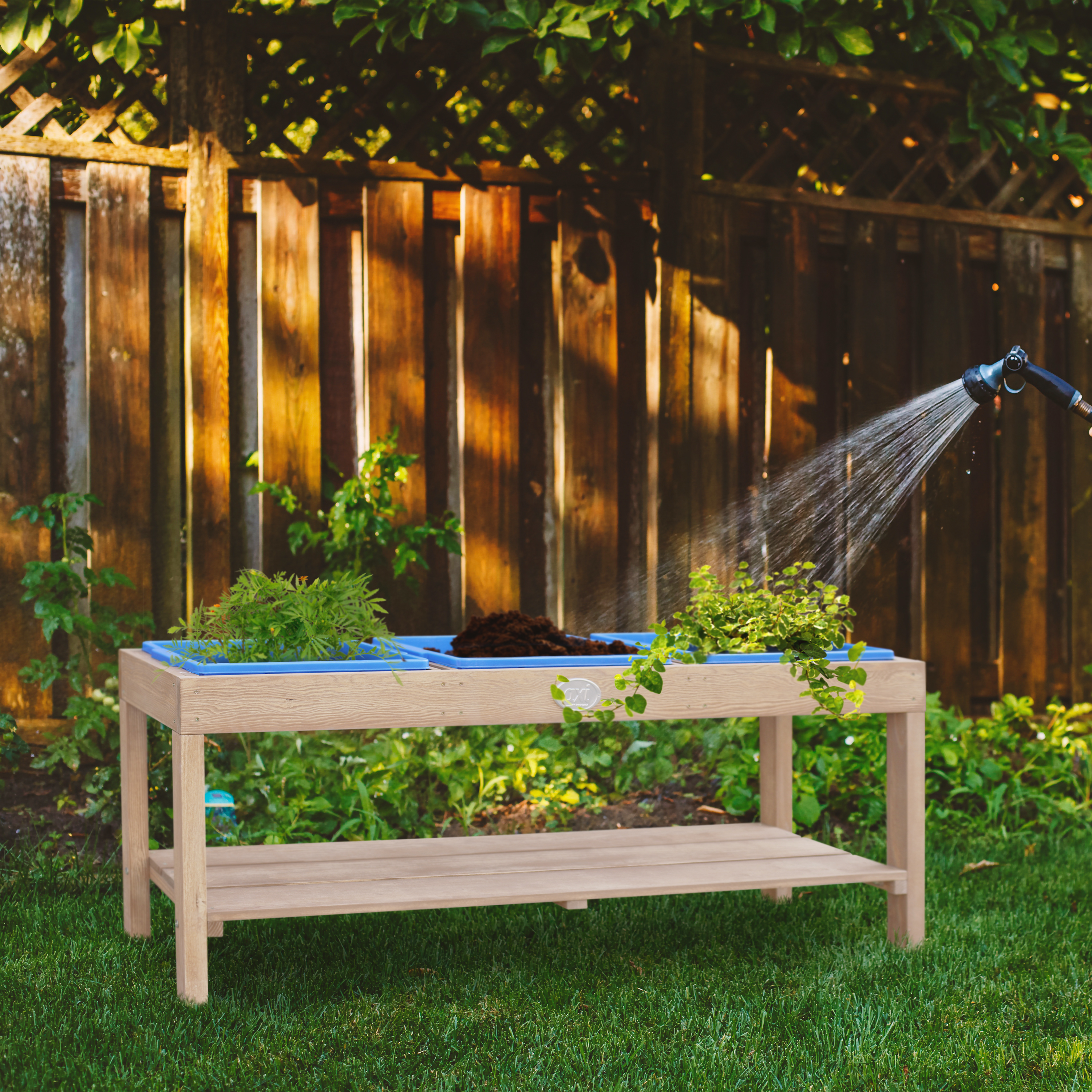 - Drie uitneembare blauwe kunststofbakken voor zand of water.