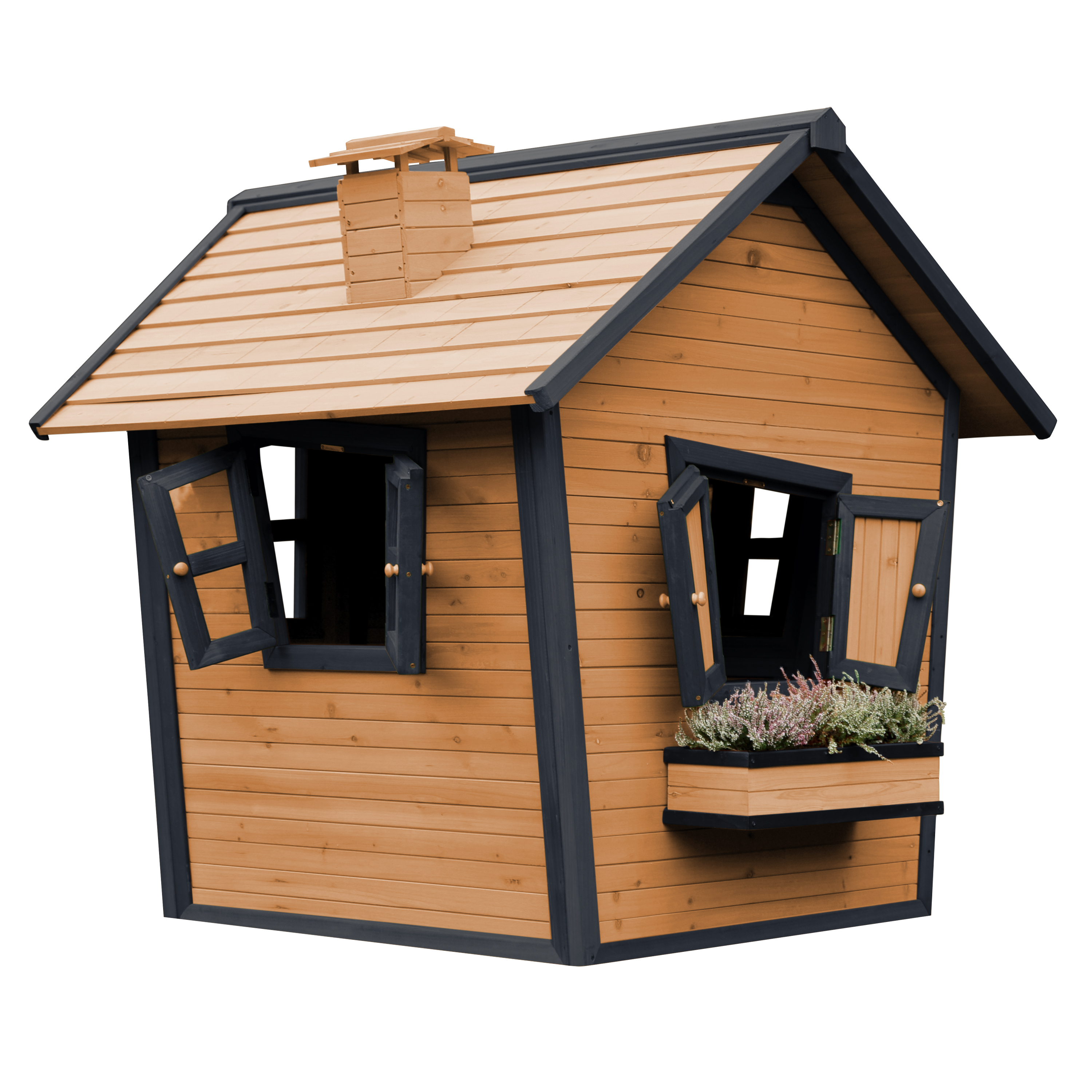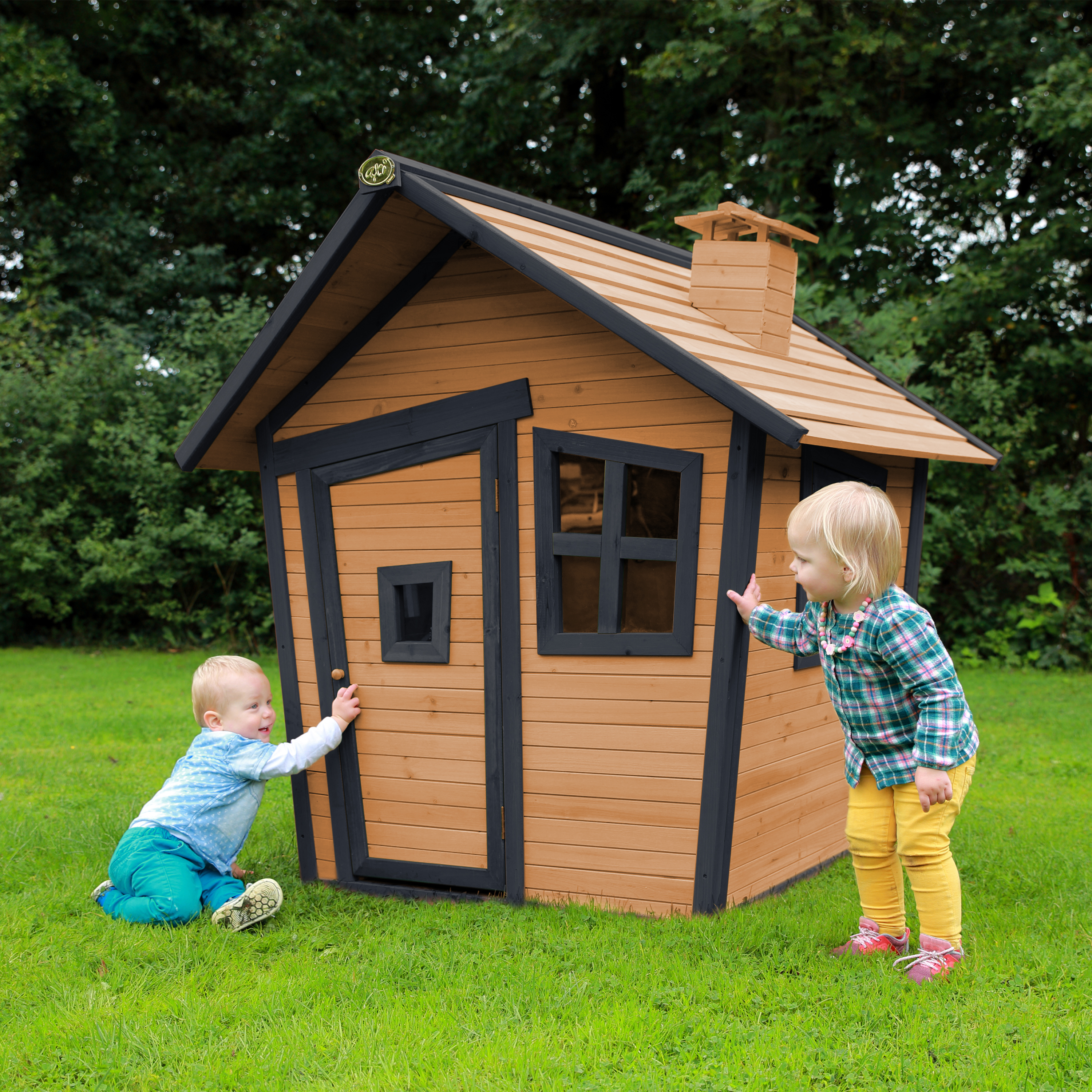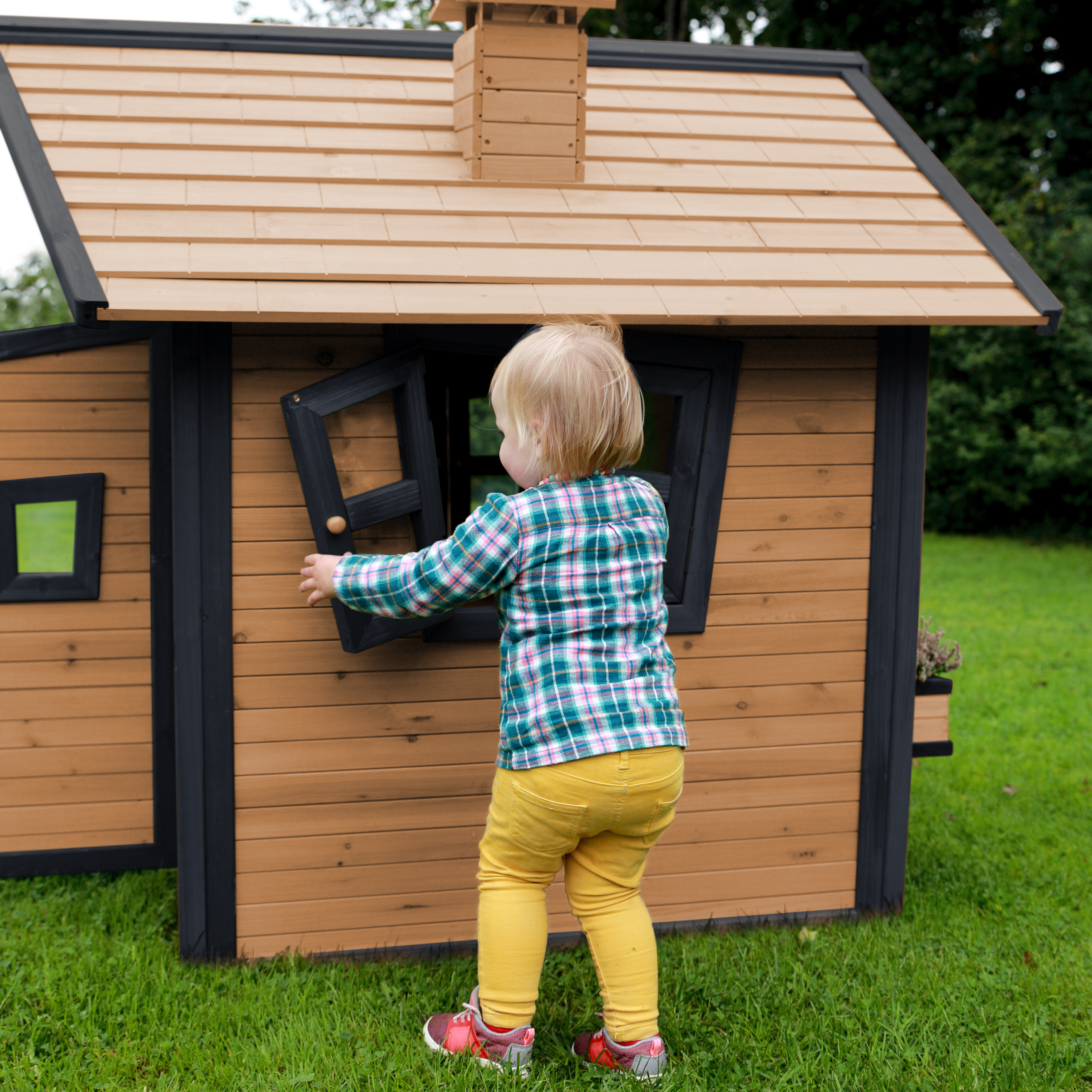 Kinderen kunnen gezellig in de tuin spelen in hun eigen AXI Alice Speelhuis Bruin/antraciet. Alice is een veelzijdig houten speelhuis uit de unieke Crooked serie van AXI. Het speelhuisje is uitgevoerd in moderne Bruin/antraciete kleuren welke perfect in iedere hedendaagse tuin passen. Alle speelhuisjes van het Crooked ontwerp hebben een schoorsteen op het dak en schuine ramen. De schuine deur heeft een klein raampje zodat kinderen kunnen zien wie er voor de deur staat zonder deze te openen. Bij mooi weer kunnen de kinderen de ramen eenvoudig openen en genieten van alles wat er buiten gebeurt. Laat ze snel de ramen dicht doen als het gaat regenen, zo zitten ze beschut en kunnen ze heerlijk doorspelen!