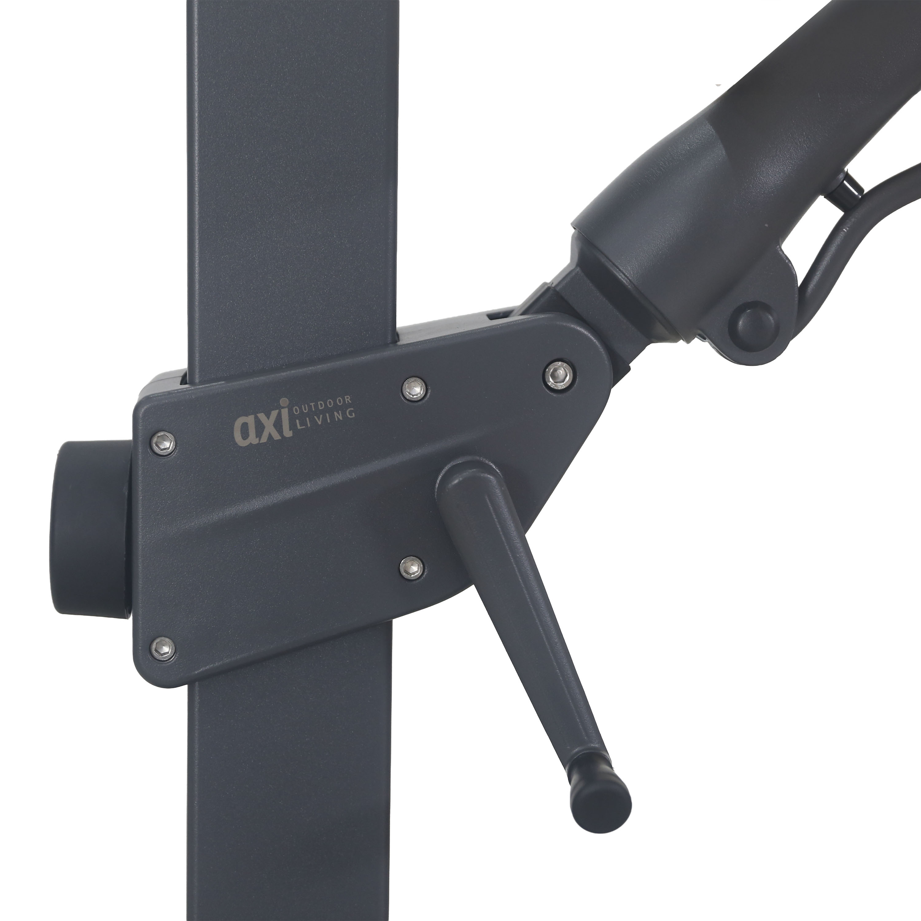 Het robuuste frame van de AXI Alina zweefparasol is gemaakt van gepoedercoat aluminium, waardoor het goed bestand is tegen verschillende weersinvloeden en niet roest. Het extra dikke frame van 53 x 80 mm zorgt voor een stabiele en stevige basis. Dankzij de 8 baleinen en doekspanners blijft het parasoldoek netjes en strak gespannen, zodat je altijd een verzorgde uitstraling in je tuin hebt. Het minimalistische ontwerp met het moderne frame zorgt ervoor dat de parasol perfect past bij verschillende stijlen tuinmeubilair, van moderne loungesets tot klassieke tuintafels.