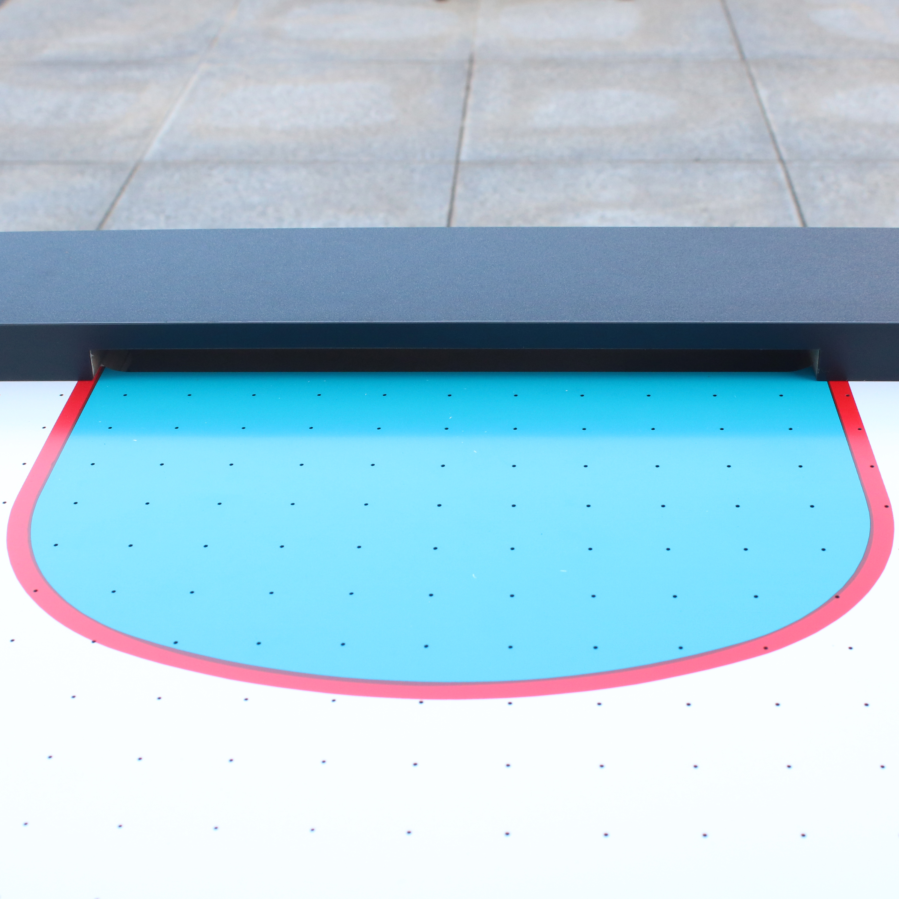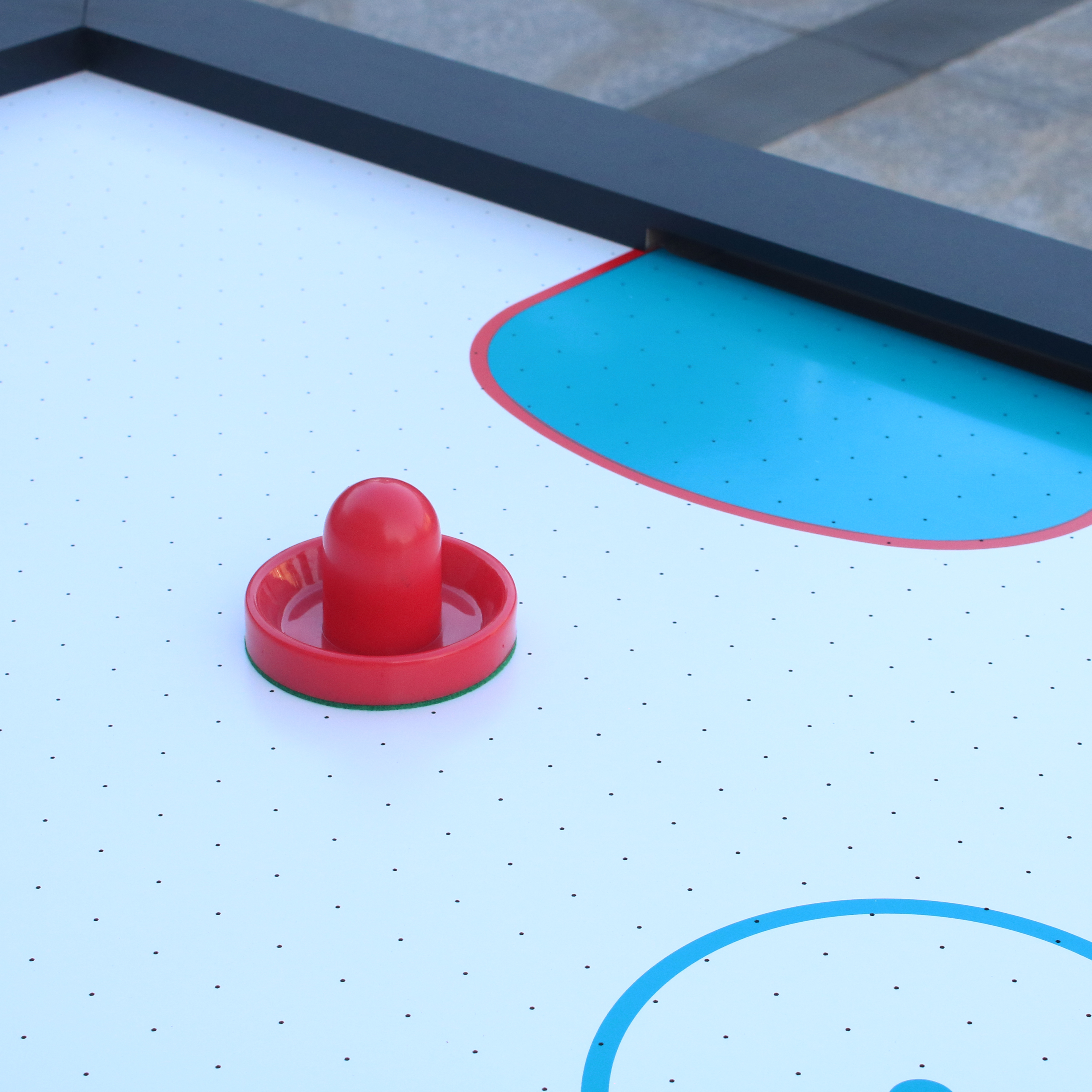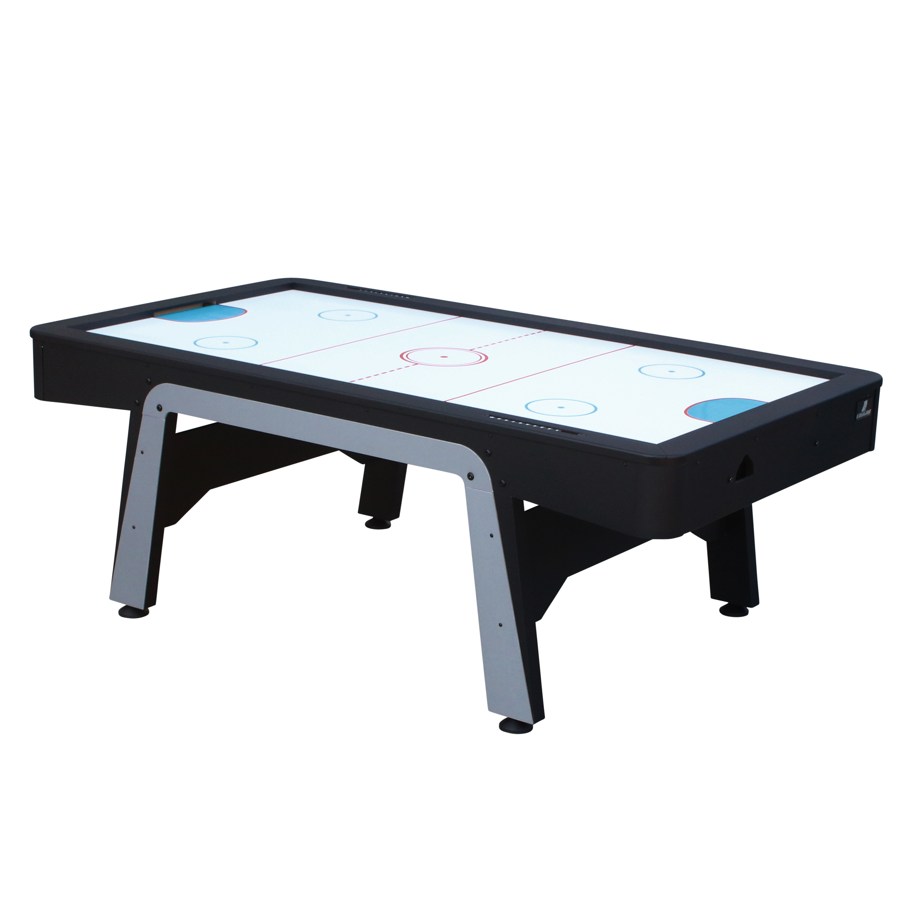 De tafel beschikt over een uitstekend glijdend 18mm dik speeloppervlak welke is uitgevoerd met een kras vaste PVC toplaag. Dit laatste is erg belangrijk, want een goede pot Airhockey valt of staat met een goed glad speelveld. Door de krachtige motor zweeft de puck gemakkelijk en snel over het speelveld. Het speelveld heeft een witte kleur met rode en blauwe lijnen en heeft een oppervlakte van (LxB) 206 x 104 cm.