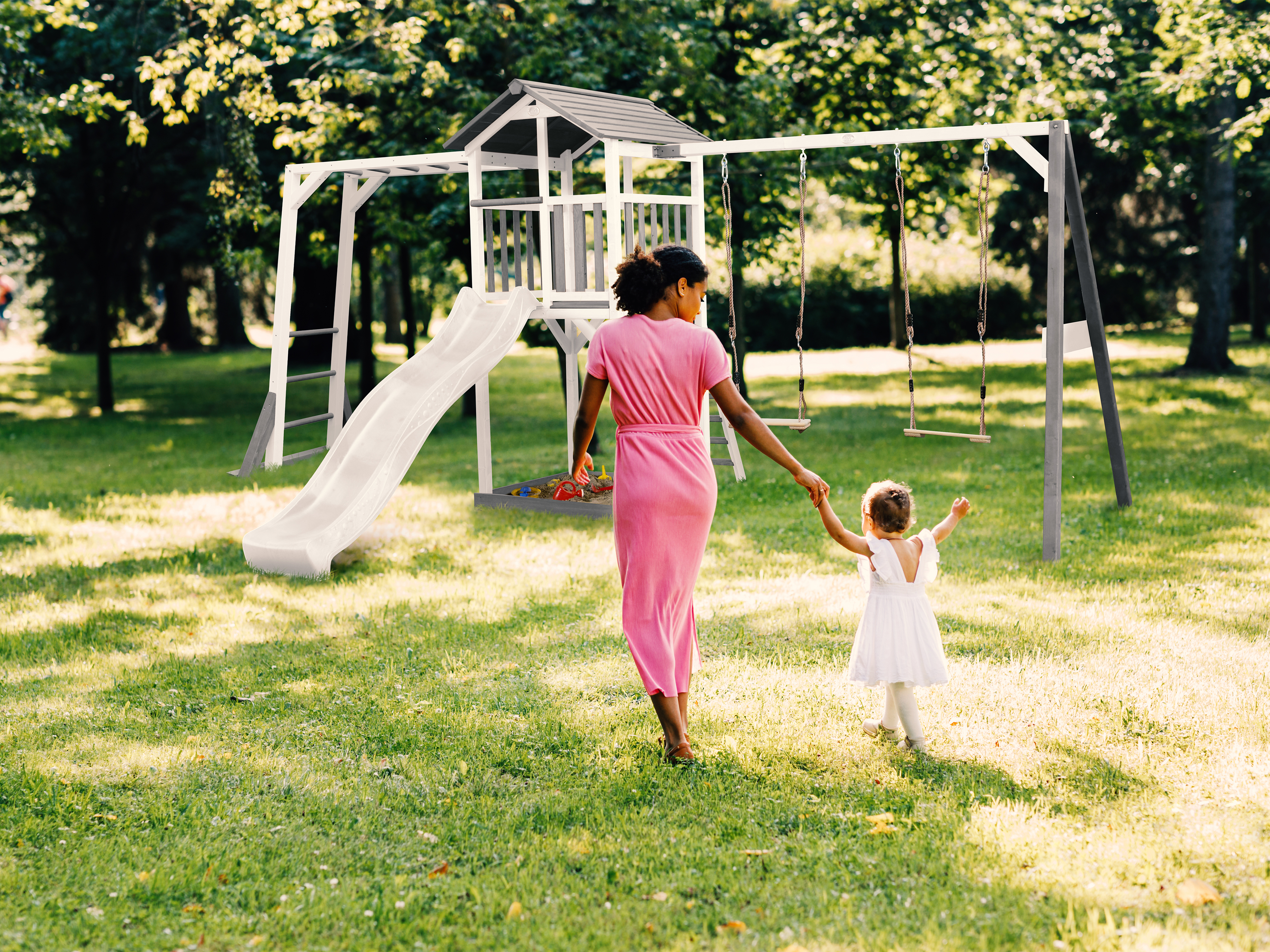 Via de trap kunnen ze omhoog de toren in klimmen. Vanaf daar hebben ze een prachtig uitzicht over de hele tuin. Tijd om weer naar beneden te gaan? Dan glijden ze snel en gemakkelijk via de lange glijbaan naar beneden. Onder de speeltoren is een zandbak waar ze met z’n allen zandtaartjes kunnen bakken. Als ze meer beweging willen kunnen ze het klimrek opklimmen en slingeren aan de aapstaven. Wie is het snelst aan de overkant? Naast het uitzicht vanaf de toren kunnen ze heerlijk genieten van hun vrijheid als ze aan het schommelen zijn. Gelukkig hoeven ze niet alleen te zwaaien, maar kan het met een vriendje of vriendinnetje tegelijk. Deze AXI Beach Tower heeft namelijk een dubbele schommel met twee houten schommelzitjes, voor dubbel zoveel zwaaiplezier! De combinatie van het wit/grijze hout geeft deze speeltoren een zomers uiterlijk die iedere tuin laat stralen. De Beach Tower Speeltoren heeft een platformhoogte van 117,5 cm en is uitgevoerd met een grote glijbaan van 228 cm lang. De schommel kan zowel links als rechts aan de speeltoren worden bevestigd.