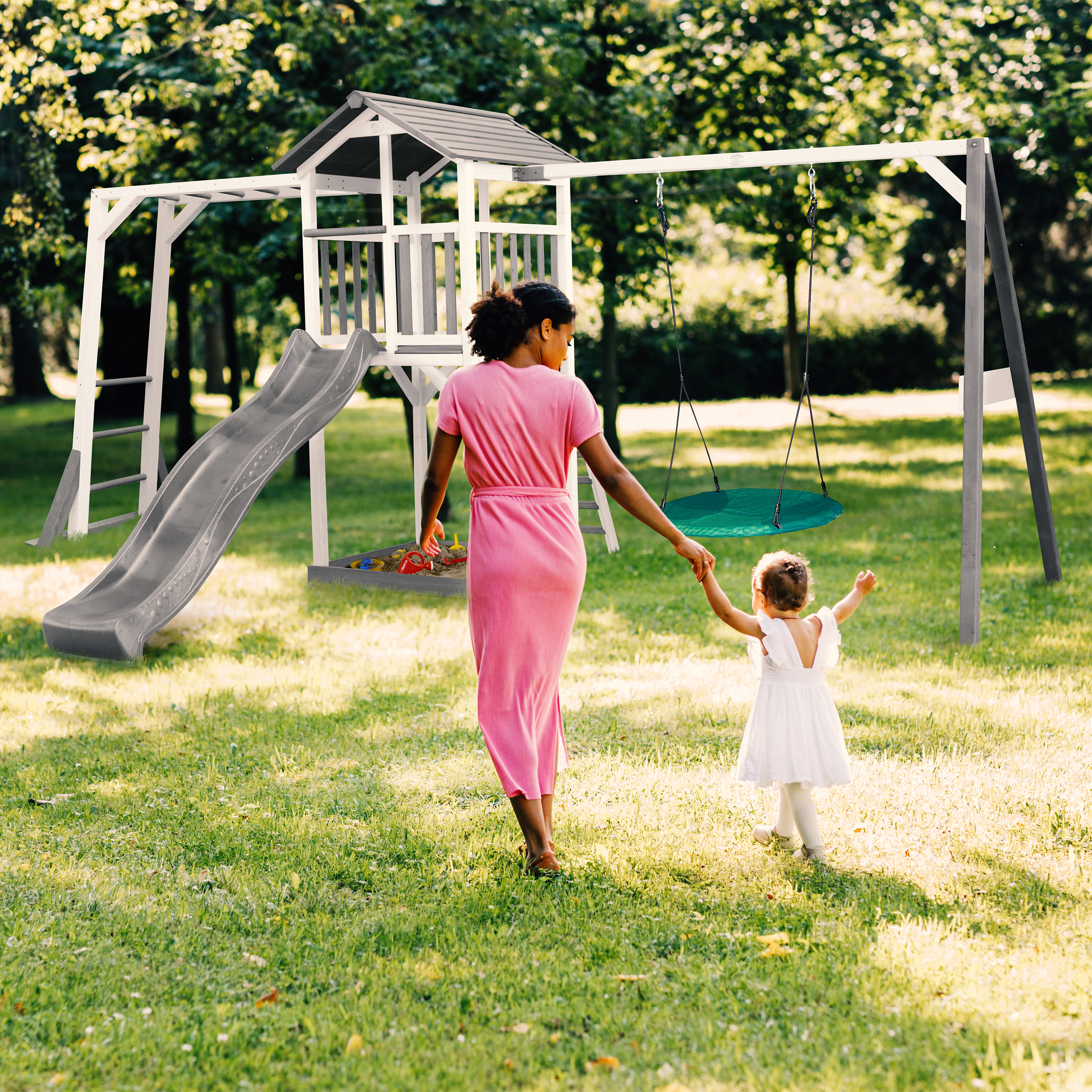 In de AXI Beach Tower Speeltoren met Klimrek en Summer Nestschommel Grijs/wit lijkt het net alsof je kinderen in een echt strandhuis zijn. Klimmen, glijden en schommelen zijn de favoriete bezigheden van jonge kinderen. En dat is allemaal mogelijk met deze Beach Tower. Het is onmogelijk dat kinderen zich hier niet uren mee zullen vermaken op een mooie zonnige dag.