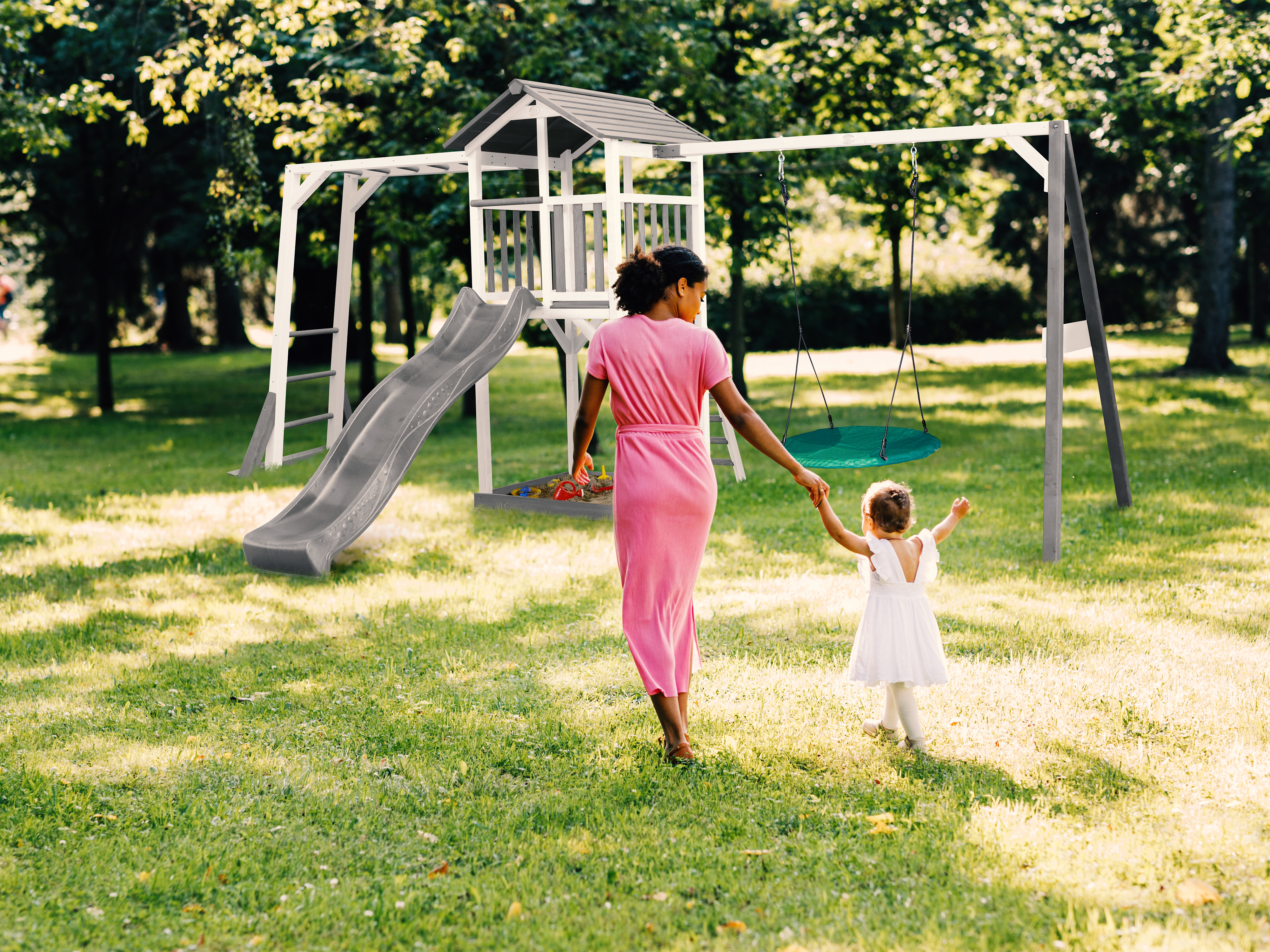 Via de trap kunnen ze omhoog de toren in klimmen. Vanaf daar hebben ze een prachtig uitzicht over de hele tuin. Tijd om weer naar beneden te gaan? Dan glijden ze snel en gemakkelijk via de lange glijbaan naar beneden. Onder de speeltoren is een zandbak waar ze met z’n allen zandtaartjes kunnen bakken. Als ze meer beweging willen kunnen ze het klimrek opklimmen en slingeren aan de aapstaven. Wie is het snelst aan de overkant? Naast het uitzicht vanaf de toren kunnen ze heerlijk genieten van hun vrijheid als ze aan het schommelen zijn. Gelukkig hoeven ze op deze nestschommel niet alleen te zwaaien, maar kan het met één of meerdere vriendjes of vriendinnetjes tegelijk. De combinatie van het wit/grijze hout geeft deze speeltoren een zomers uiterlijk die iedere tuin laat stralen. De Beach Tower Speeltoren heeft een platformhoogte van 117,5 cm en is uitgevoerd met een grote glijbaan van 228 cm lang. De schommel kan zowel links als rechts aan de speeltoren worden bevestigd.