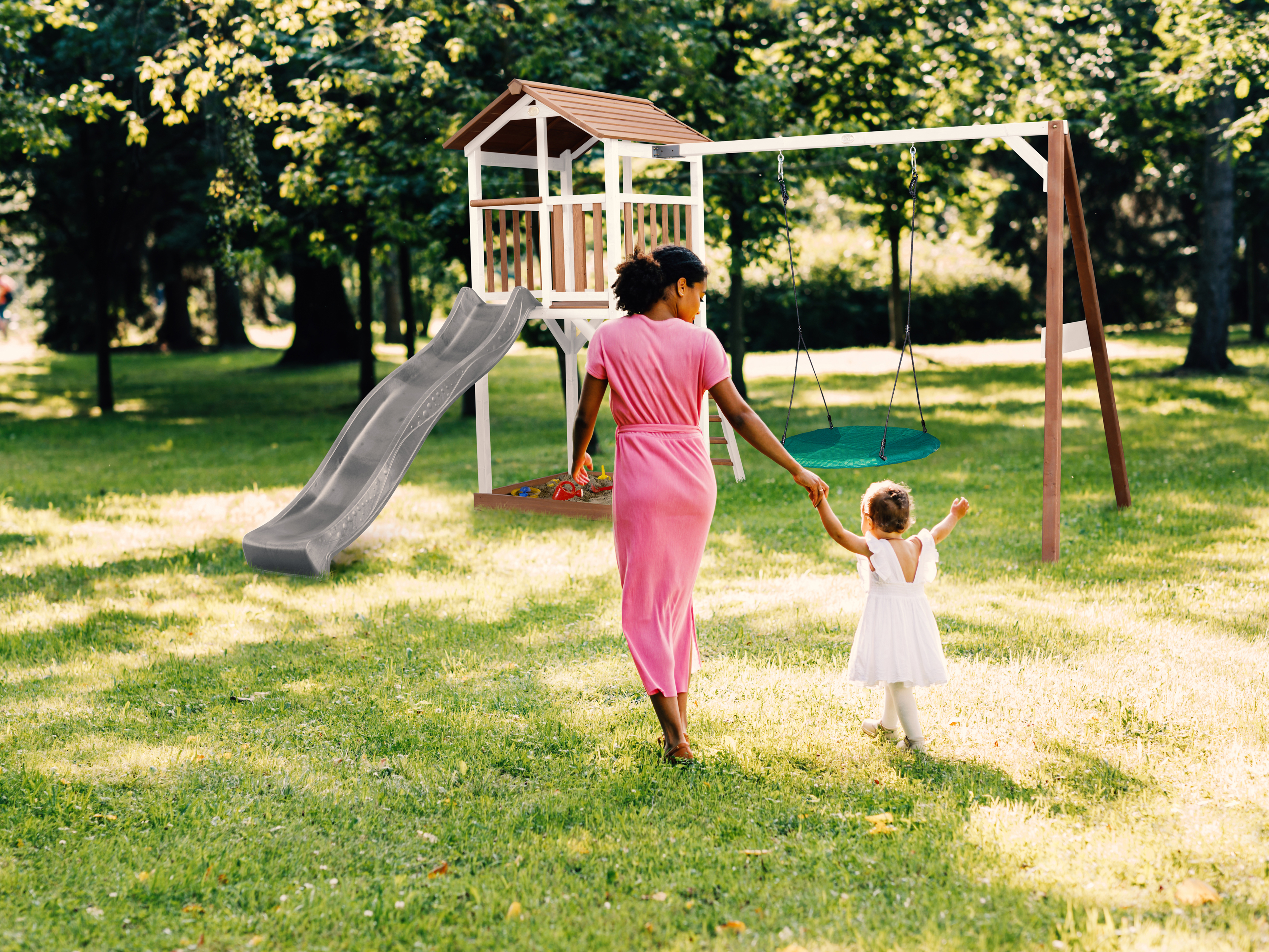 Via de trap kunnen ze omhoog de toren in klimmen. Vanaf daar hebben ze een prachtig uitzicht over de hele tuin. Tijd om weer naar beneden te gaan? Dan glijden ze snel en gemakkelijk via de lange glijbaan naar beneden. Onder de speeltoren is een zandbak waar ze met z'n allen zandtaartjes kunnen bakken. Naast het uitzicht vanaf de toren kunnen ze heerlijk genieten van hun vrijheid als ze aan het schommelen zijn. Gelukkig hoeven ze op deze nestschommel niet alleen te zwaaien, maar kan het met één of meerdere vriendjes of vriendinnetjes tegelijk. De combinatie van het wit/bruine hout geeft deze speeltoren een zomers uiterlijk die iedere tuin laat stralen. De Beach Tower Speeltoren heeft een platformhoogte van 117,5 cm en is uitgevoerd met een grote glijbaan van 228 cm lang. De schommel kan zowel links als rechts aan de speeltoren worden bevestigd.