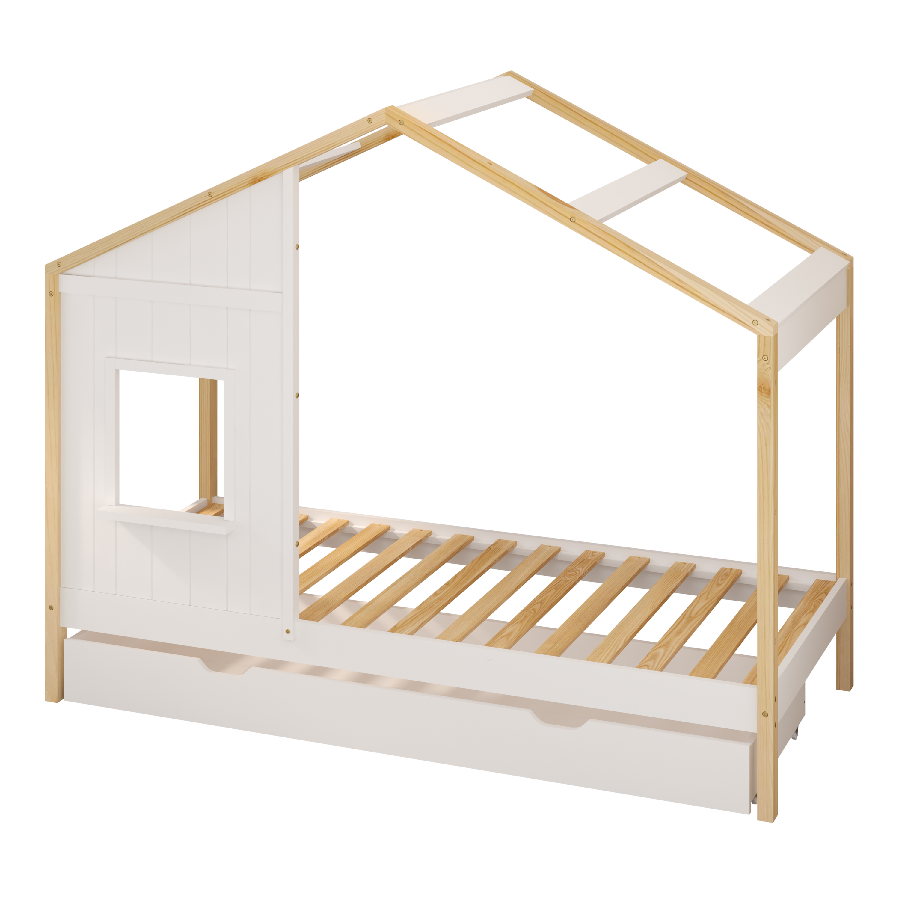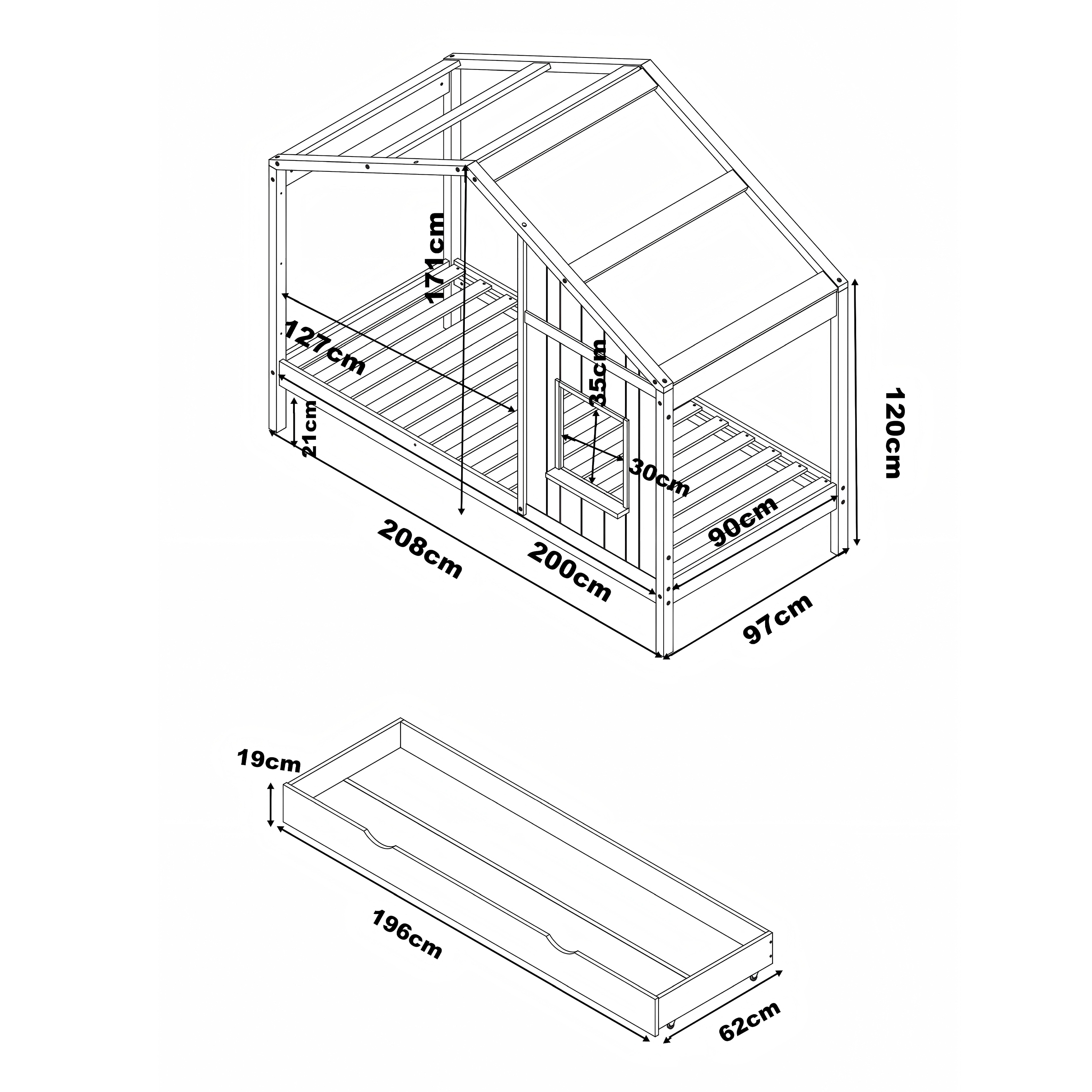 Het open frame en de vaste wand met raam geven het bed een gezellige uitstraling én extra geborgenheid. Het raam nodigt uit tot spel en fantasie, terwijl de wand meteen fungeert als stevige uitvalbeveiliging. Onder het bed vind je een ruime opberglade van MDF met de afmetingen 196 x 62 x 19 cm – ideaal voor speelgoed, beddengoed of seizoenskleding. Zo blijft de kamer altijd netjes zonder dat je extra kasten nodig hebt.