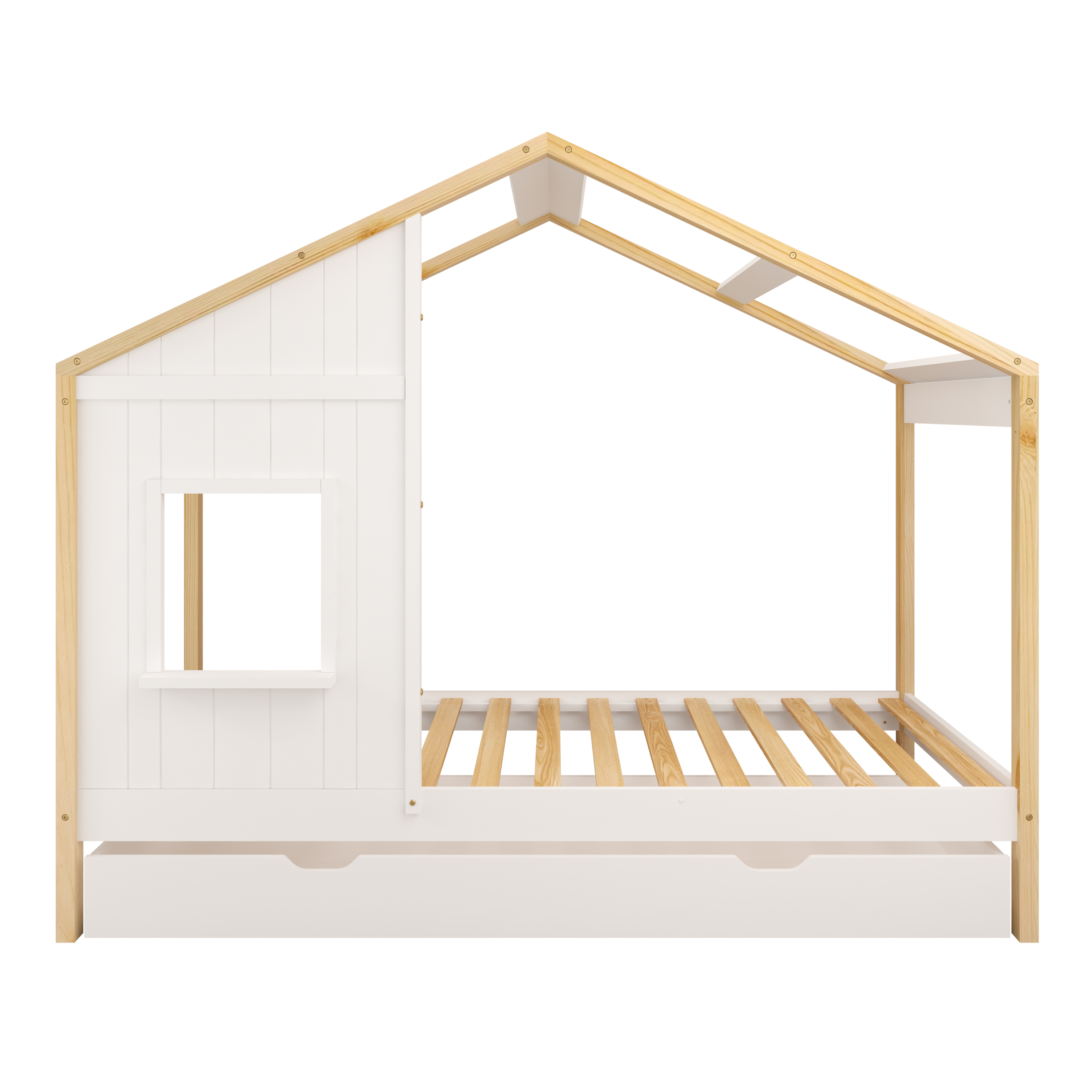 - Kinderbed in huisvorm met vaste wand en raam als uitvalbeveiliging.