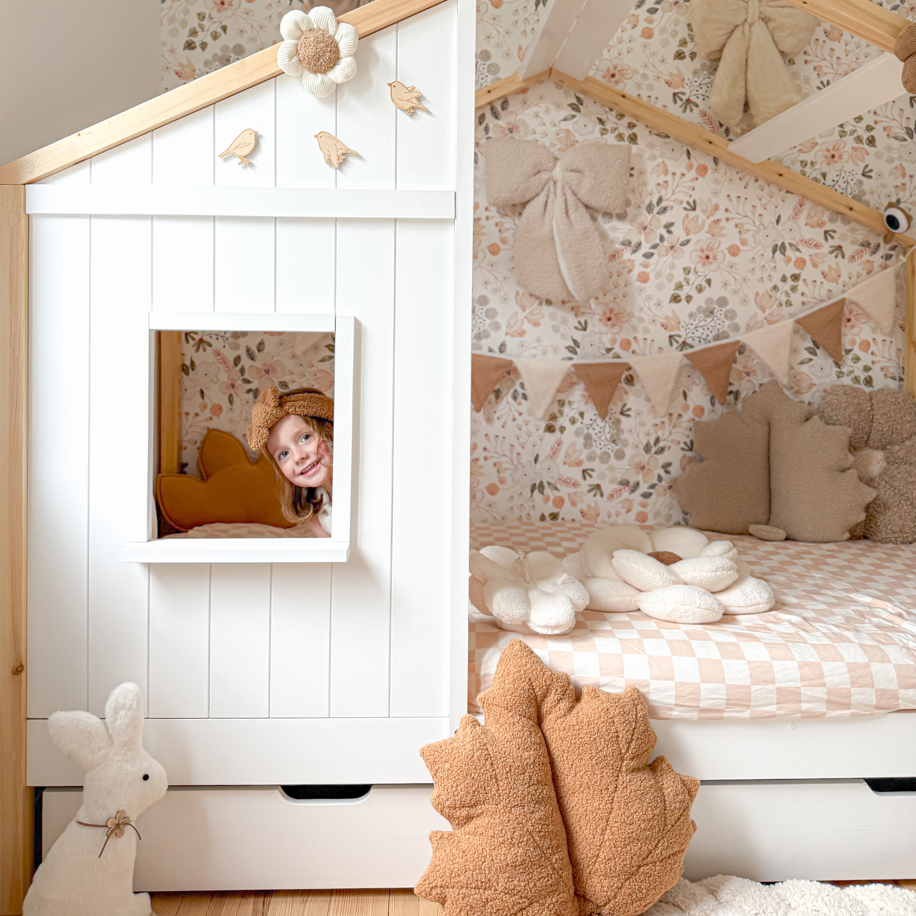 Het Sunny Beau Bedhuisje met opberglade is dé plek waar slapen, spelen én opbergen samenkomen. Met zijn charmante huisvorm en speelse wand met raam voelt het alsof je kindje een eigen, knusse kamer in de kamer heeft. Overdag een creatieve speelplek, ’s avonds een veilige en vertrouwde slaapplek.