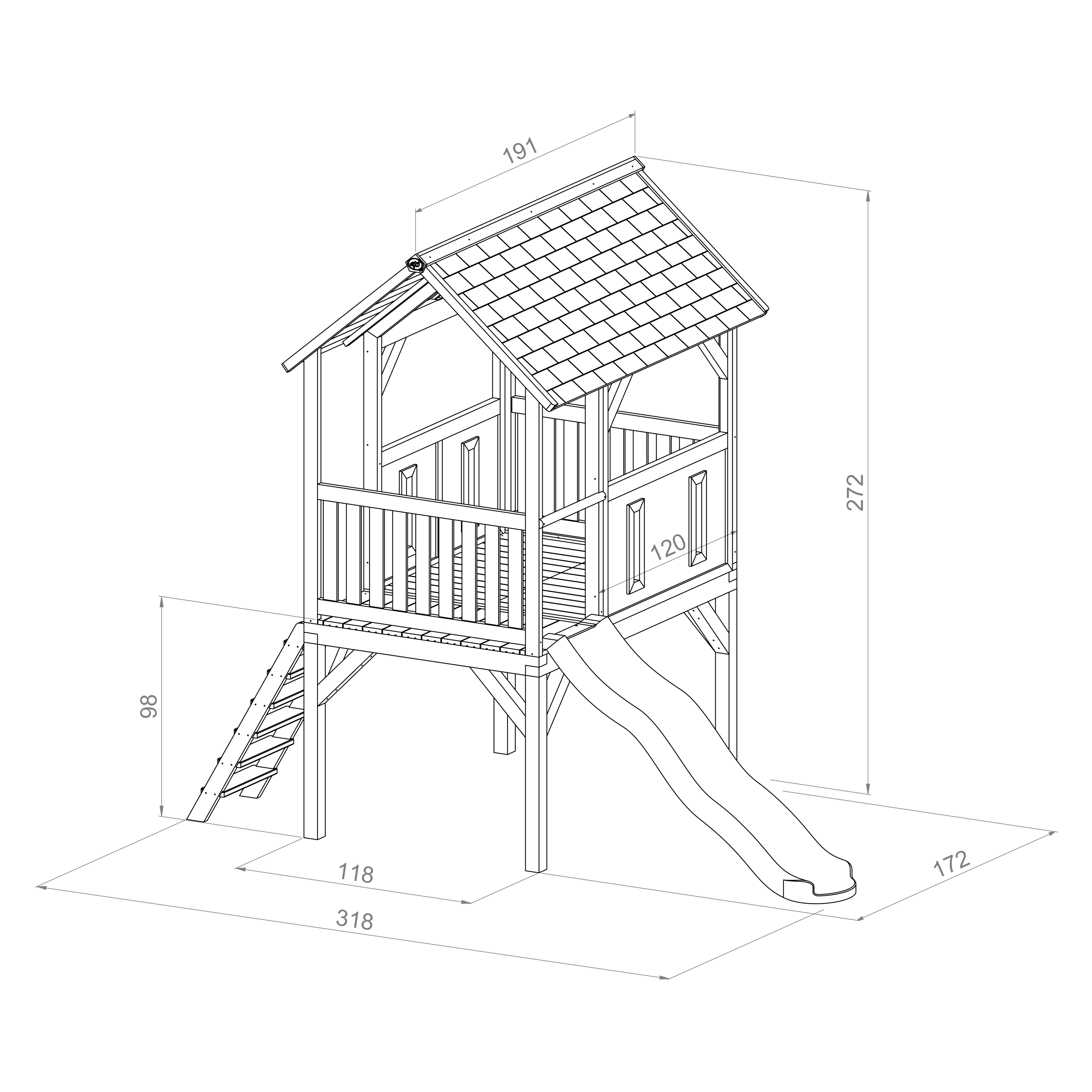 Speeltoren Bogo heeft een platformhoogte van 98 cm en een totale hoogte van 272 cm. De speeltoren is 191 cm lang en 318 cm breed. Met een binnenmaat van 115 x 113 cm en een nokhoogte van ca. 166 cm is Bogo een middelgroot houten speeltoren.