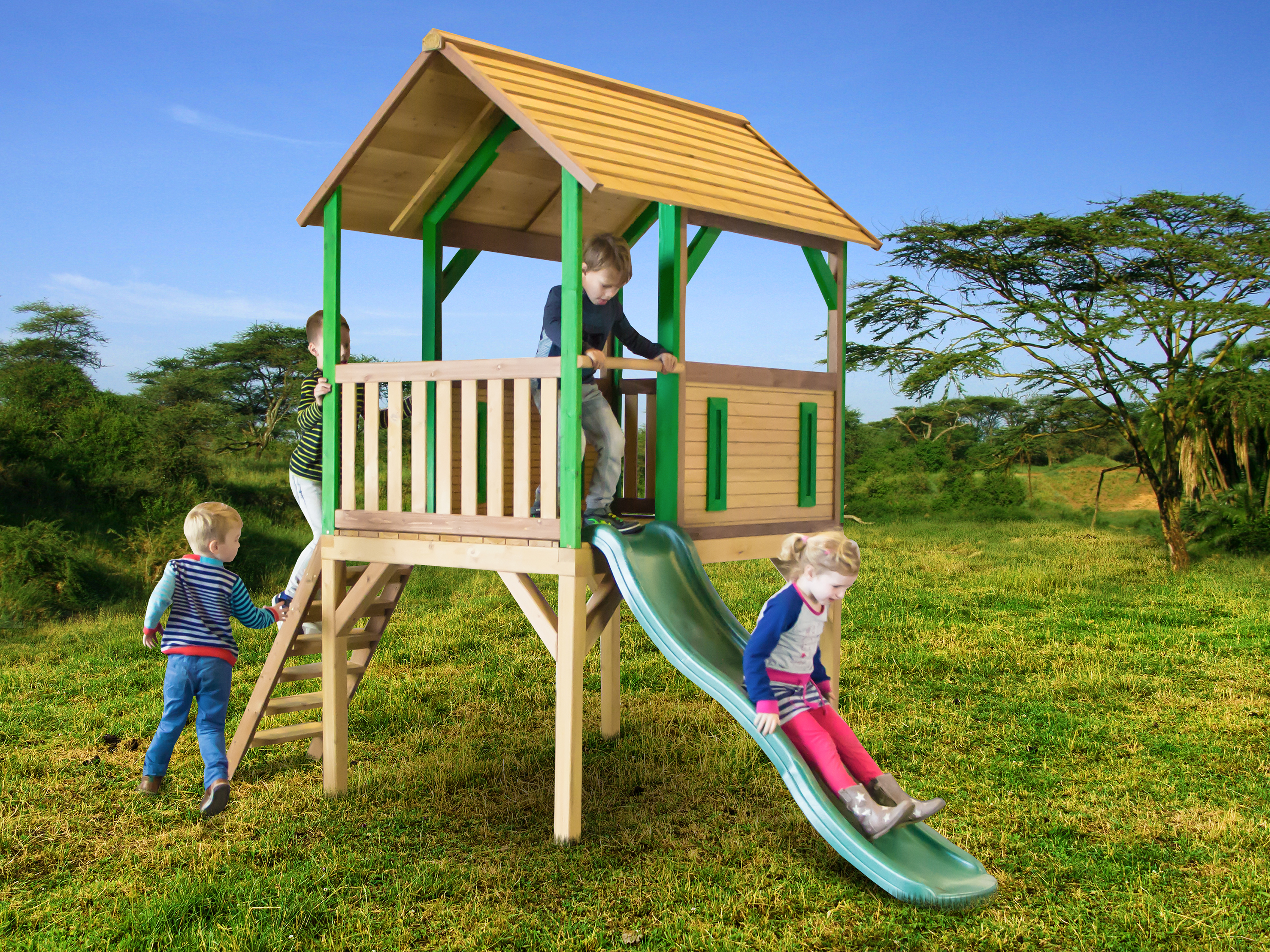 Met de AXI Bogo Speeltoren Bruin/groen - Groene Glijbaan zullen kinderen het heerlijk vinden om met vriendjes of vriendinnetjes in het houten AXI speelhuisje te spelen. Klimmen op de trap, over de veranda en snel weer naar beneden van de glijbaan. Hoe vaker ze naar beneden glijden, hoe leuker ze het vinden! Speeltoren Bogo heeft een mooi open concept met genoeg ruimte voor meerdere kinderen. Aan de zijkanten kunnen ze door de openingen kijken om te zien wat er buiten gebeurt als ze verstoppertje spelen. Deze houten Speeltoren zal je achtertuin onmiddellijk omtoveren in een prachtige speeltuin. De bruin/groene kleuren zijn herkenbaar als de klassieke AXI producten welke al jaren enorm succesvol zijn voor jong en oud. Plaats een AXI ZidZed (niet inbegrepen) of een andere leuke picknickset in de speeltoren, en je kinderen hebben een heerlijk plekje om een theekransje of spelletjesmiddag te houden. Bogo Speeltoren heeft een platformhoogte van 98 cm en is uitgevoerd met een middelgrote glijbaan van 175 cm lang. Het trapje en glijbaan kunnen zowel links als rechts aan de speeltoren worden bevestigd.