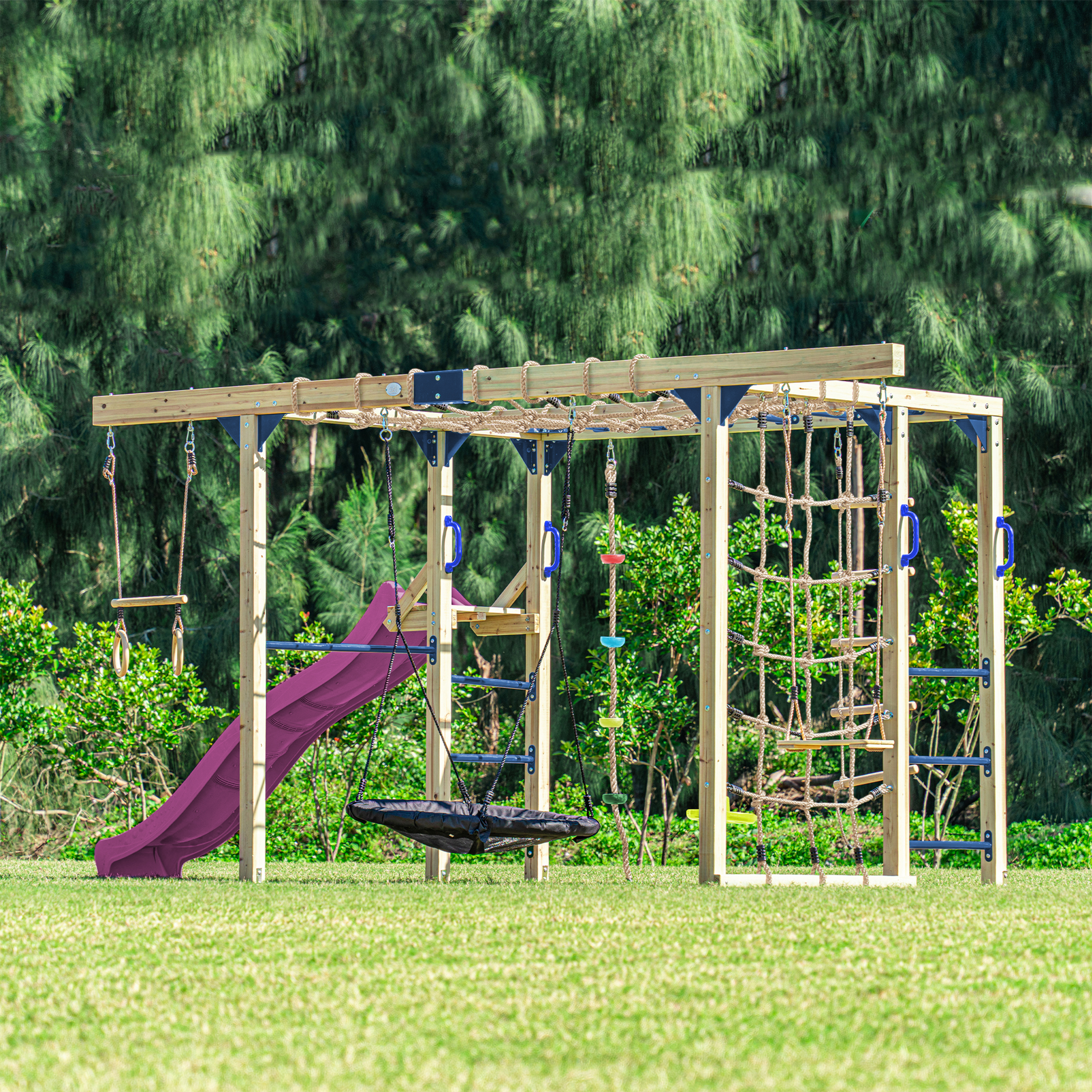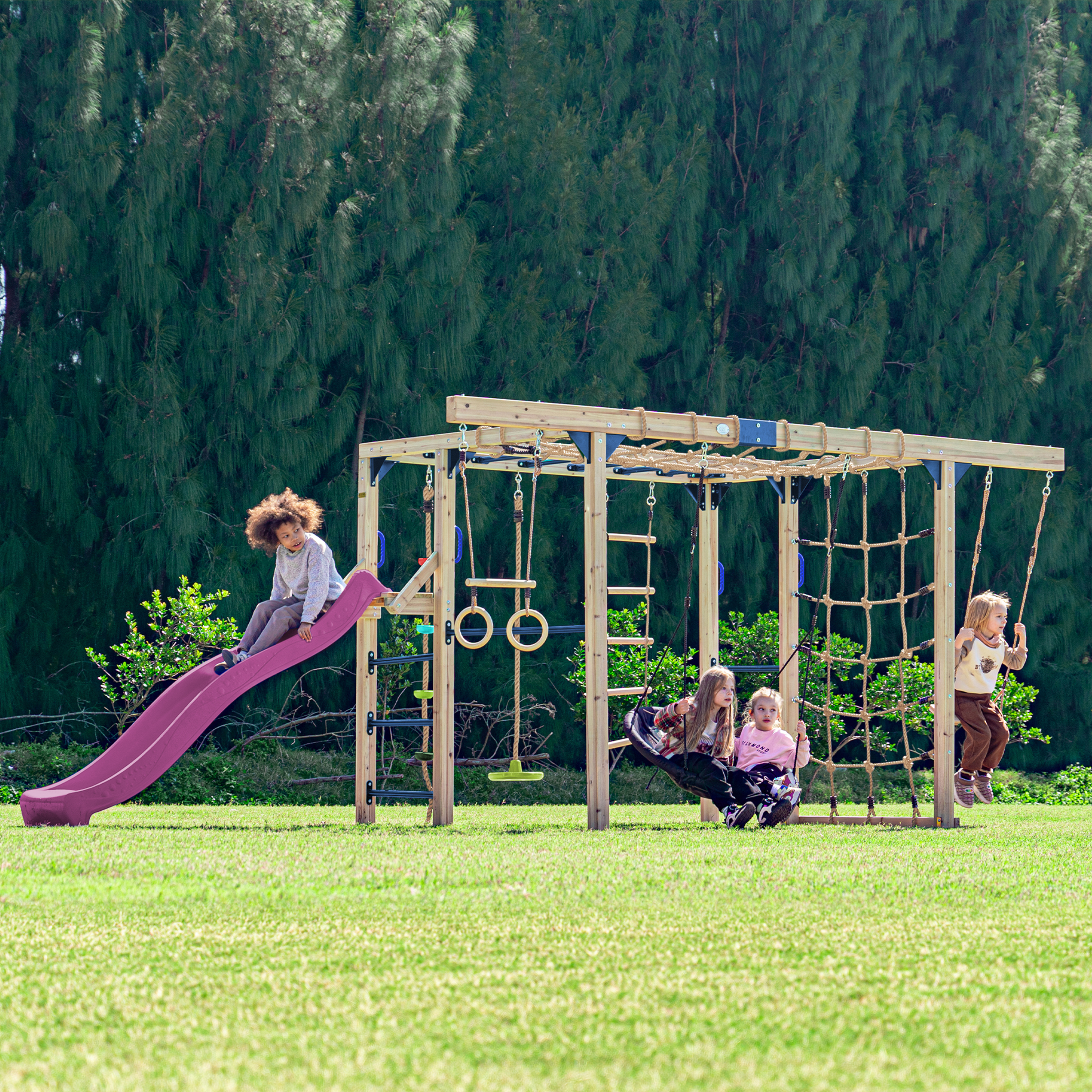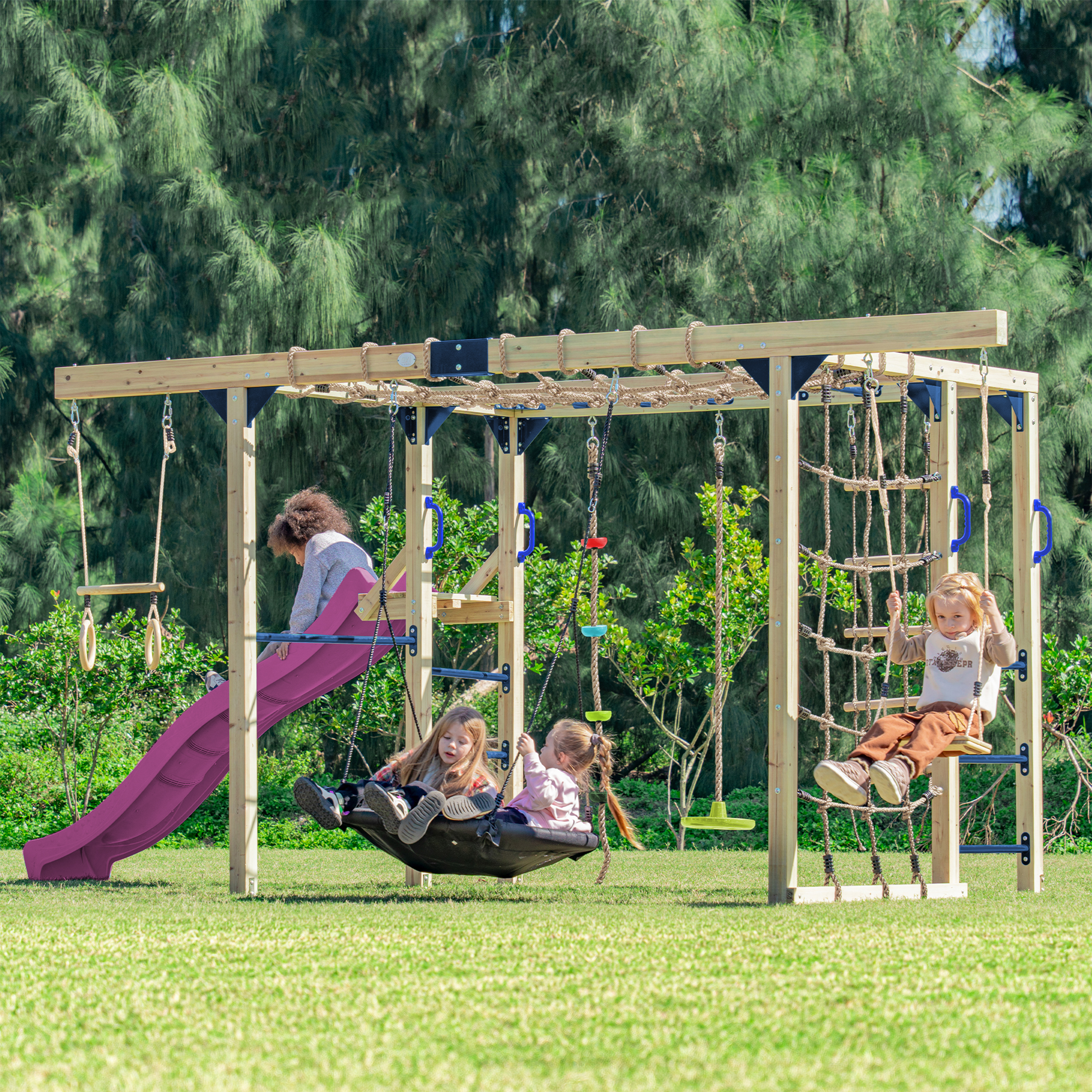 • Met schotelschommel, trapeze en duikelstang voor nog meer speelplezier.