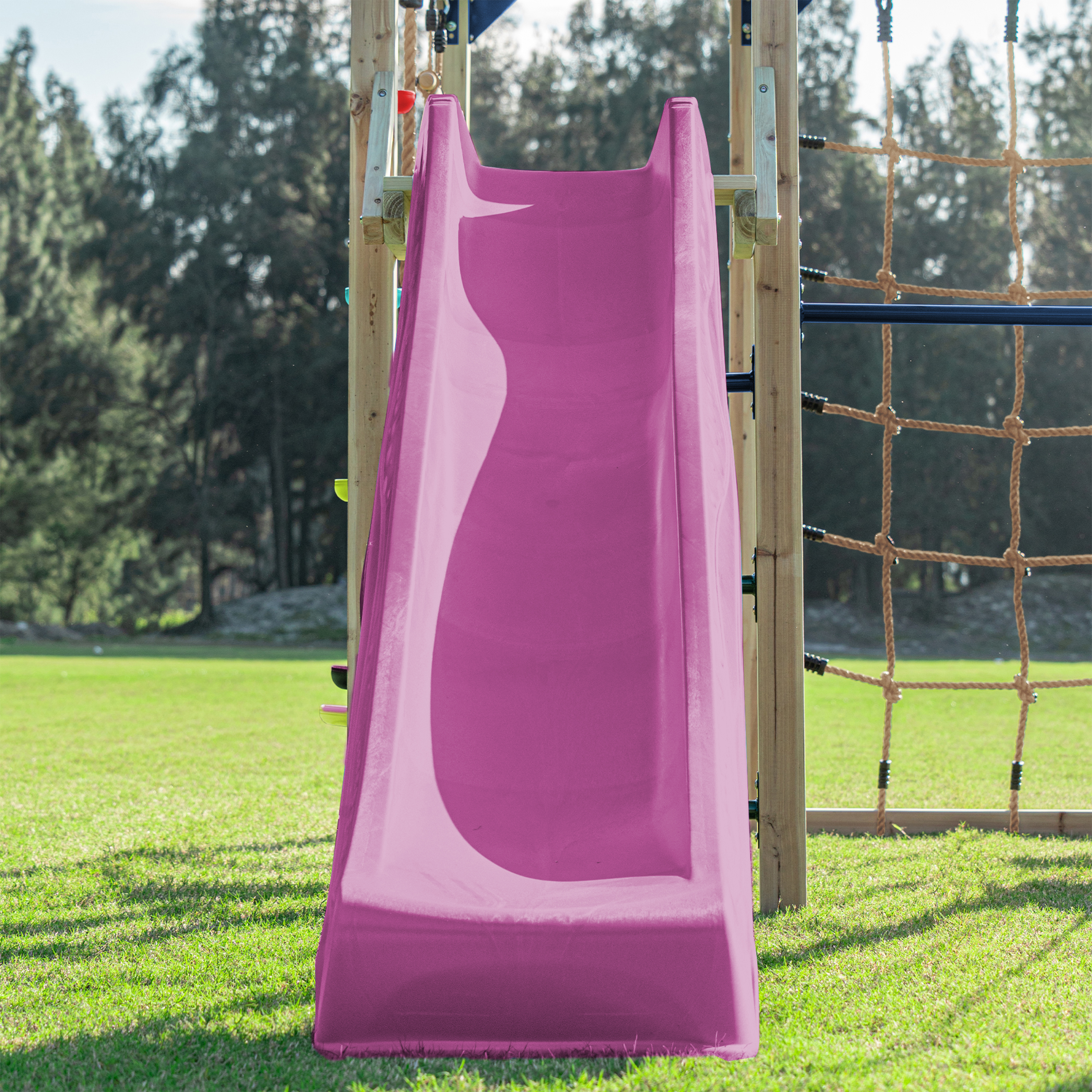 De glijbaan van 220 cm met een wateraansluiting biedt een snelle en leuke afdaling, terwijl de verschillende klimnetten en de ladders zorgen voor uitdagende klimmogelijkheden. Dankzij de Monkey Bars van ijzer kunnen kinderen als echte apen van de ene naar de andere kant slingeren en hun kracht en coördinatie trainen.