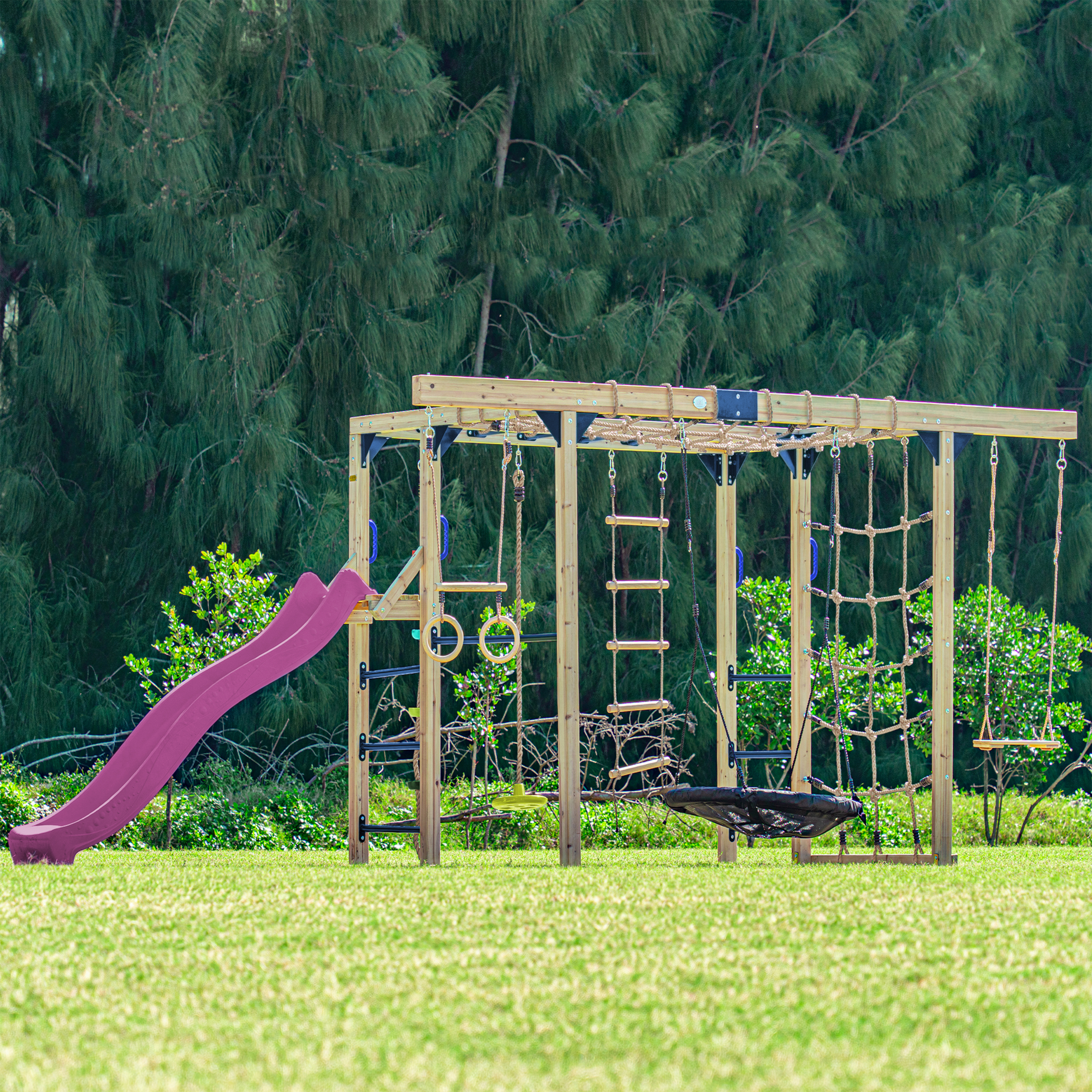 • Monkey Bars, knoopladder, touwladder en klimnetten bieden extra mogelijkheden voor echte klauteraars.