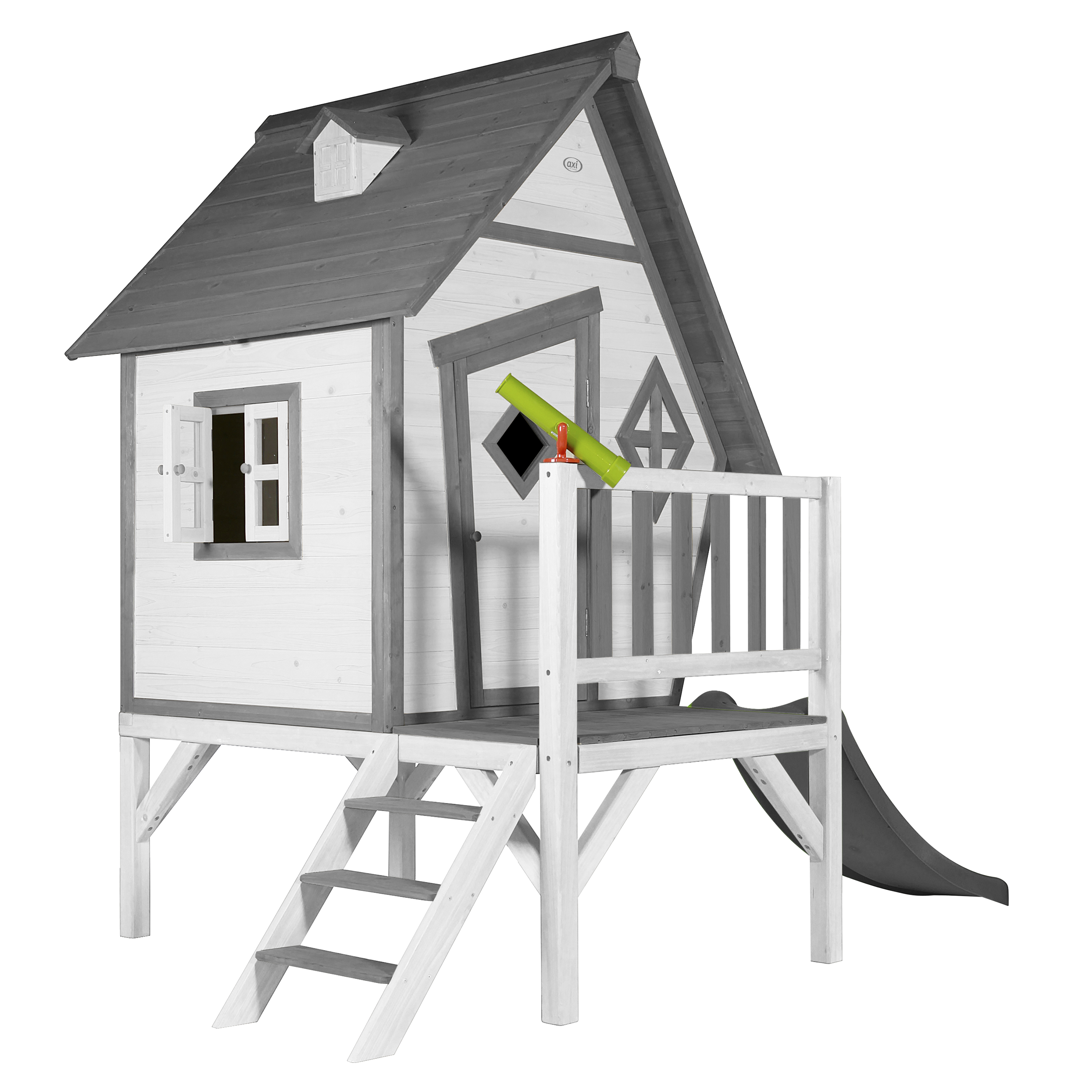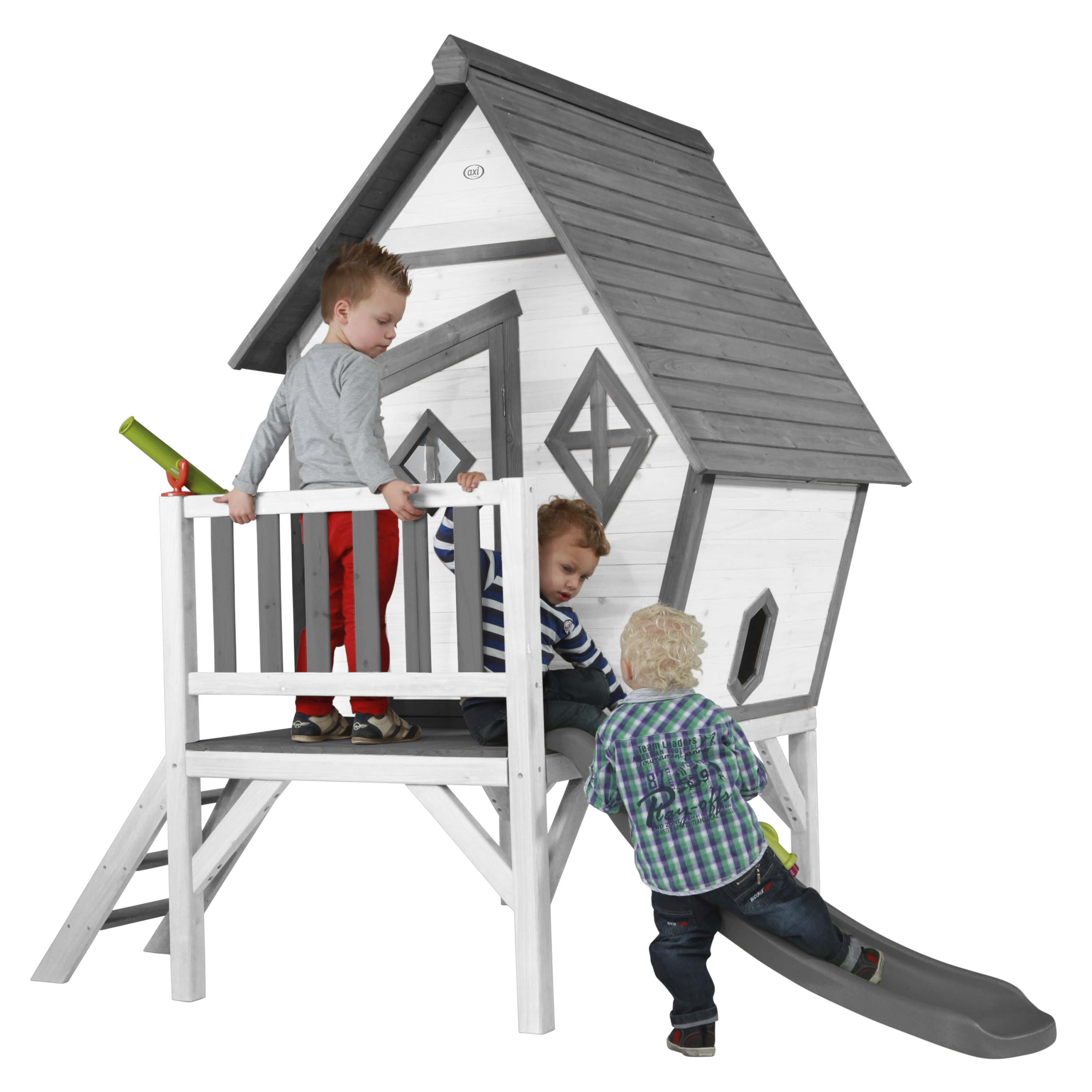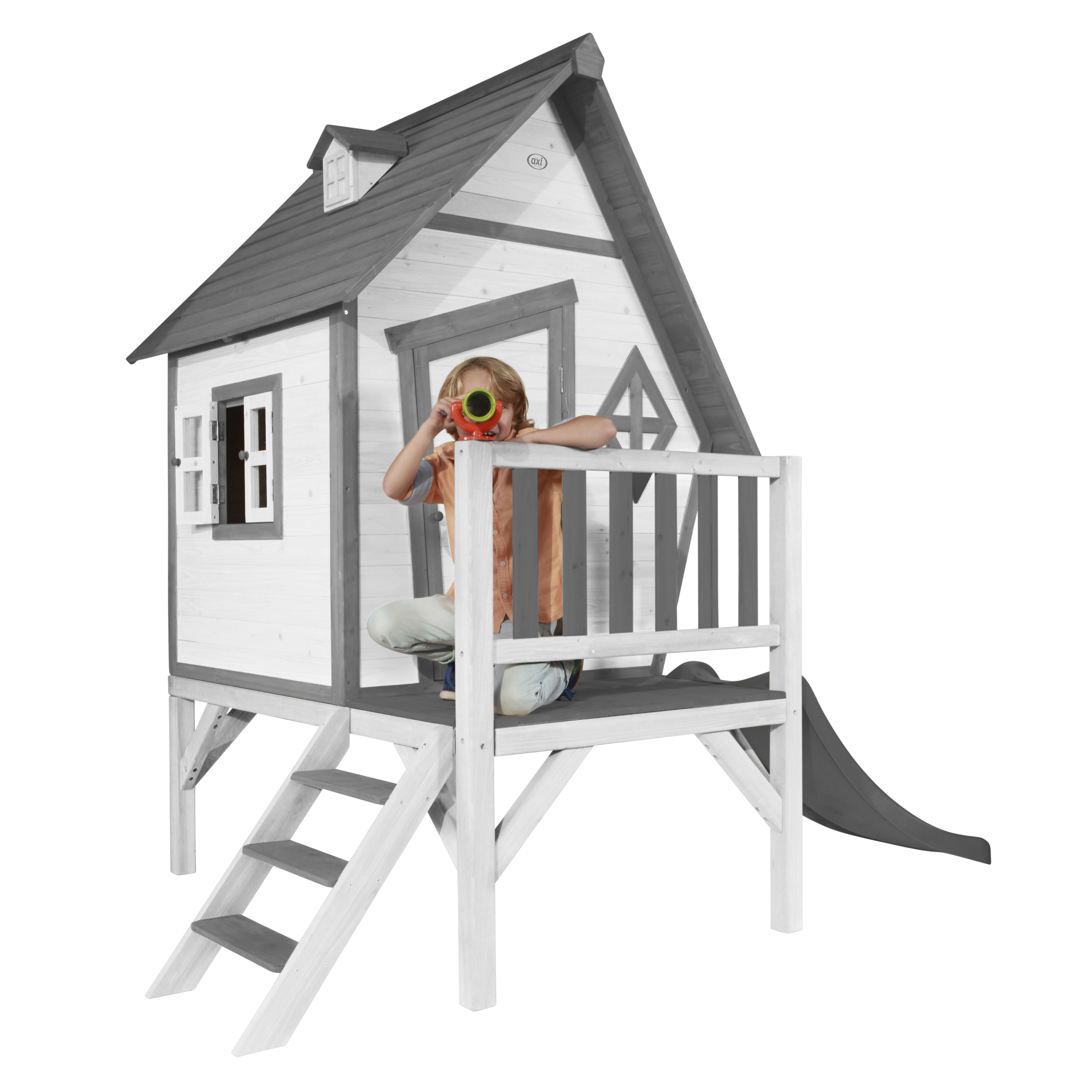 Kinderen vinden het heerlijk om met vriendjes of vriendinnetjes in het houten AXI Cabin XL Speelhuis Grijs/wit - Grijze Glijbaan. Klimmen op de trap, over de veranda en snel weer naar beneden van de glijbaan. Hoe vaker ze naar beneden glijden, hoe leuker ze het vinden! Door de scheve raampjes en deur ziet speelhuisje er zo knus en gezellig uit, dat het wel uit een sprookje lijkt te komen. Onderin het huisje zit zelfs een klein spiekraampje. Hierdoor kunnen je kinderen de omgeving stiekem in de gaten houden. Cabin XL is een veelzijdig houten speelhuis uit de Beach serie van AXI. Het speelhuisje is uitgevoerd in moderne grijs/witte kleuren welke perfect in iedere hedendaagse tuin passen. Cabin XL speelhuis heeft een platformhoogte van 57 cm en is uitgevoerd met een kleine glijbaan van 118 cm lang. De deur heeft een klein raampje zodat kinderen kunnen zien wie er voor de deur staat zonder deze te openen. Bij mooi weer kunnen de kinderen eenvoudig het raam openen en genieten van alles wat er buiten gebeurt. Laat ze snel de ramen dicht doen als het gaat regenen, zo zitten ze beschut en kunnen ze heerlijk doorspelen!