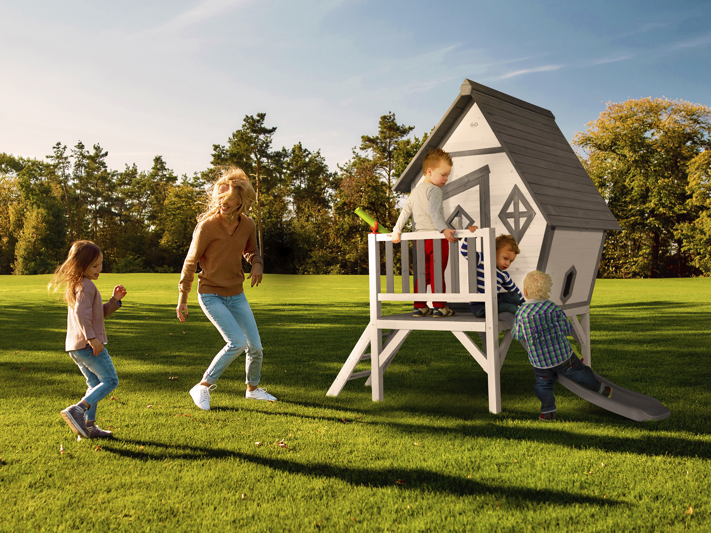 AXI speelhuisjes zijn opgebouwd uit voorgemonteerde (Prefab) panelen, waarbij ook de eventuele ramen en deur(en) zijn voorgemonteerd. De onderdelen zijn veelal voorgeboord waardoor het huisje in een handomdraai opgebouwd is.