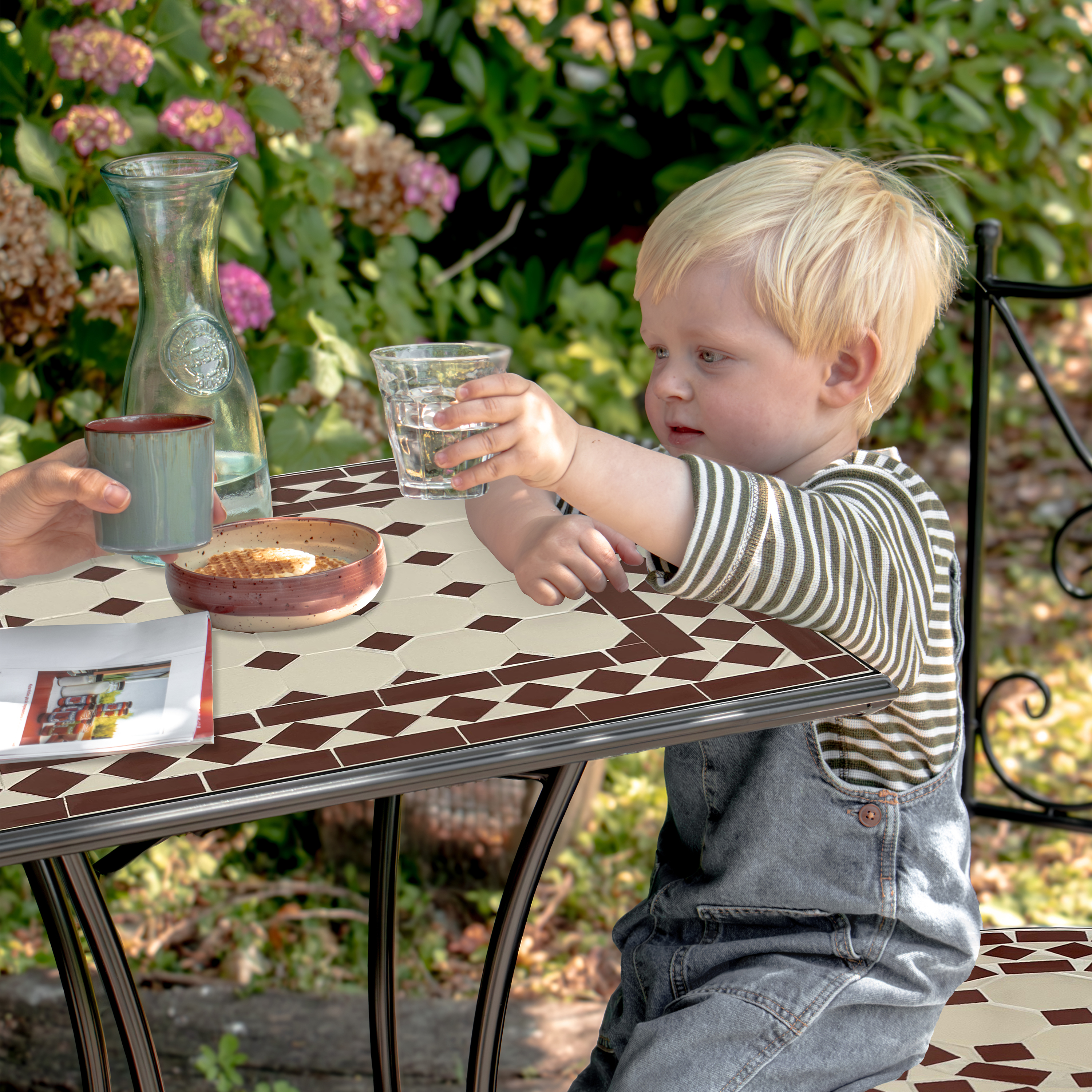 Het gepoedercoate metalen frame is niet alleen stabiel maar ook duurzaam. Het tafelblad en de stoelen zijn met de hand ingelegd met keramische tegels in een mozaïek look. De stoelen hebben een zithoogte van 46 cm en een draagcapaciteit van maximaal 150 kg per stoel. Dankzij de rugleuning in de stoelen biedt deze bistro-set niet alleen stijl maar ook optimaal comfort.