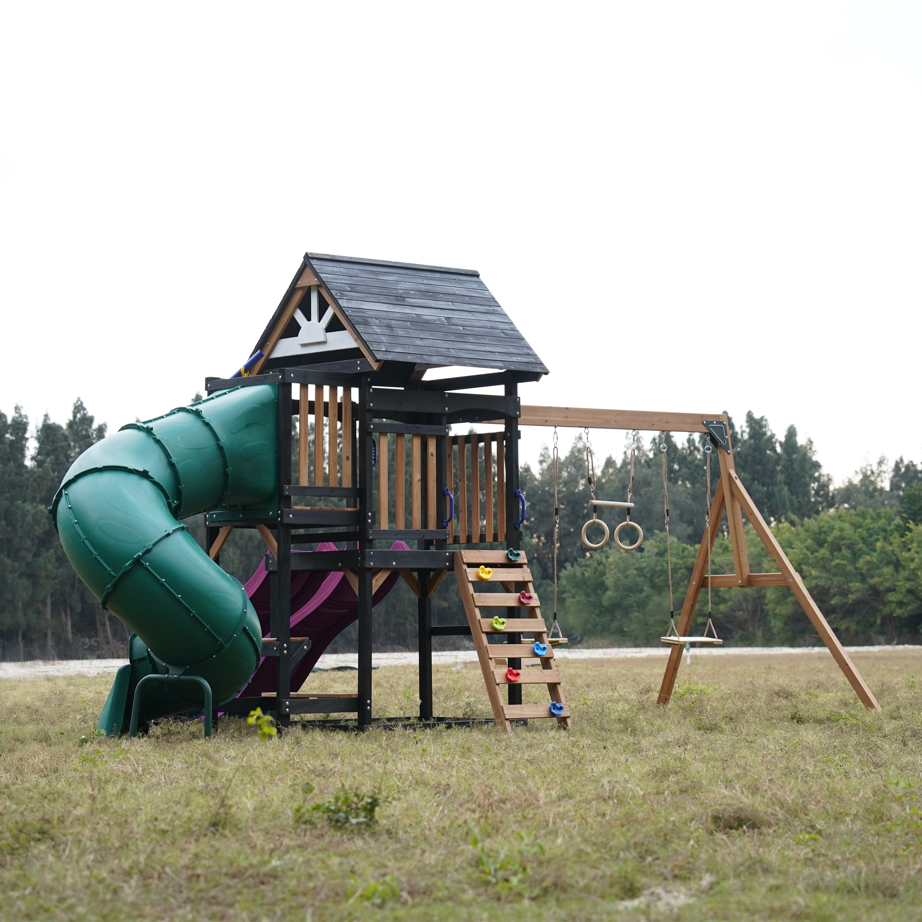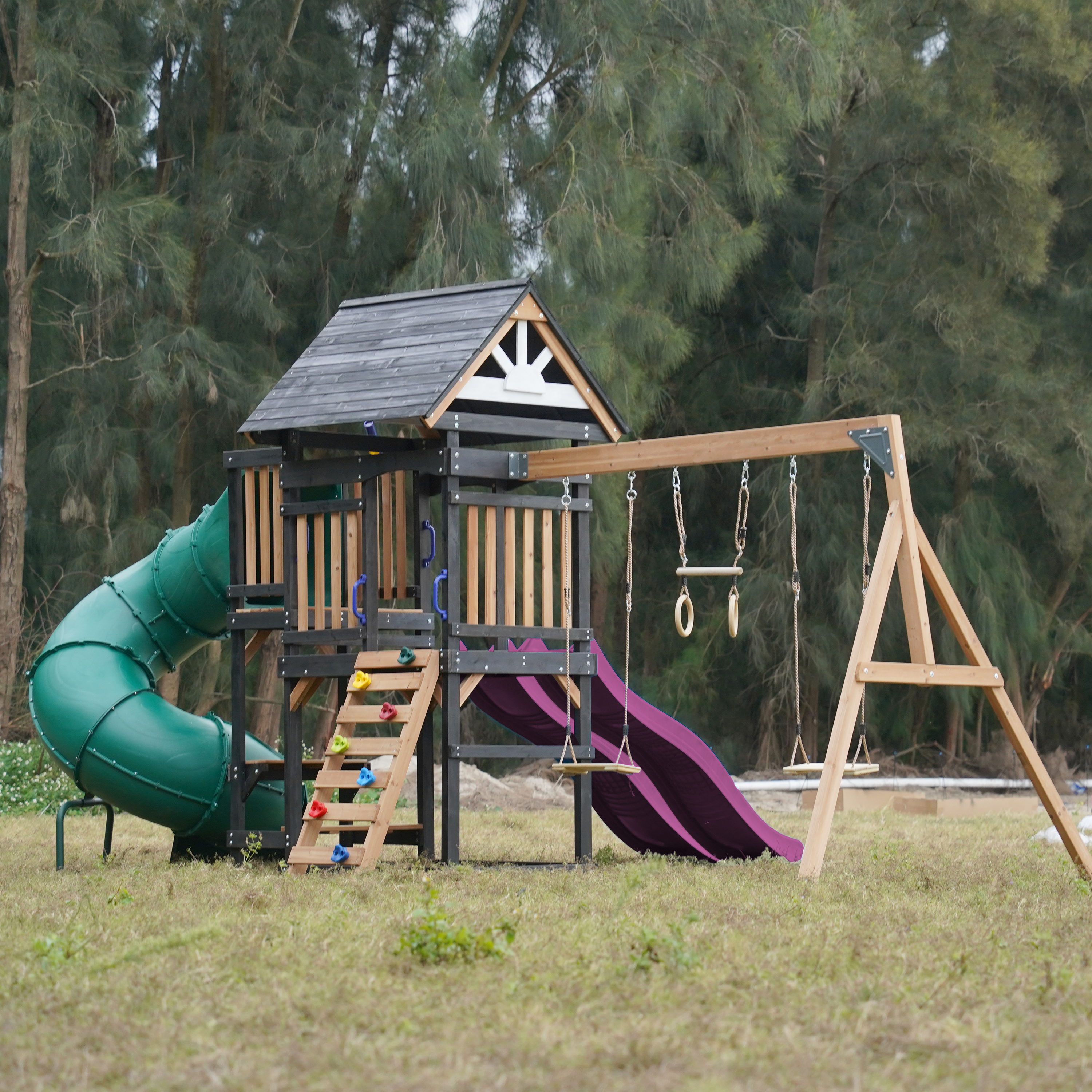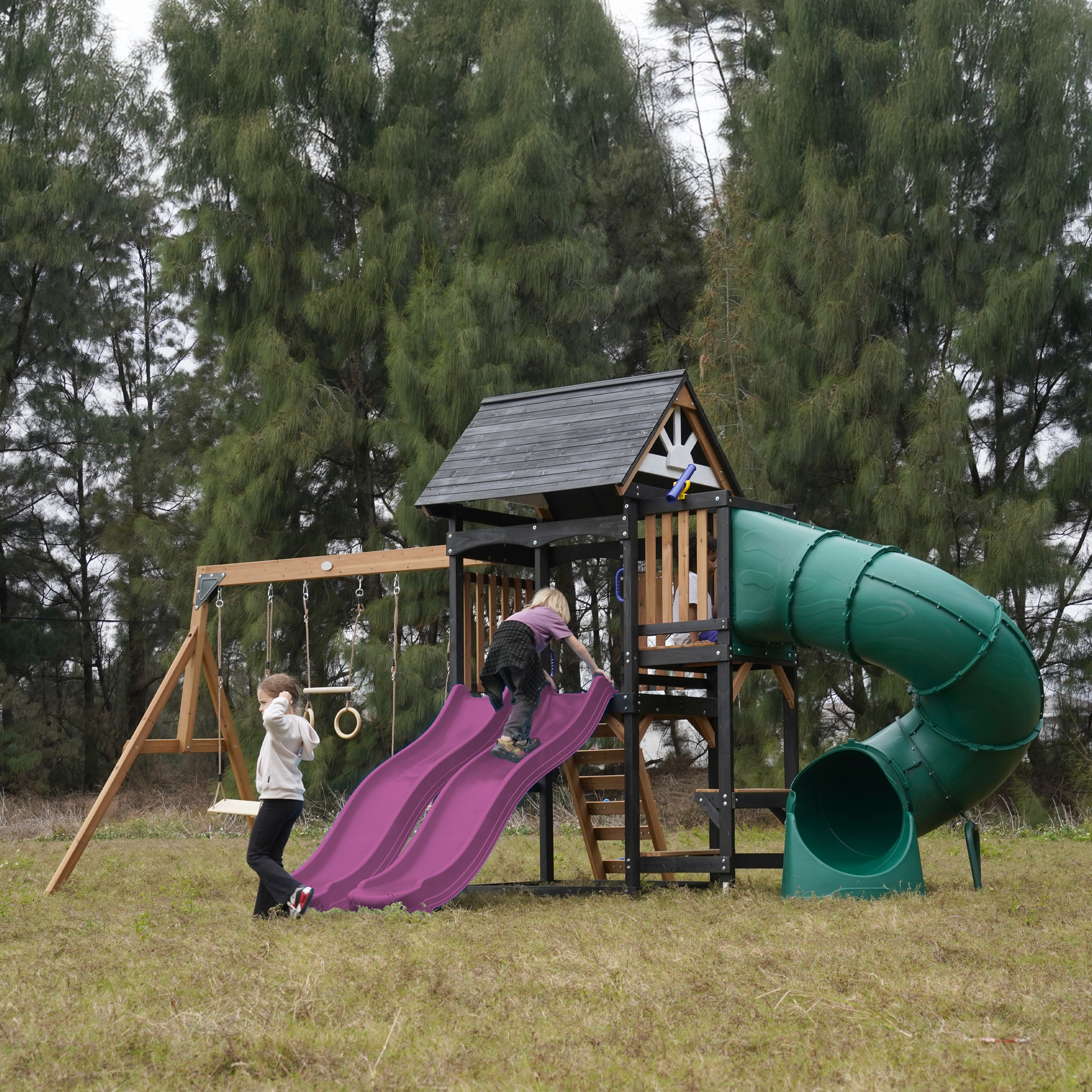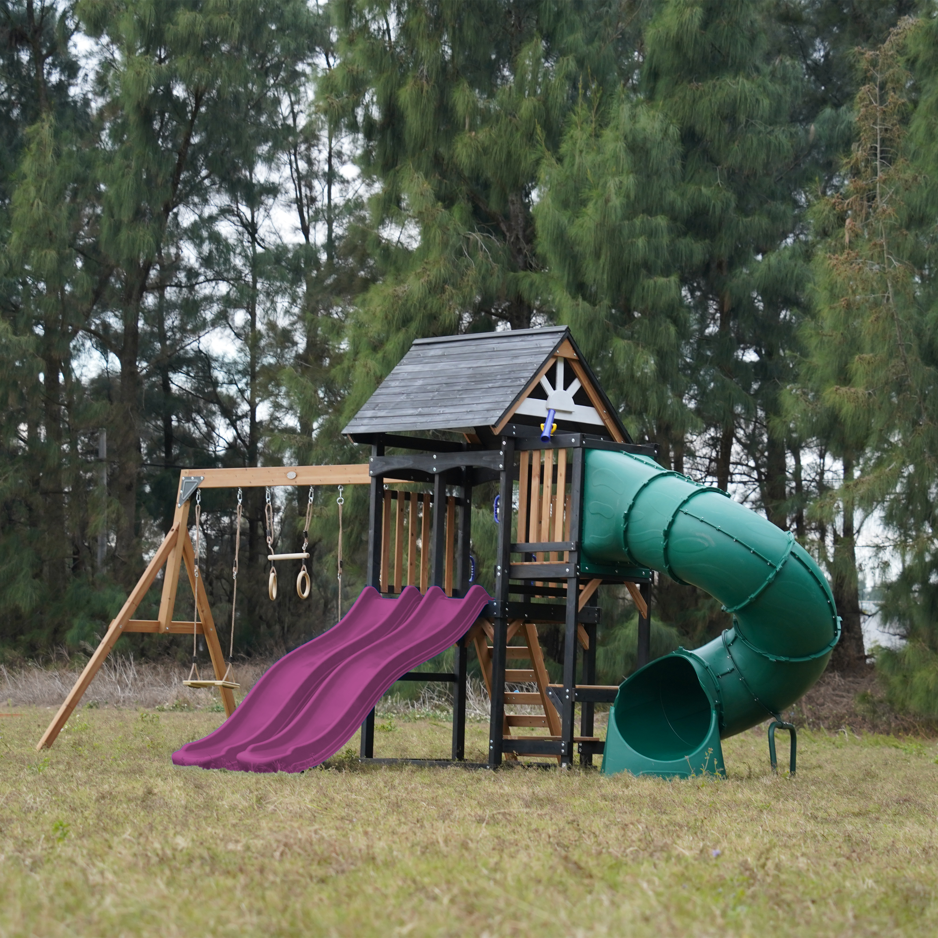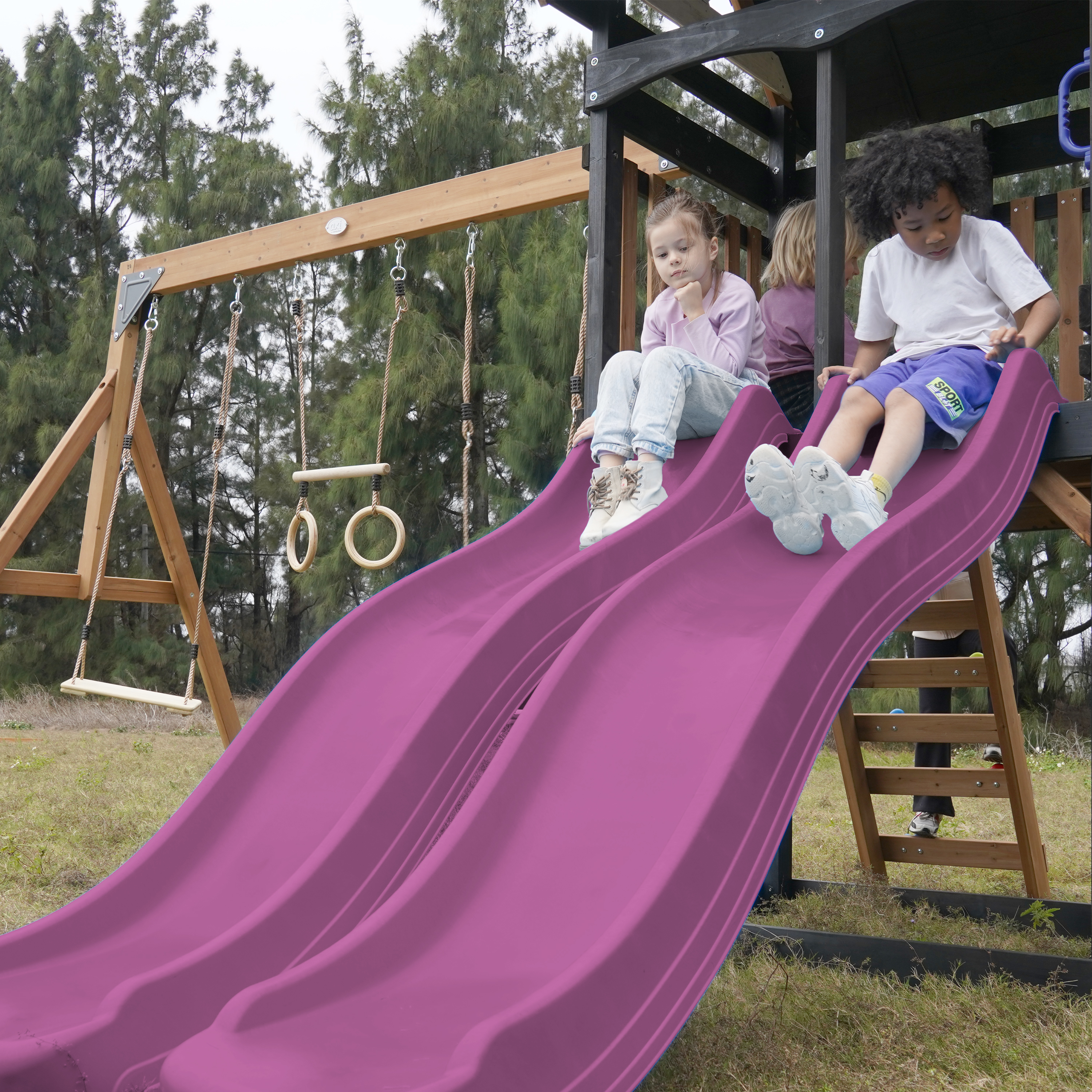 Kinderen klimmen via de klimwand naar het platform en kiezen vervolgens hun favoriete manier om weer naar beneden te gaan. Met twee golvende glijbanen en een spannende buisglijbaan valt er altijd iets nieuws te beleven. De twee golvende glijbanen kunnen zelfs worden aangesloten op een tuinslang, zodat ze op warme dagen veranderen in een extra snelle waterglijbaan.