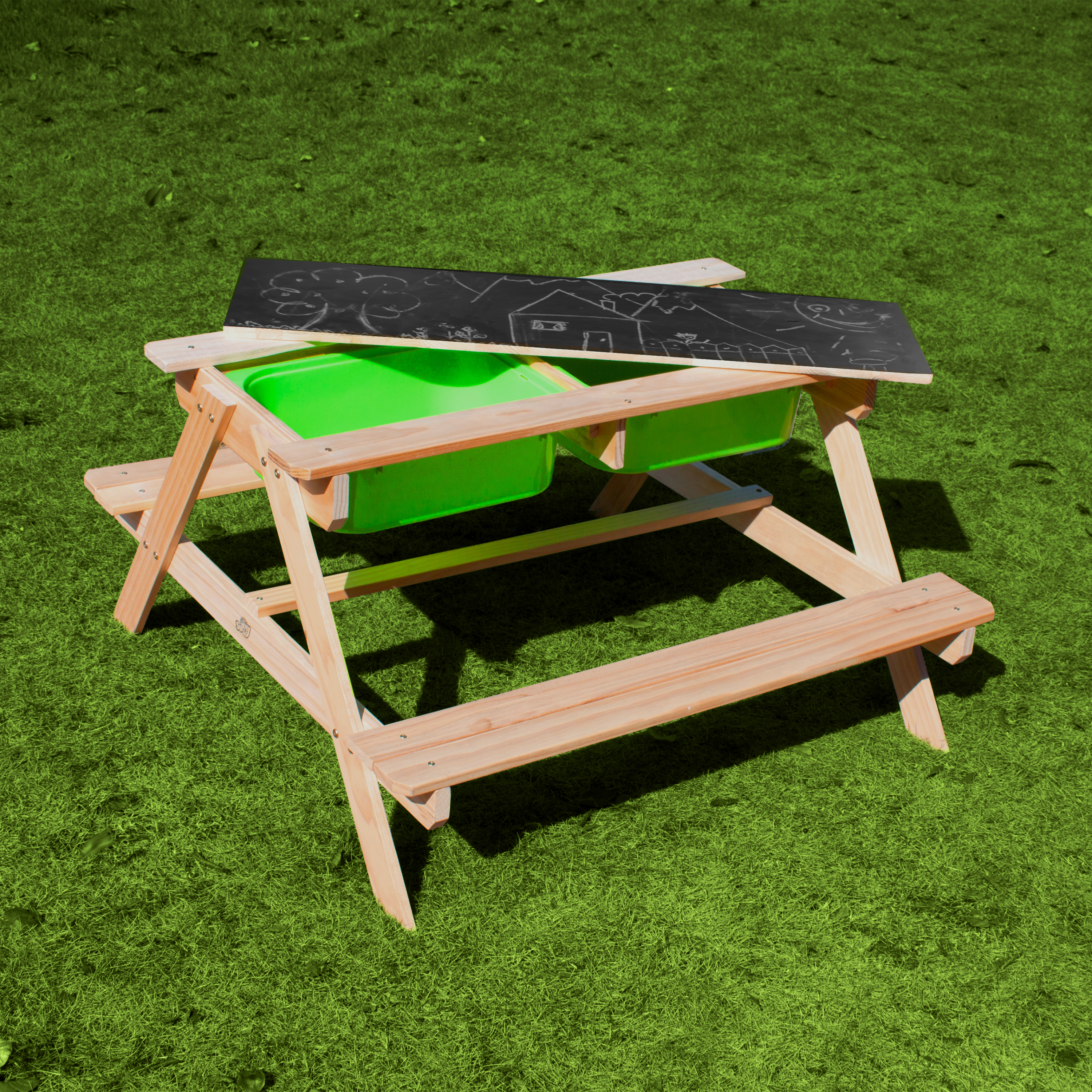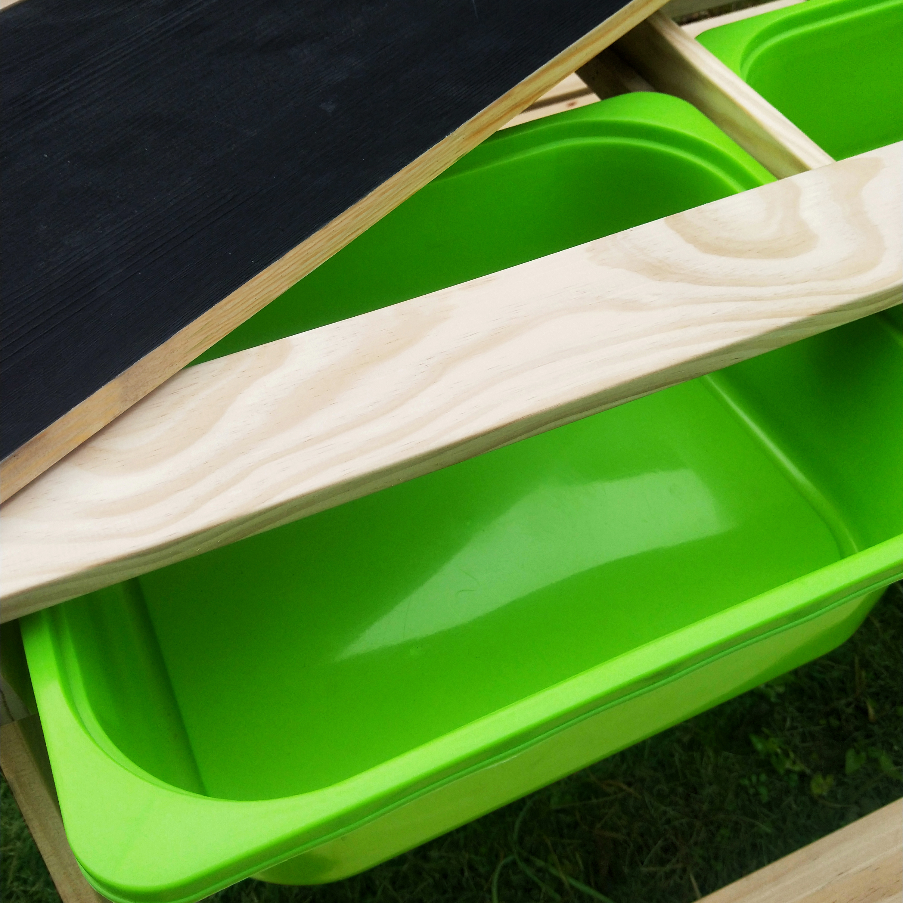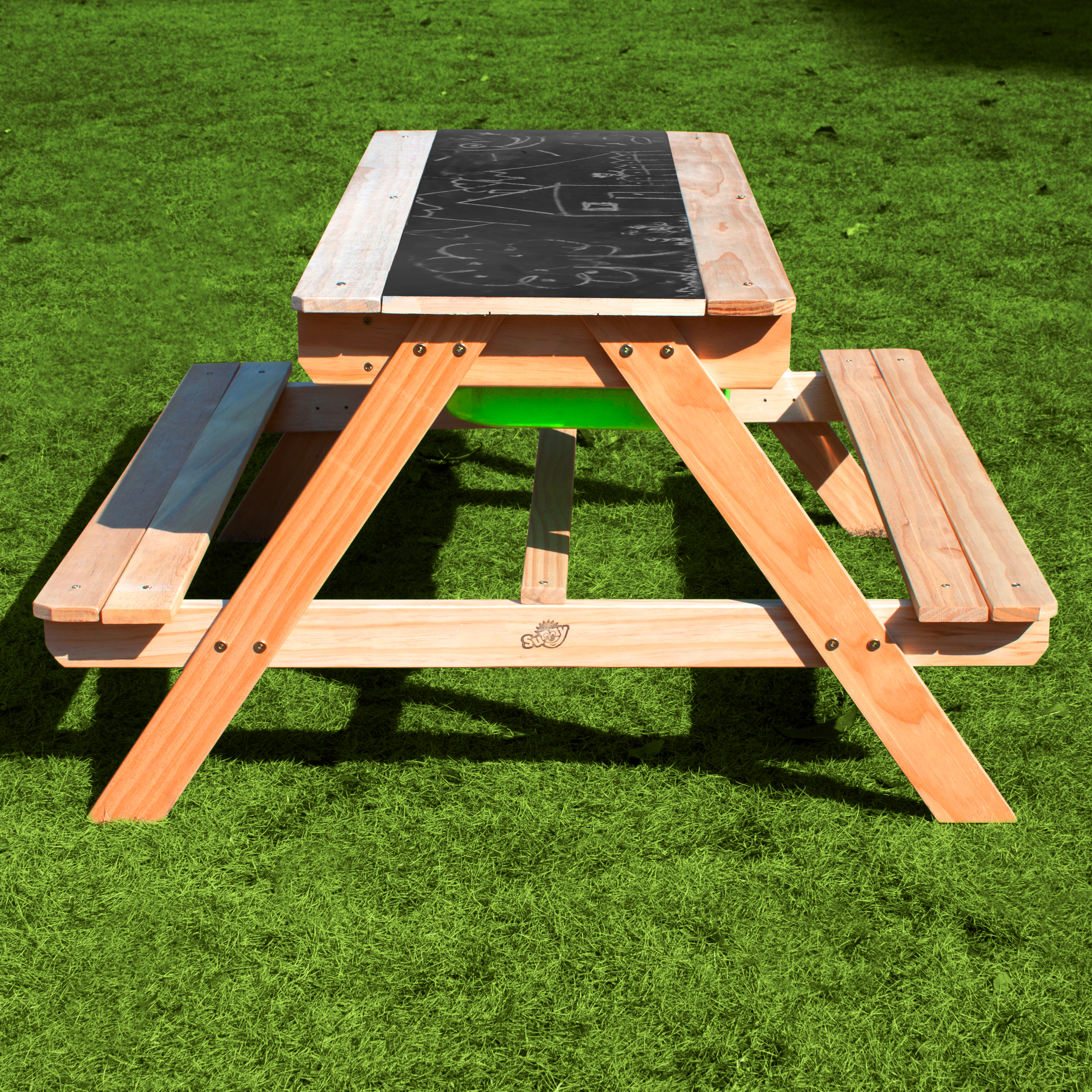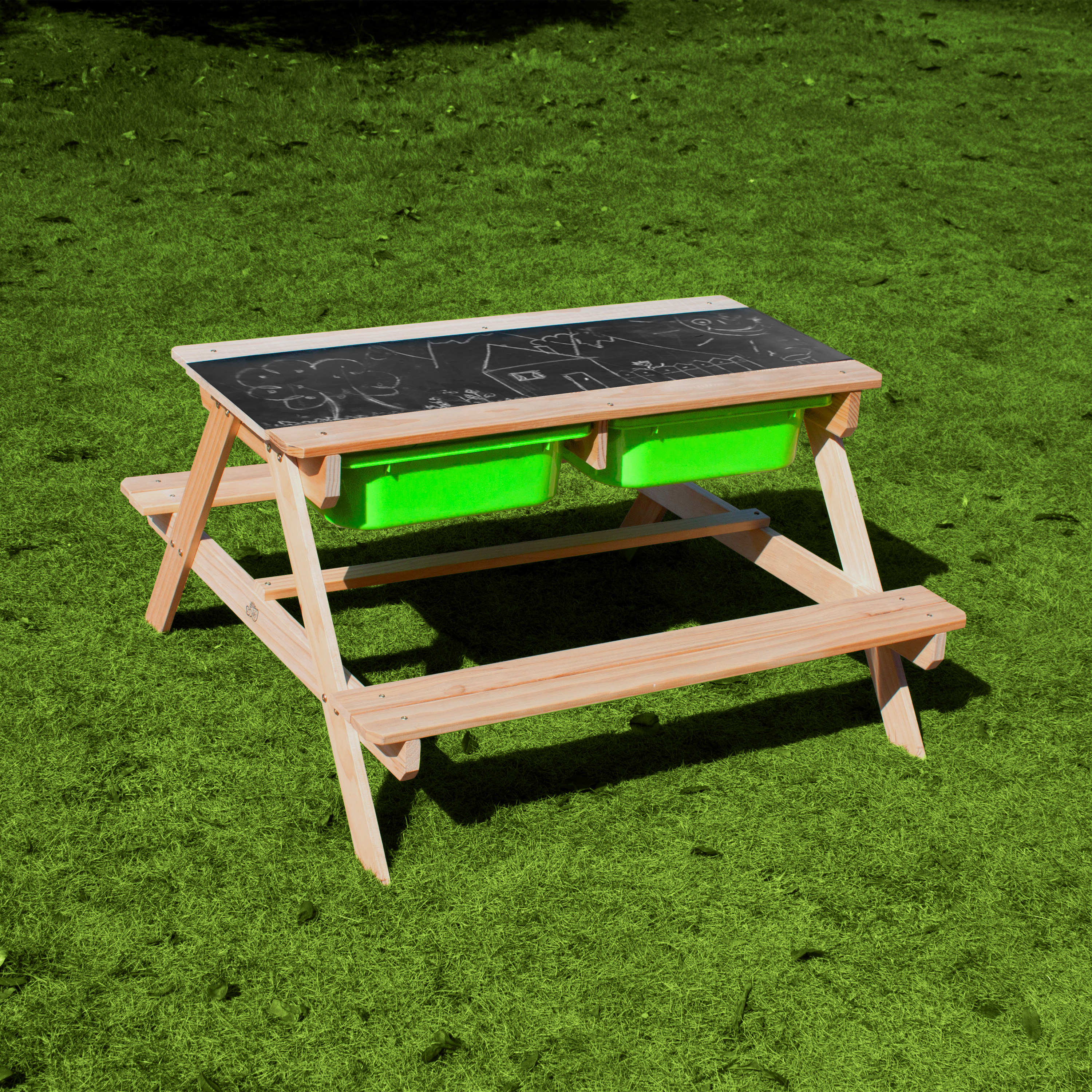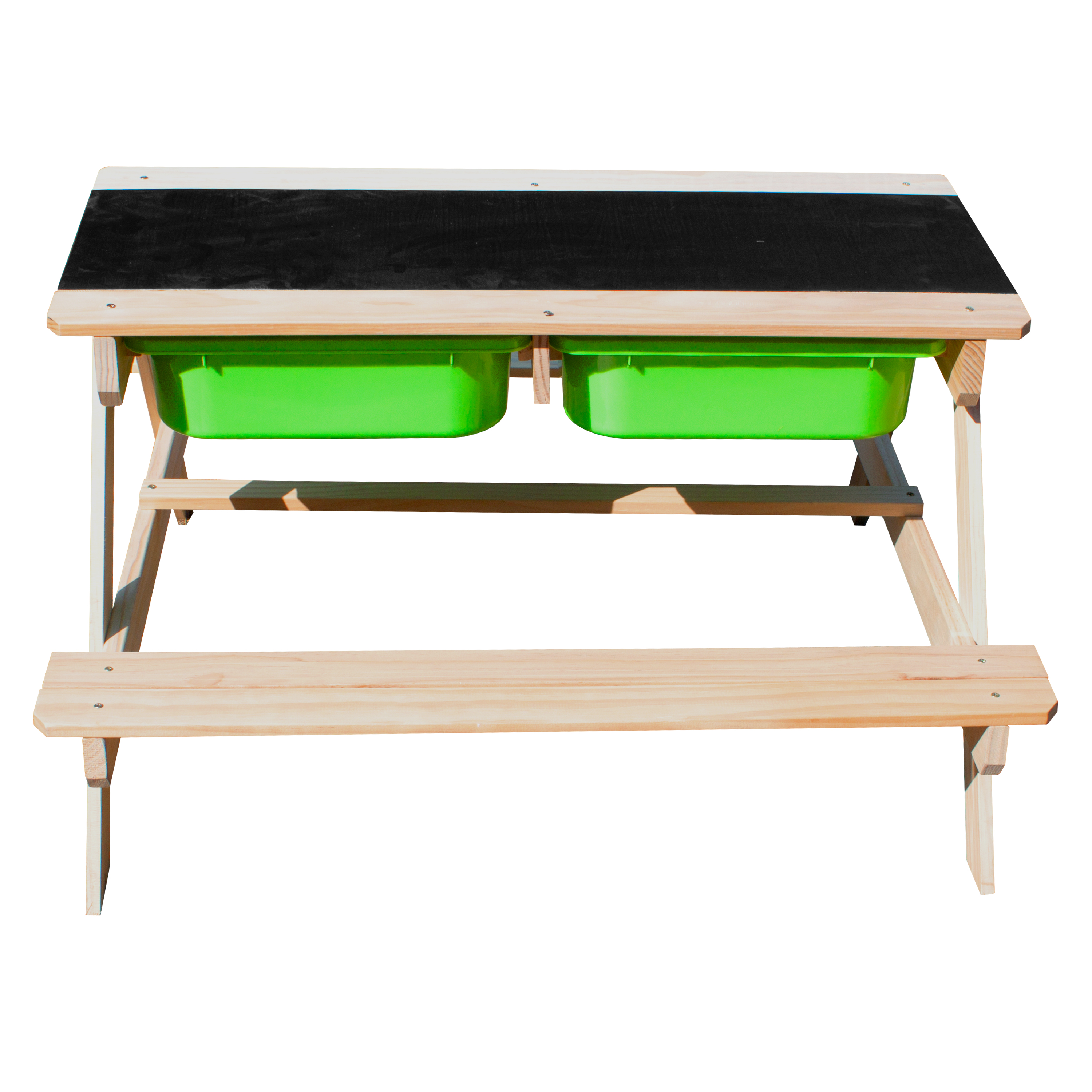 De Sunny Dual Top 2.0 Zand & Water Picknicktafel met 2 groene bakken heeft alles in één! Met deze zand & water tafel kan de creativiteit van de kinderen worden gestimuleerd. De zand & watertafel is voorzien van een afneembaar tafelblad met aan de onderkant een krijtbord. Zo kunnen kinderen allerlei creaties maken en als ze klaar zijn kan het tafelblad aan de kant gezet worden om met zand en water te spelen. Onder het tafelblad bevinden zich namelijk twee kunststof bakken met beide een inhoud van circa 11 liter. Deze groene bakken kunnen gevuld worden met zand en/of water, maar je kunt er natuurlijk ook speelgoed in opbergen. Daarnaast zijn de bakken uitneembaar, zodat deze eenvoudig schoongemaakt kunnen worden. De klassieke combinatie van zand en water is altijd een succes bij kinderen! Uitgespeeld? In een handomdraai verander je de zand- en watertafel weer in een picknicktafel waaraan de kinderen kunnen knutselen, tekenen of genieten van wat lekkers. Geschikt voor kinderen van 2 tot en met 7 jaar oud.