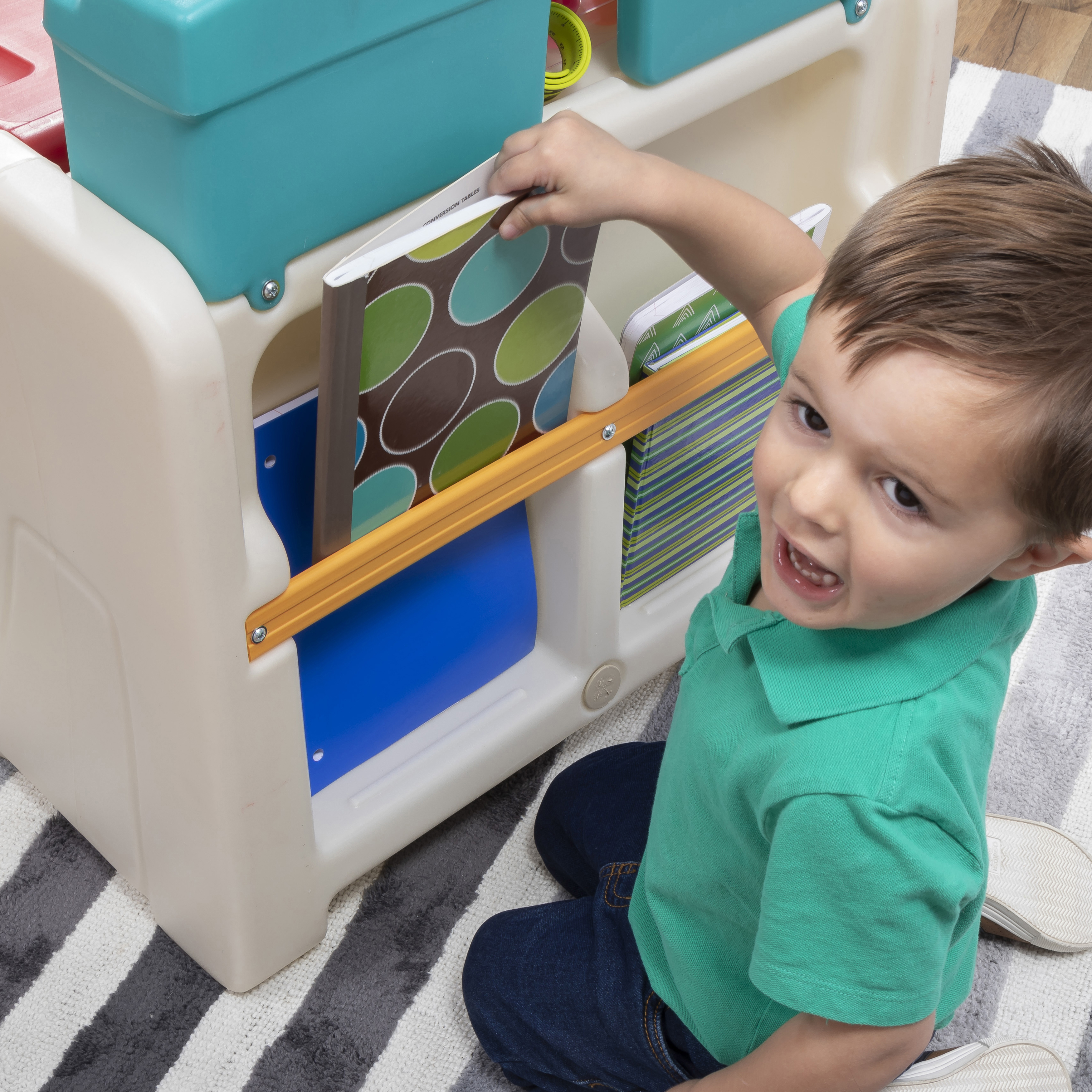 De Step2 Flip & Doodle Easel Desk with Stool is een 2-in-1 bureau en een schildersezel voor kinderen die de artistieke verbeelding van kleintjes aanspreekt. Het biedt veel opbergruimte voor kinderen om krijtjes, vingerverf, blokken en andere kunstbenodigdheden op te bergen. Het frisse ontwerp van deze kunstspeelset zal de speel- of slaapkamer van een kind opvrolijken.
