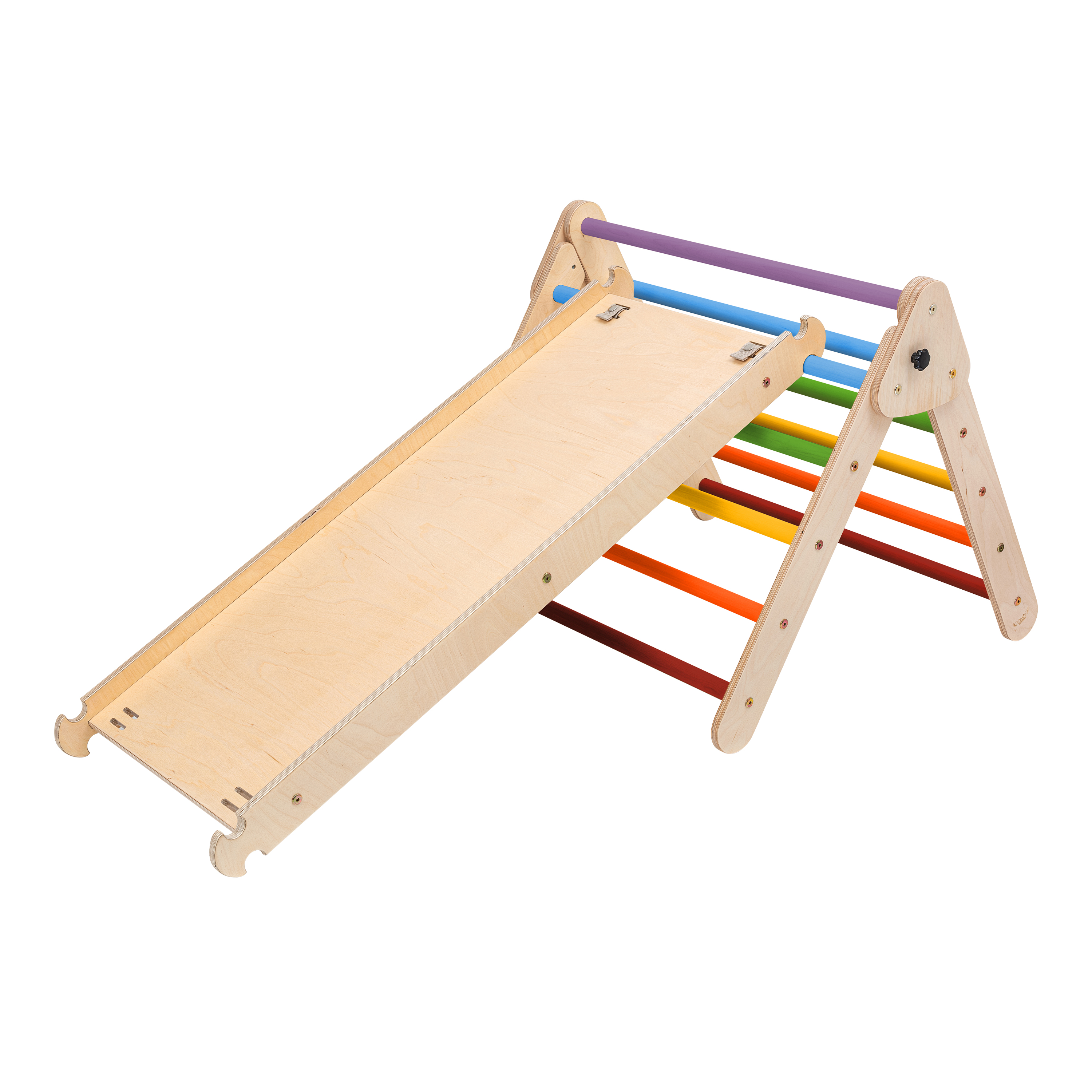 Productinformatie "Houten Klimdriehoek met Klimwand Regenboog"