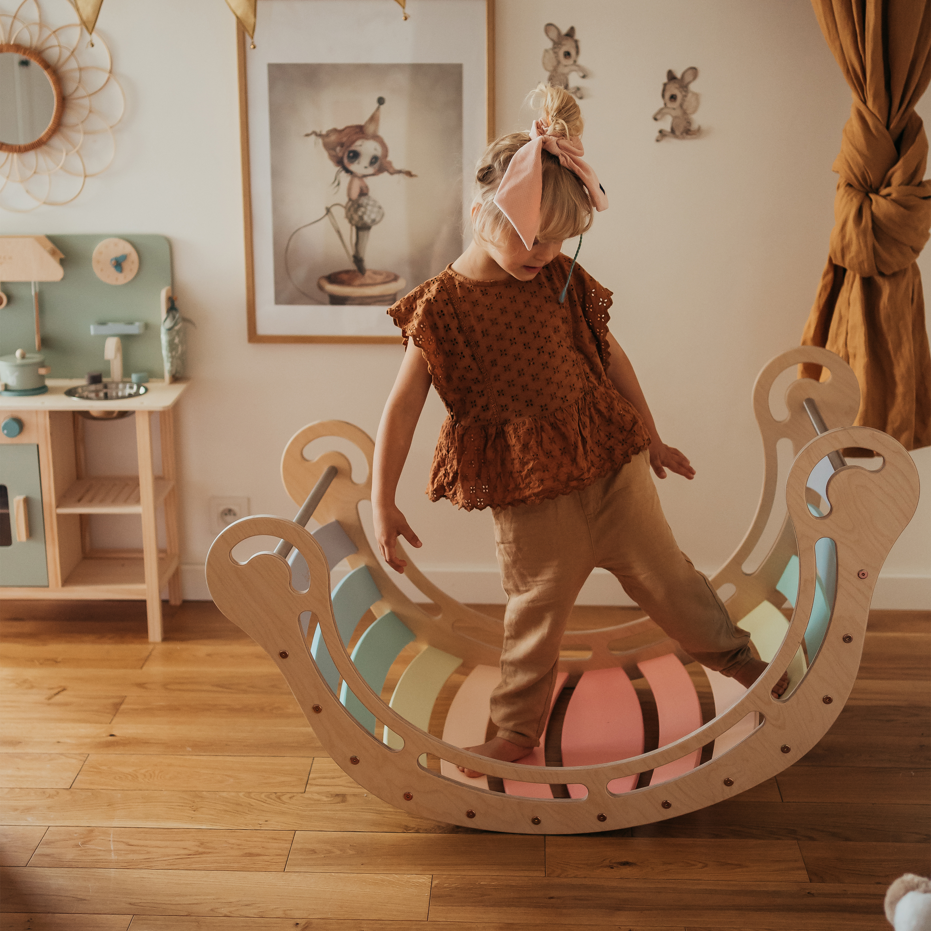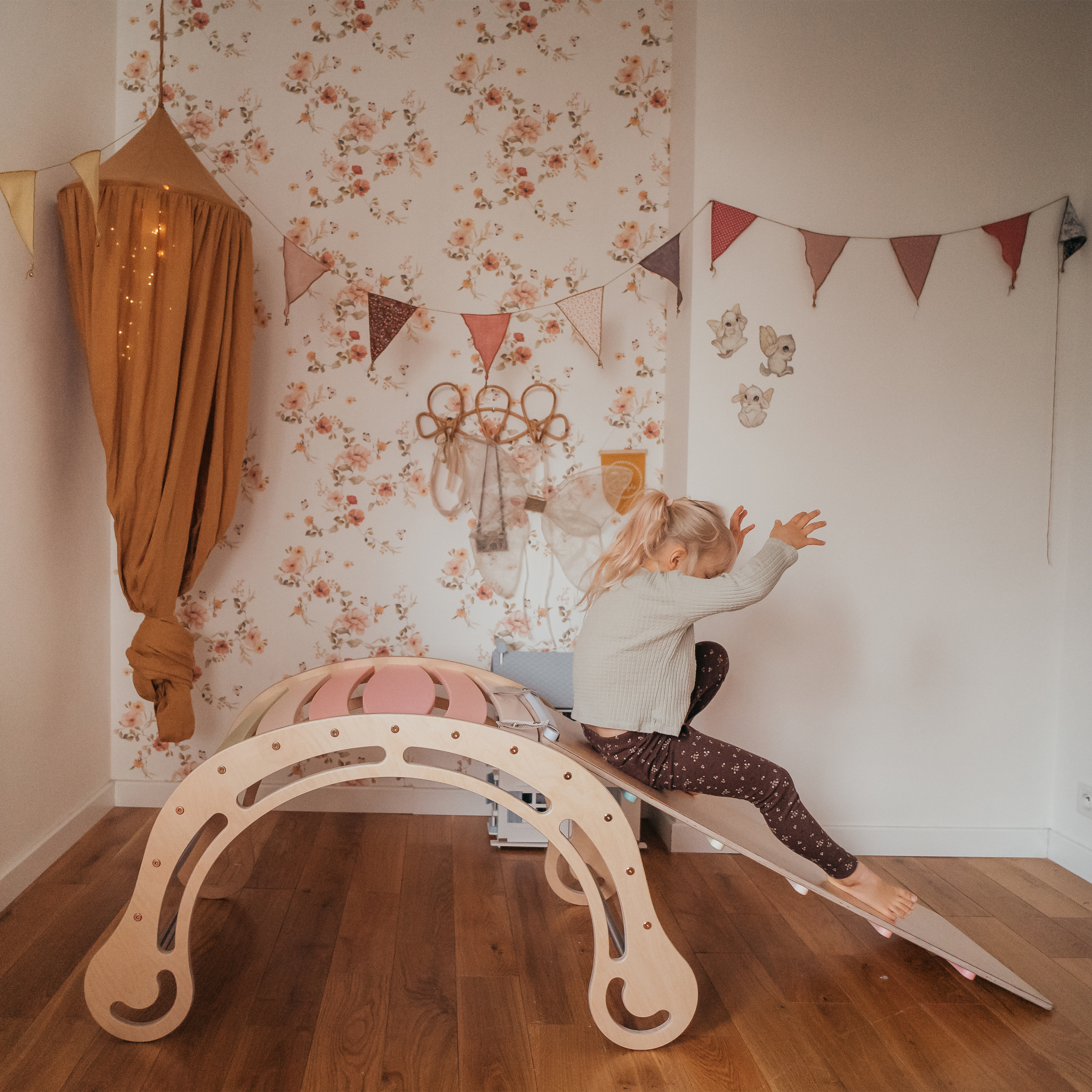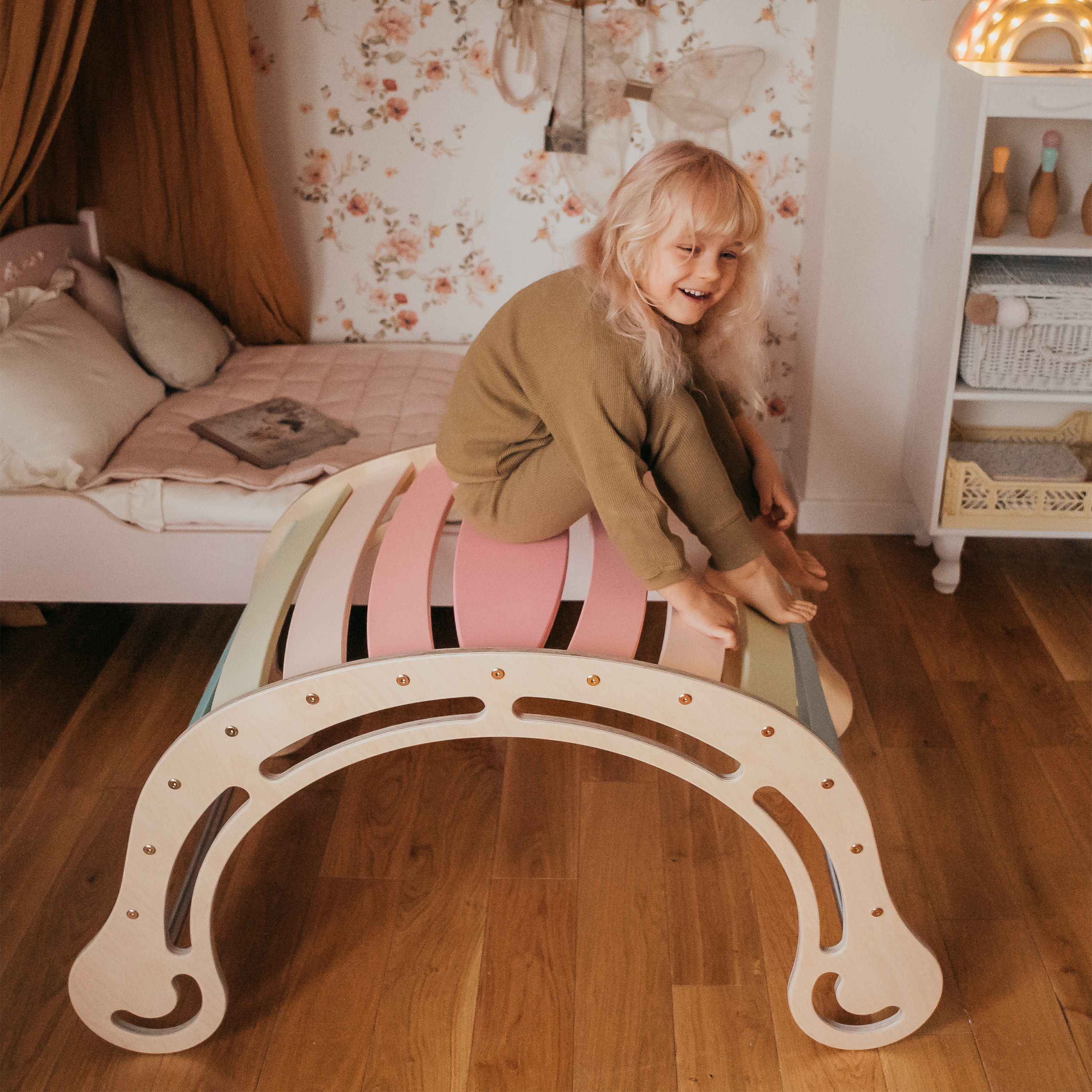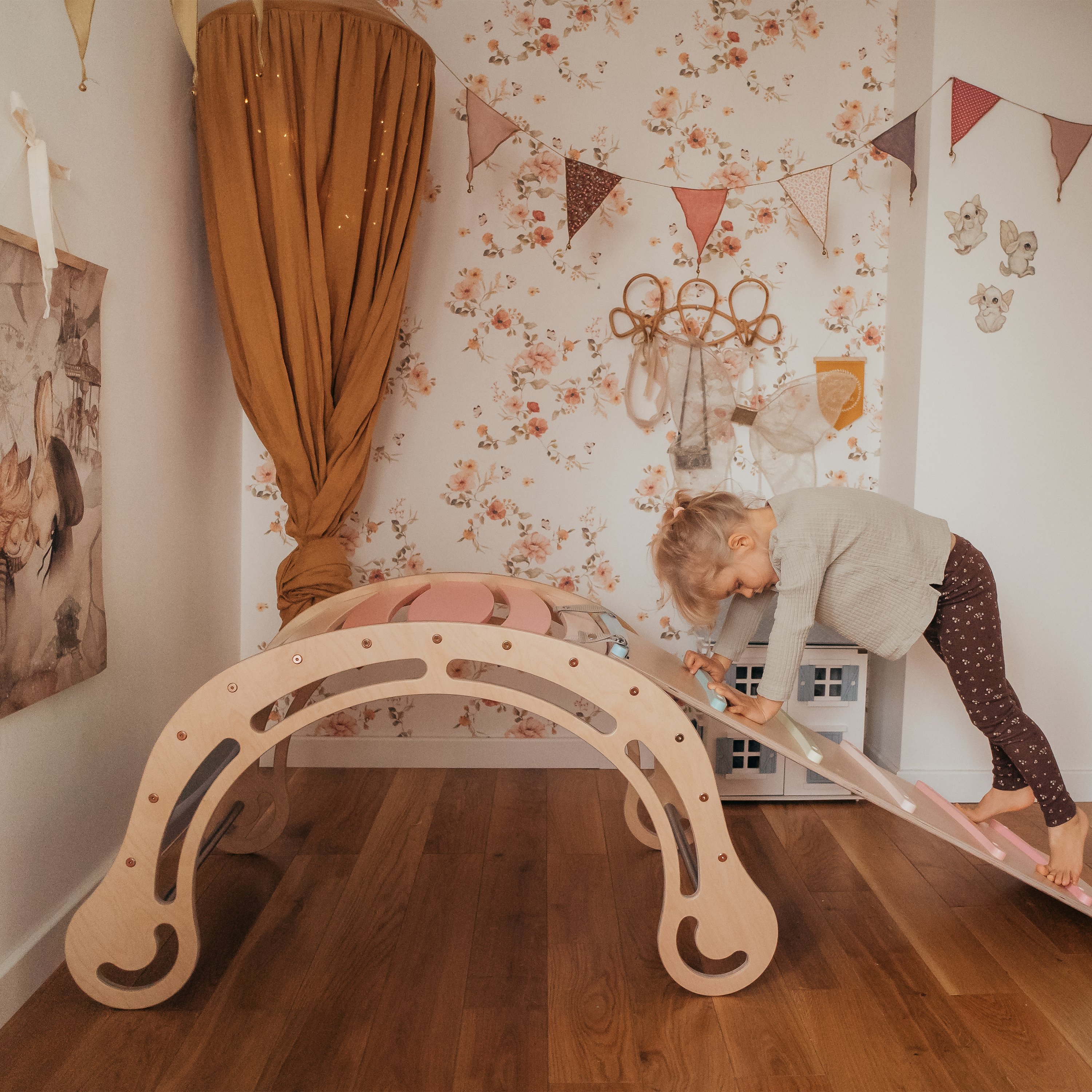 De KateHaa Houten XXL Klimboog Rocker met Klimwand Pastel is innovatief speelgoed dat esthetisch design met praktische speelfuncties combineert. Kinderen leren hun evenwicht en balans te houden terwijl zij klimmen of aan het schommelen zijn. Je kindje wordt al spelend behendig, leert evenwicht te houden en ontwikkelt zijn motoriek. Door de verschillende functies van de rocker is dit speelgoed de perfecte toevoeging voor iedere kinderkamer!