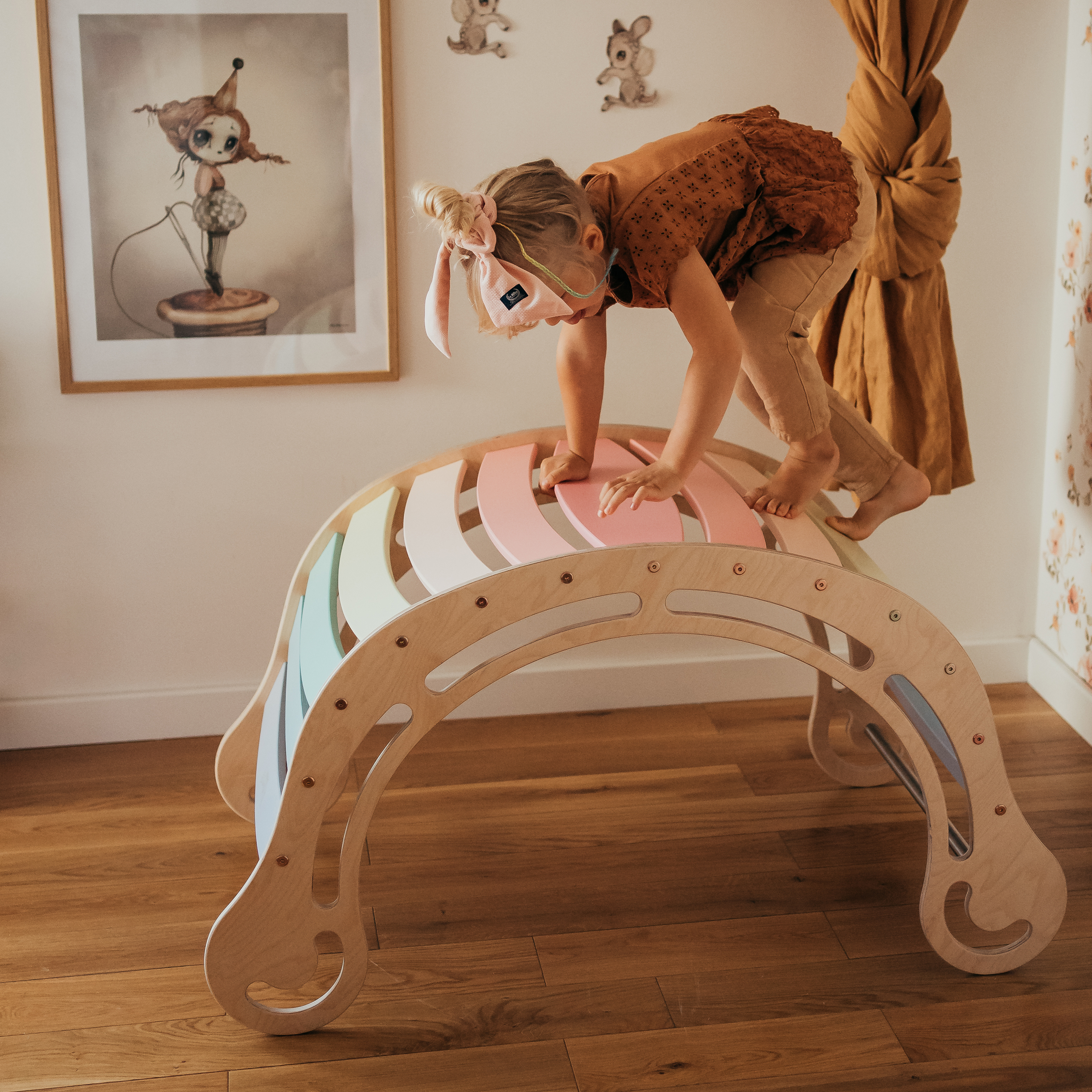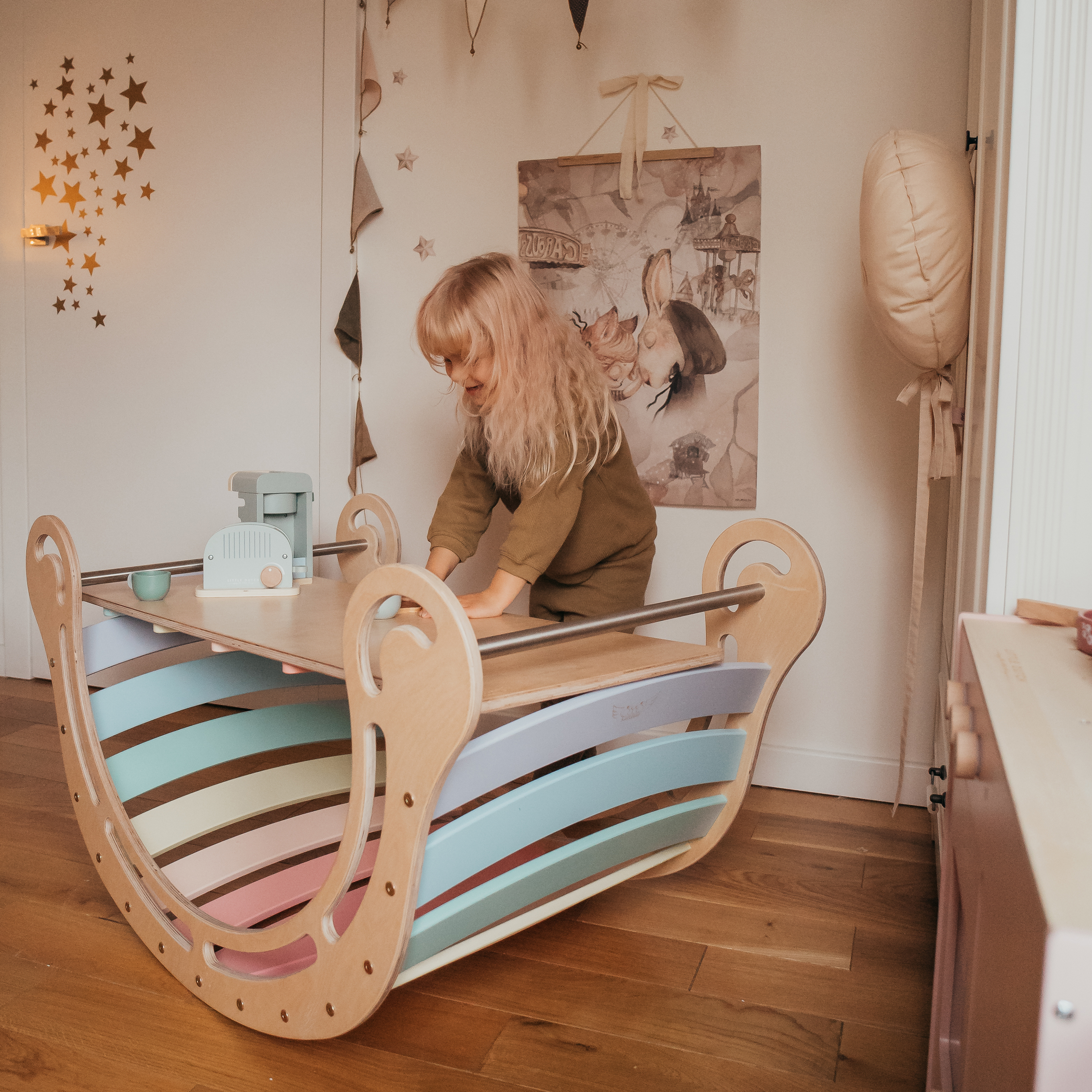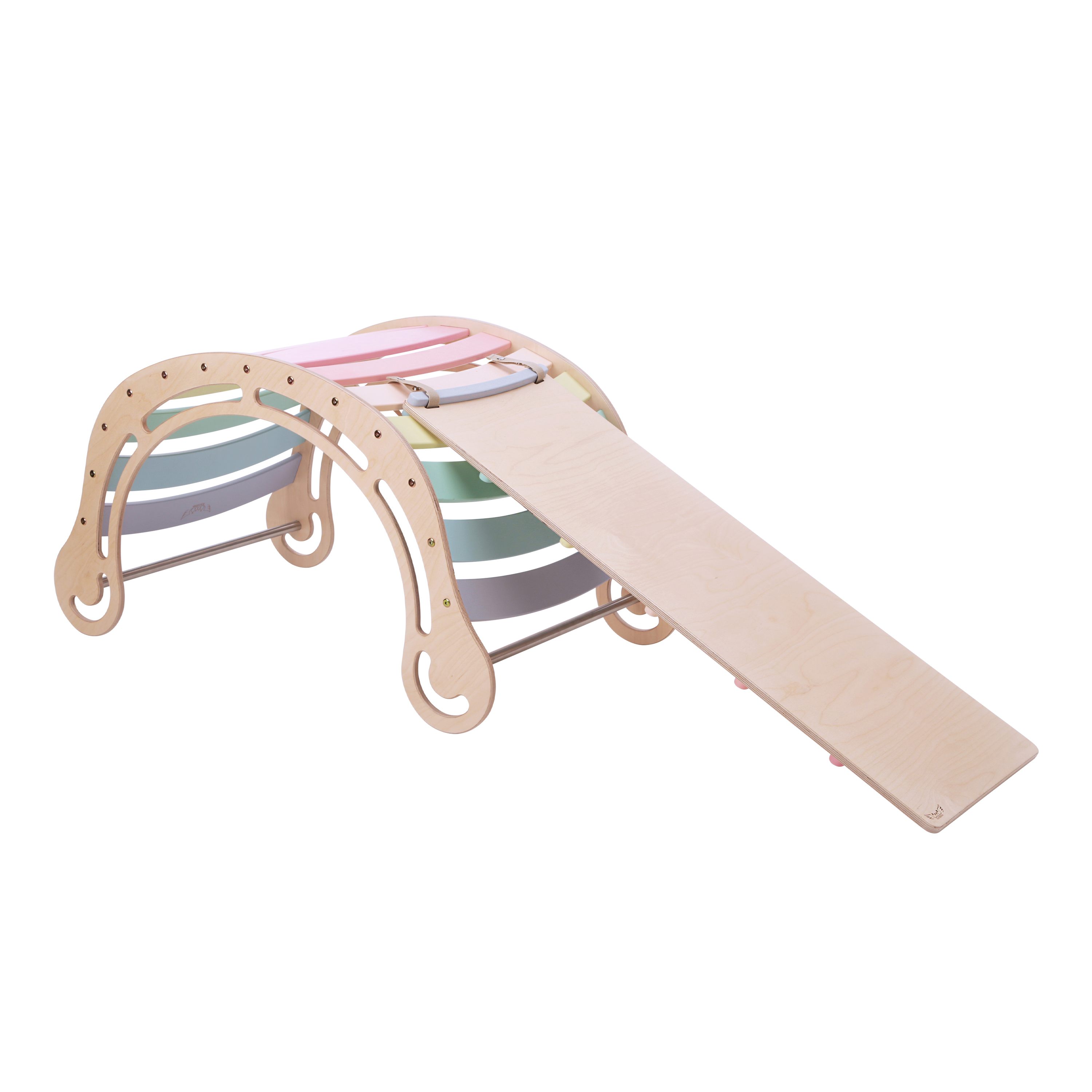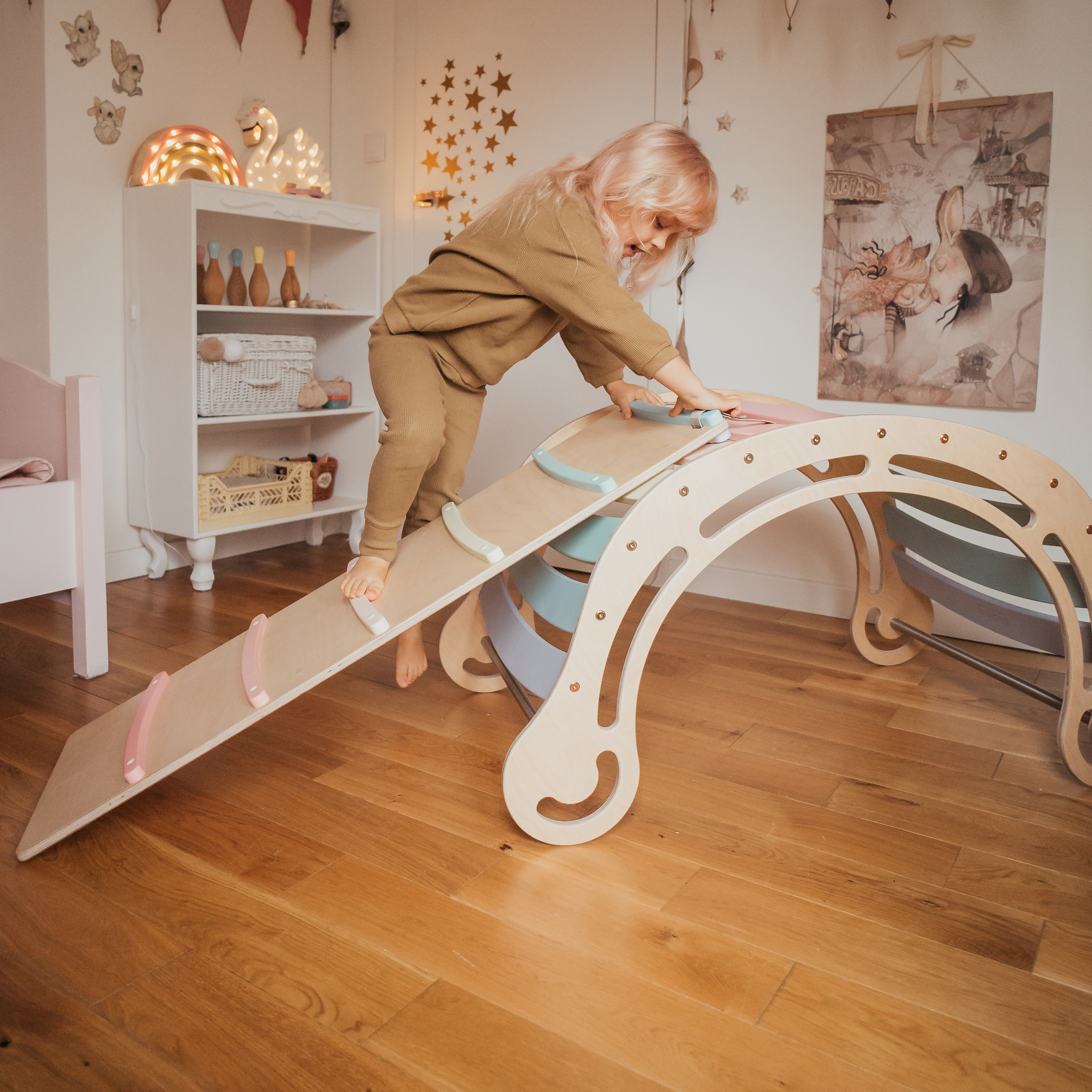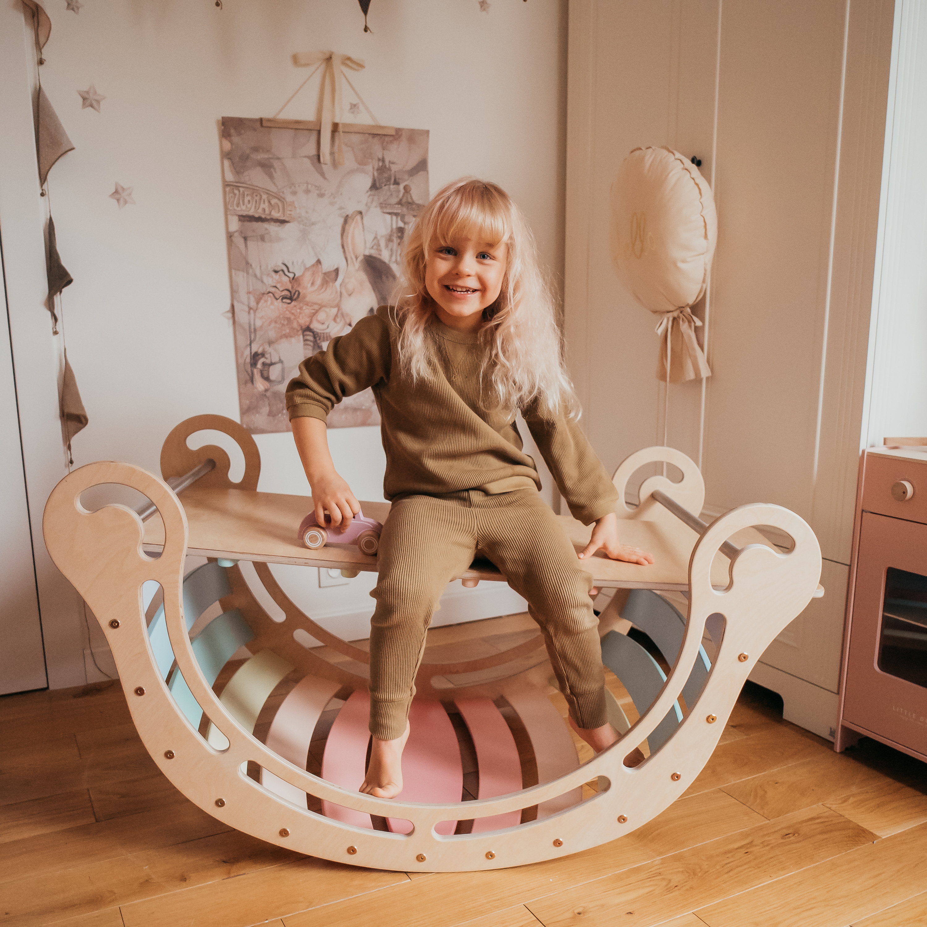 De KateHaa Houten XXL Klimboog Rocker met Klimwand Pastel is innovatief speelgoed dat esthetisch design met praktische speelfuncties combineert. Kinderen leren hun evenwicht en balans te houden terwijl zij klimmen of aan het schommelen zijn. Je kindje wordt al spelend behendig, leert evenwicht te houden en ontwikkelt zijn motoriek. Door de verschillende functies van de rocker is dit speelgoed de perfecte toevoeging voor iedere kinderkamer!