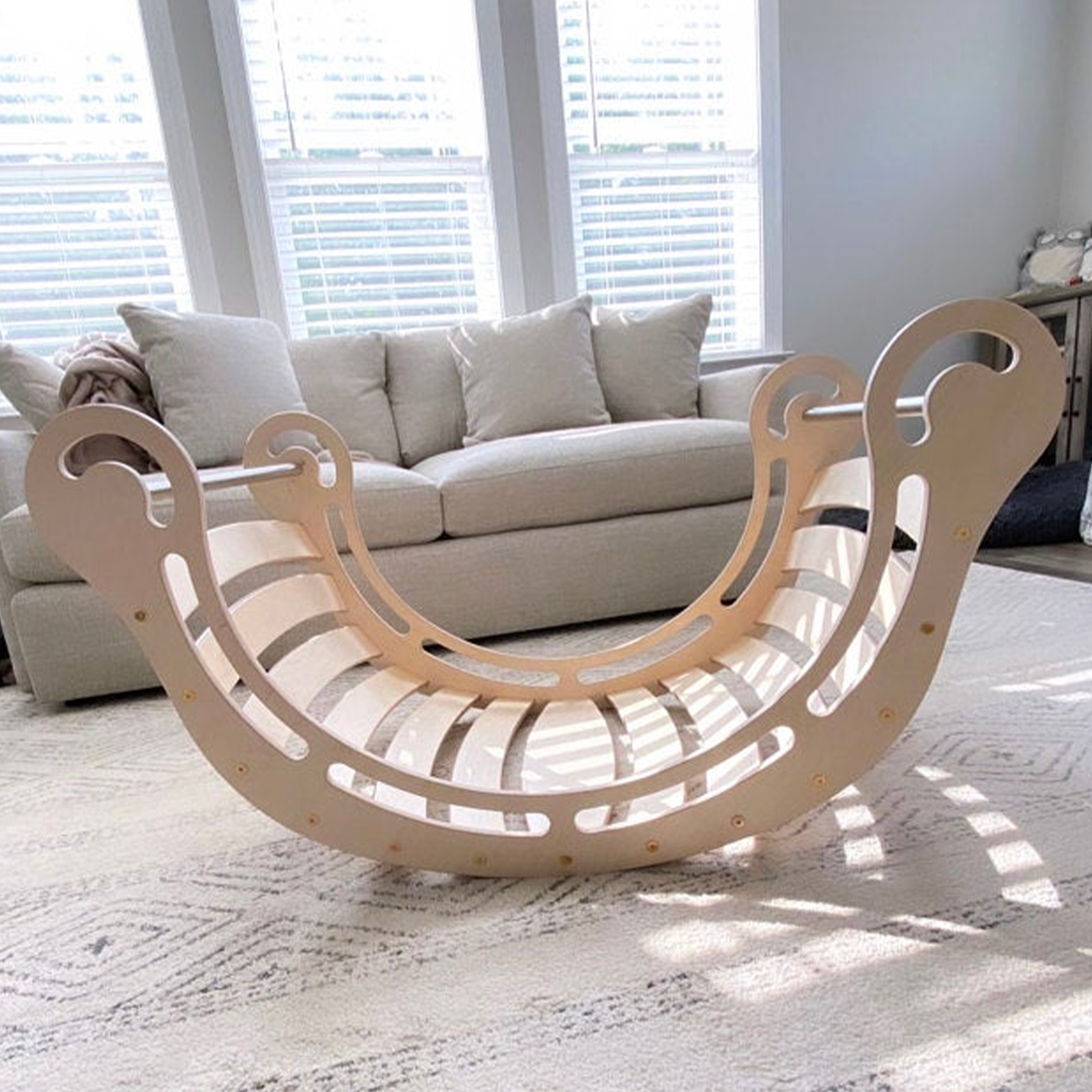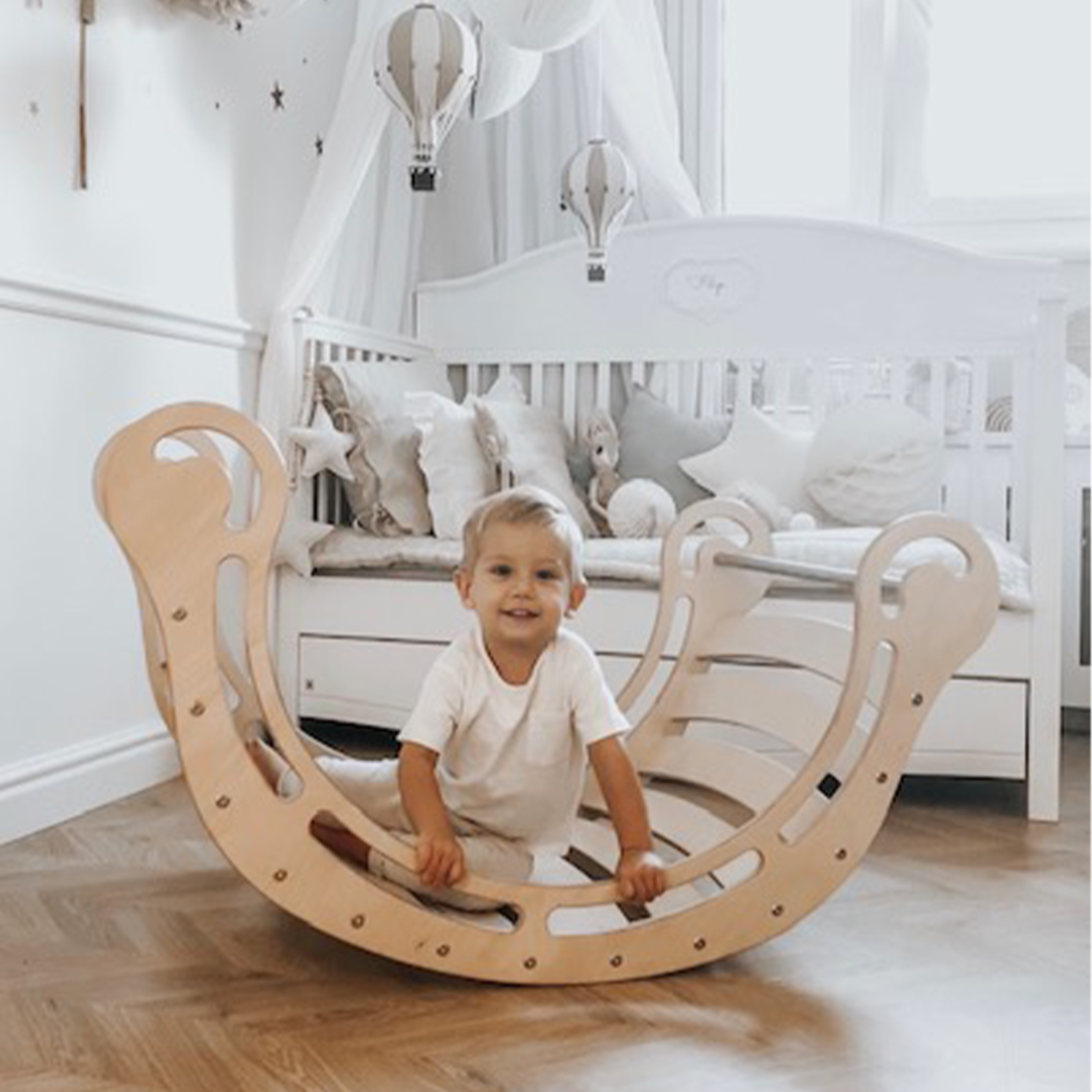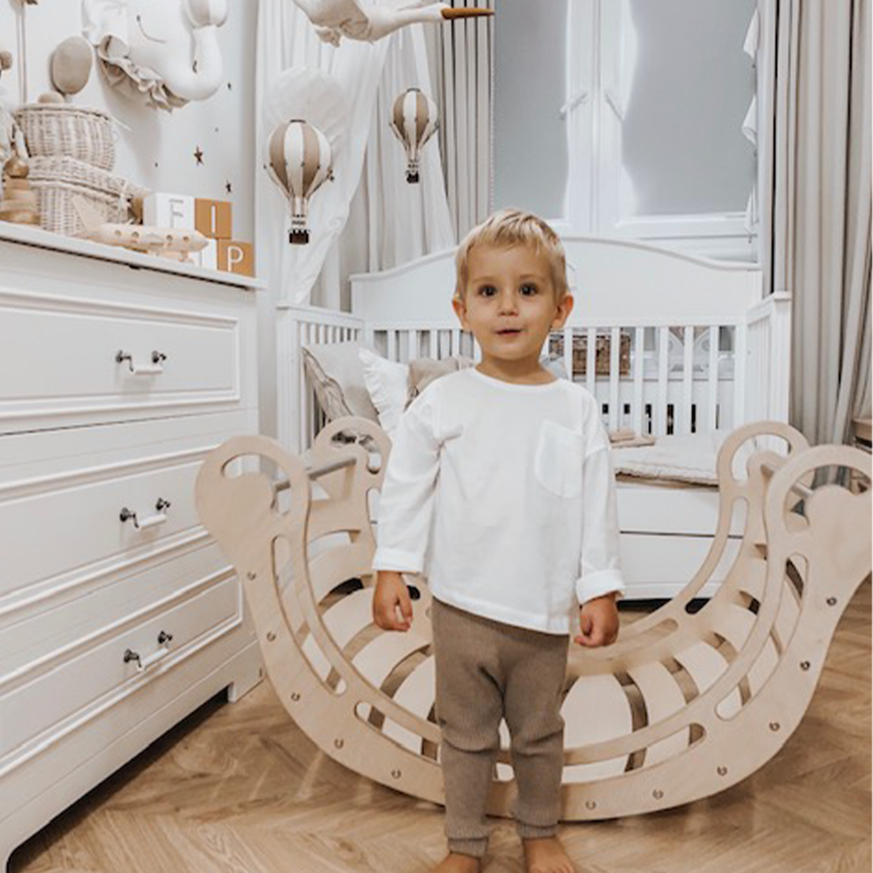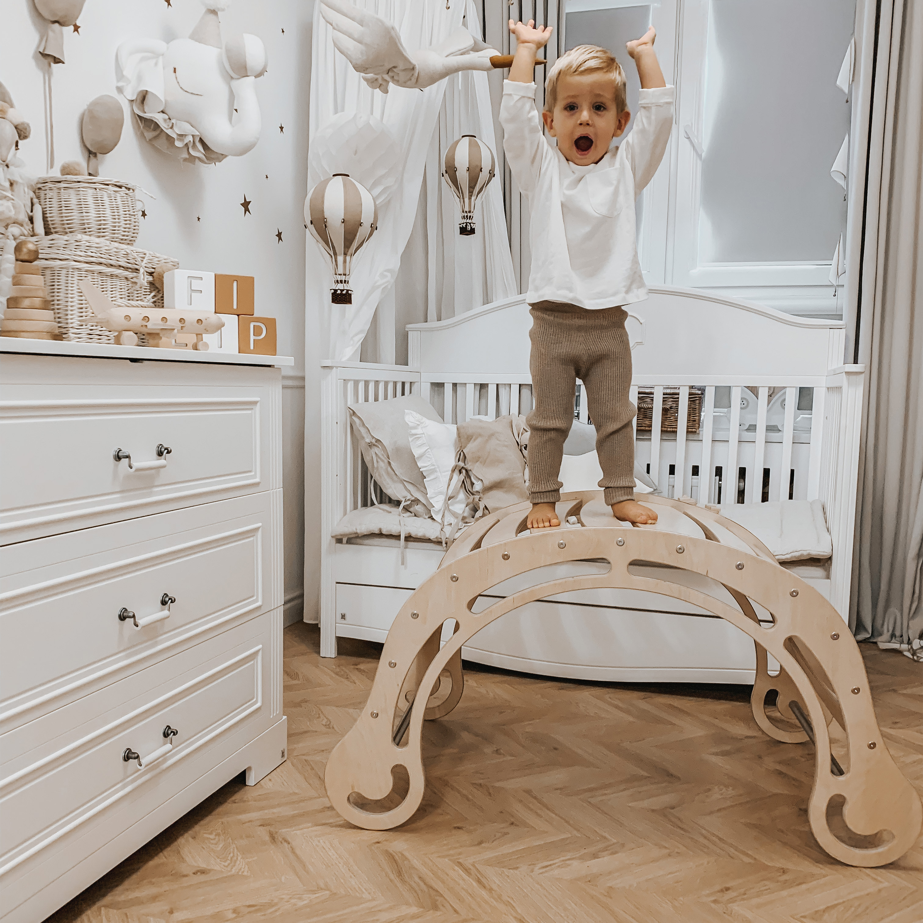 De KateHaa Houten XXL Klimboog Rocker Naturel is innovatief speelgoed dat esthetisch design met praktische speelfuncties combineert. Kinderen leren hun evenwicht en balans te houden terwijl zij klimmen of aan het schommelen zijn. Je kindje wordt al spelend behendig, leert evenwicht te houden en ontwikkelt zijn motoriek. Door de verschillende functies van de rocker is dit speelgoed de perfecte toevoeging voor iedere kinderkamer!