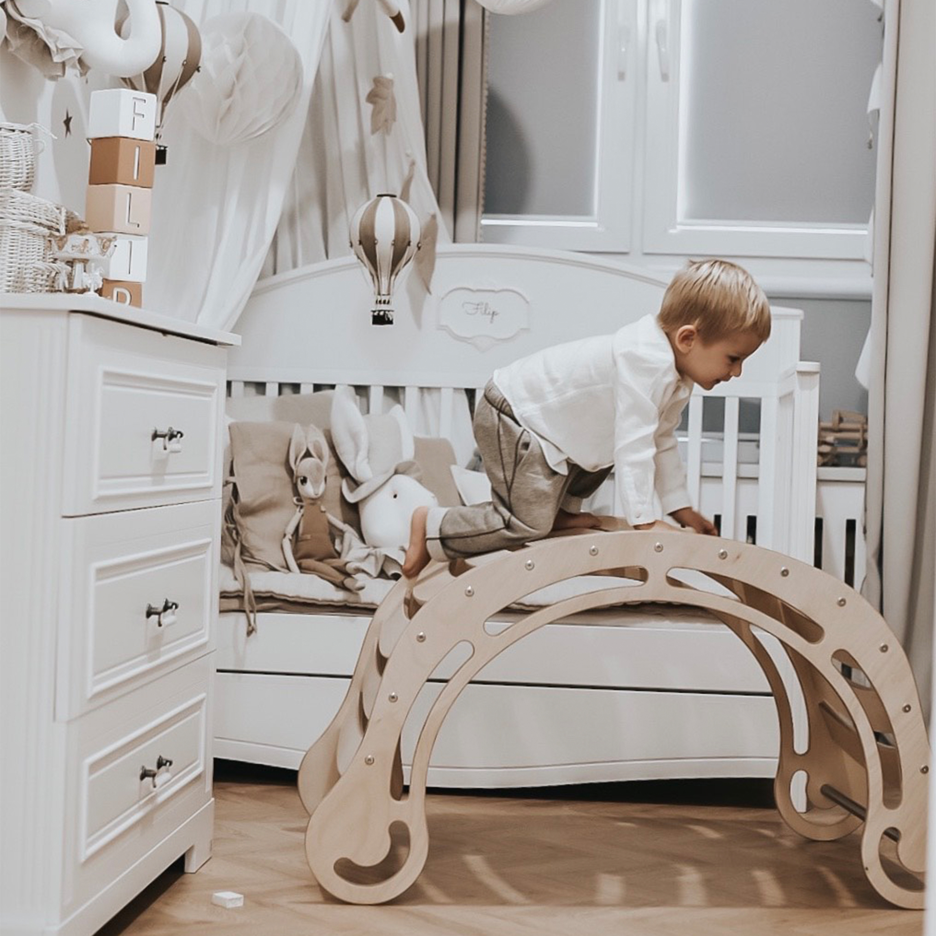 De Klimboog rocker van KateHaa kan gemakkelijk worden uitgebreid met een extra klimwand. Deze extra optie biedt je kindje nog meer speelplezier!
