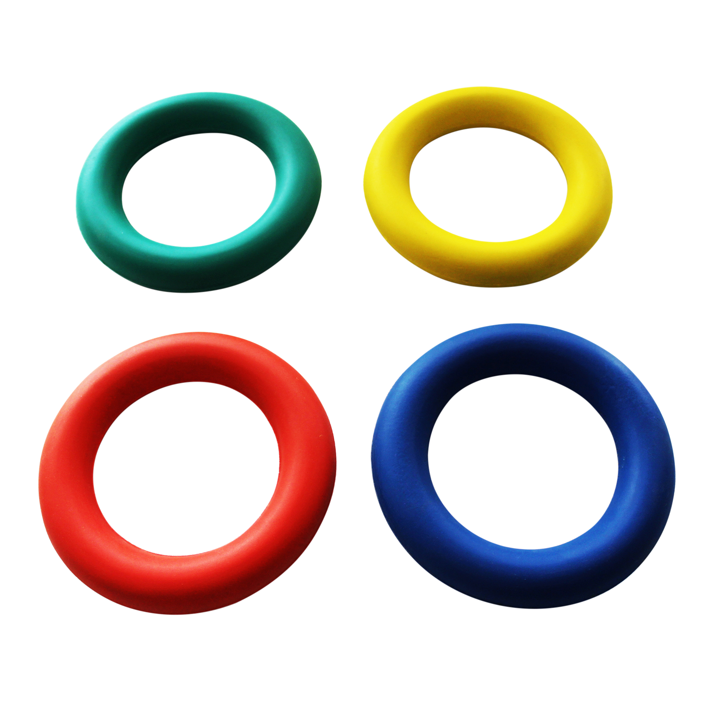 Set van 4 rubberen ringen met een diameter van 15 cm, ook wel Tennikoit ringen genoemd. Met deze ringen kan je kindje overgooien of ergens op richten. Probeer bijvoorbeeld eens om de ring zo dicht mogelijk bij de muur te gooien zonder deze te raken!