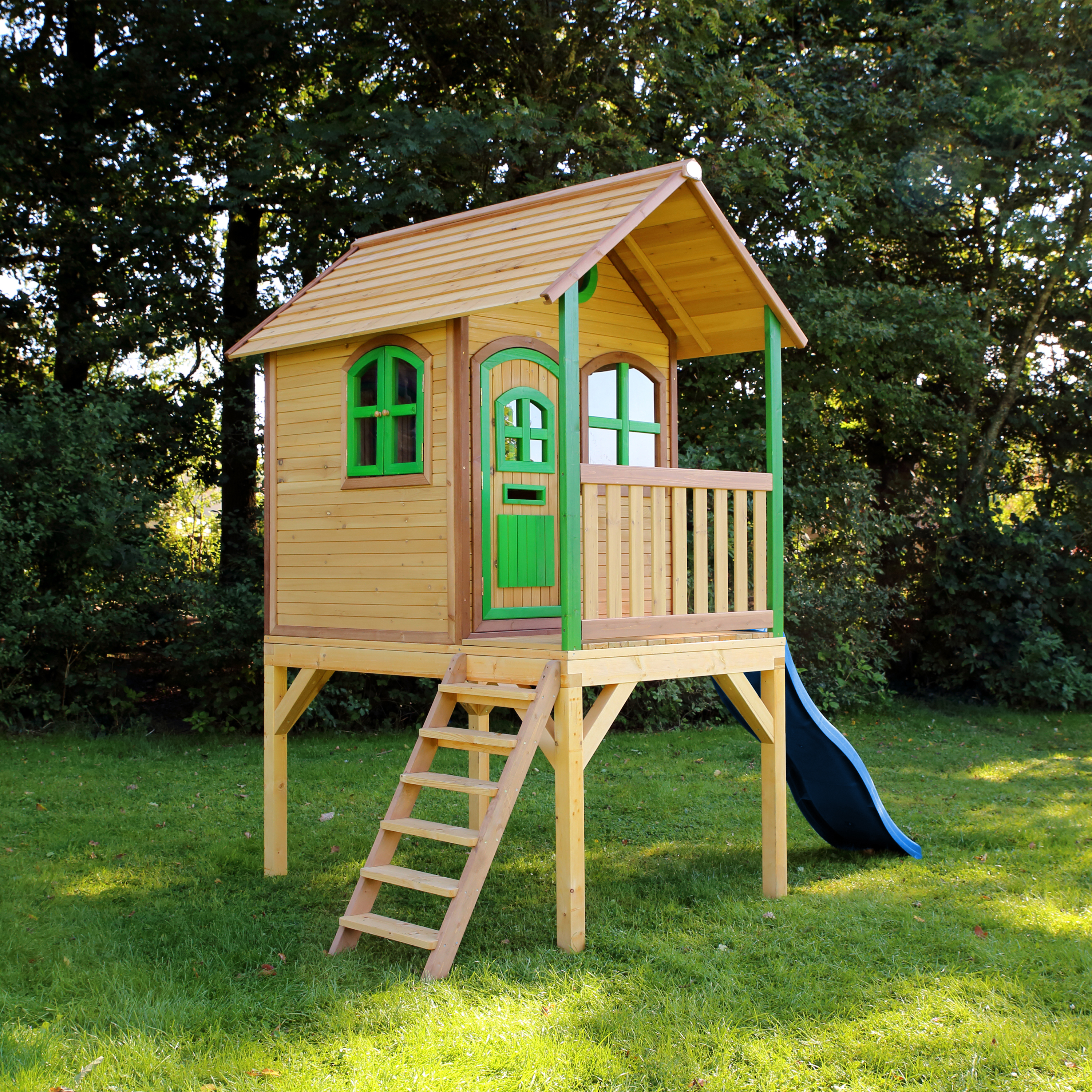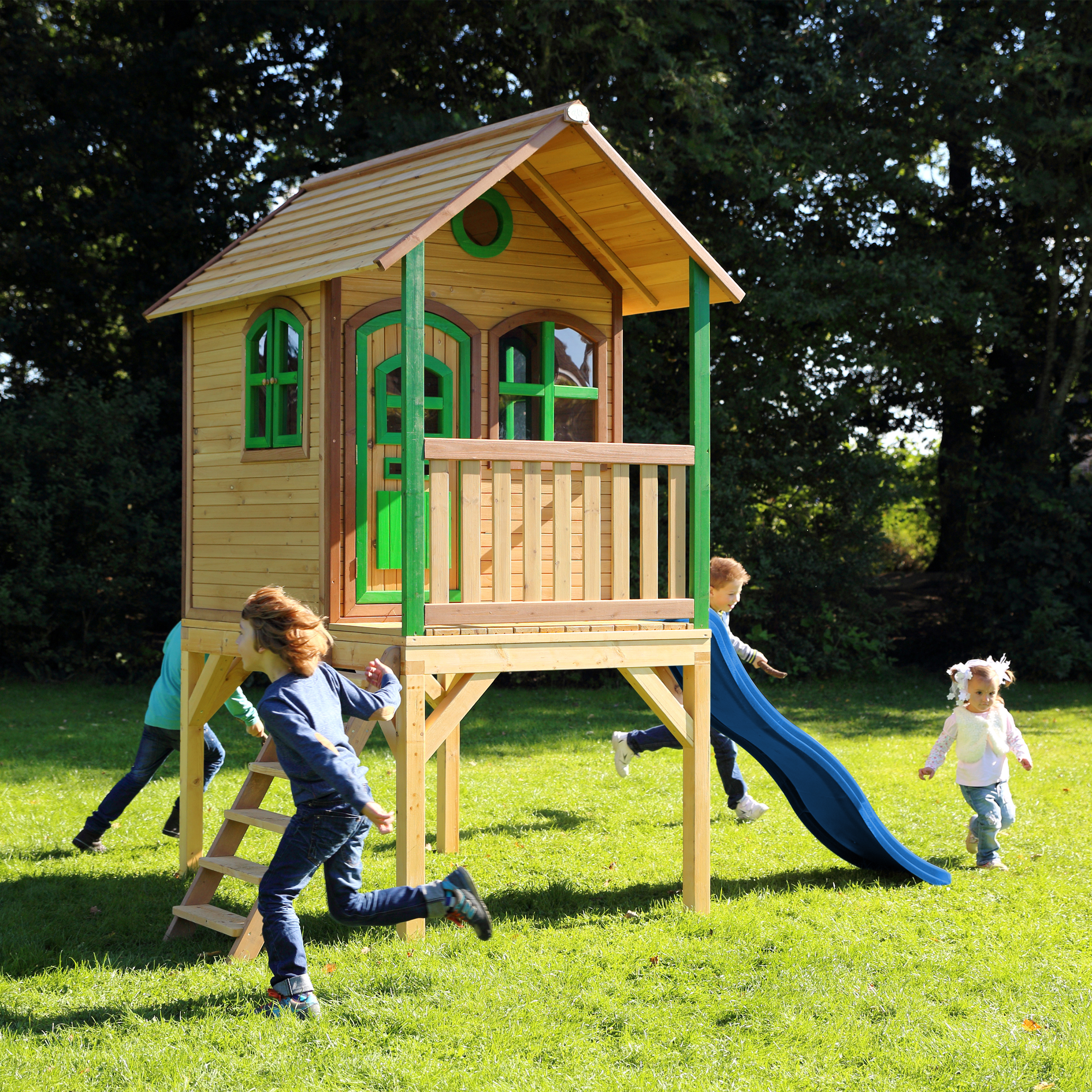 Met het AXI Laura Speelhuis Bruin/groen zullen kinderen het heerlijk vinden om met vriendjes of vriendinnetjes in het houten speelhuisje te spelen. Klimmen op de trap, over de veranda en snel weer naar beneden van de glijbaan. Hoe vaker ze naar beneden glijden, hoe leuker ze het vinden! In dit speelhuis kunnen ze elkaar de mooiste geheimen vertellen. Zodra ze de ramen en deur dicht doen, kan niemand ze meer afluisteren! Laura is een veelzijdig houten speelhuis met een halfronde deur en ramen. De deur heeft een brievenbus waar kinderen post doorheen kunnen gooien als ze postbodetje spelen. De bruin/groene kleuren zijn herkenbaar als de klassieke AXI producten welke al jaren enorm succesvol zijn voor jong en oud. Laura speelhuis heeft een platformhoogte van 98 cm en is uitgevoerd met een middelgrote glijbaan van 175 cm lang. Het trapje en glijbaan kunnen zowel links als rechts aan het speelhuis worden bevestigd.