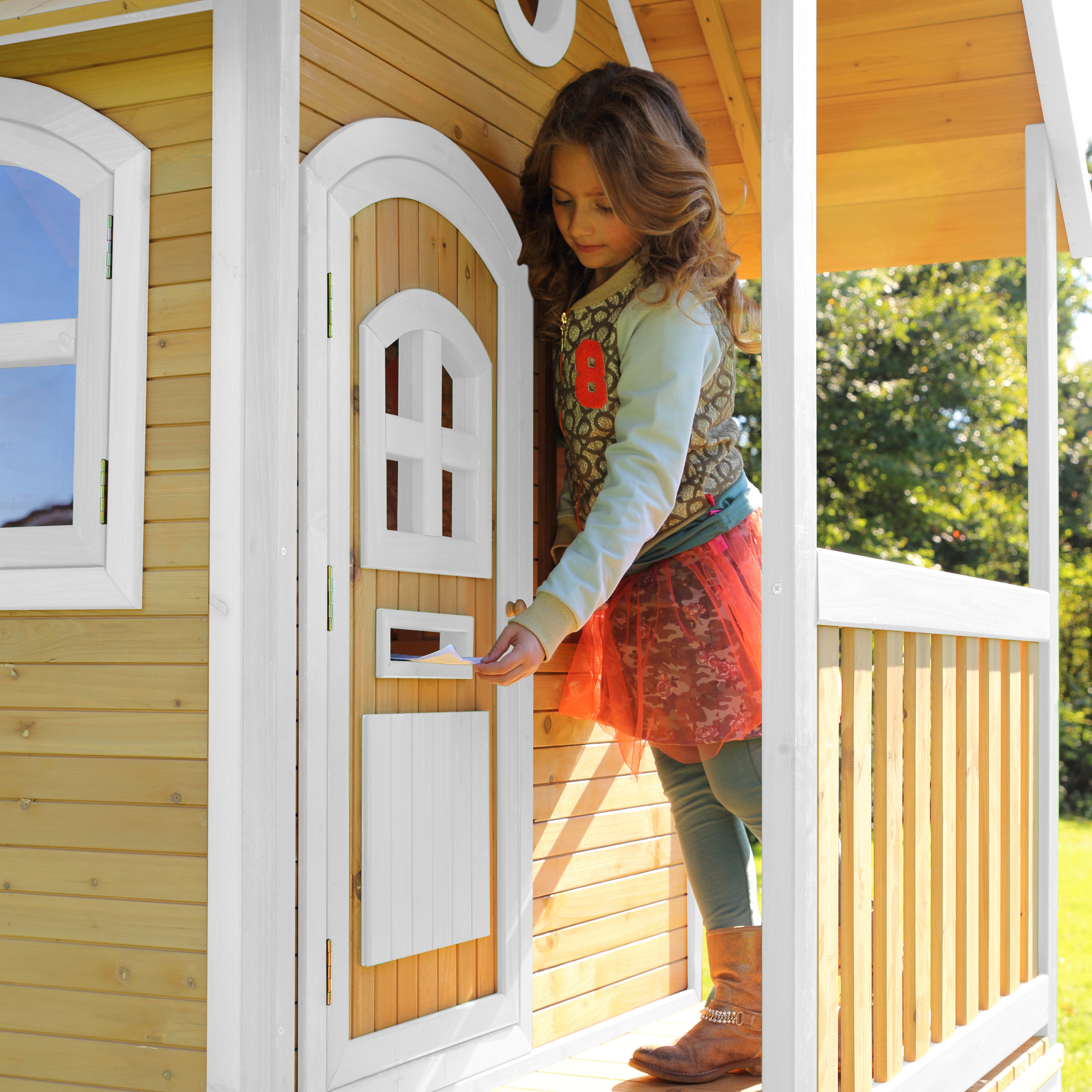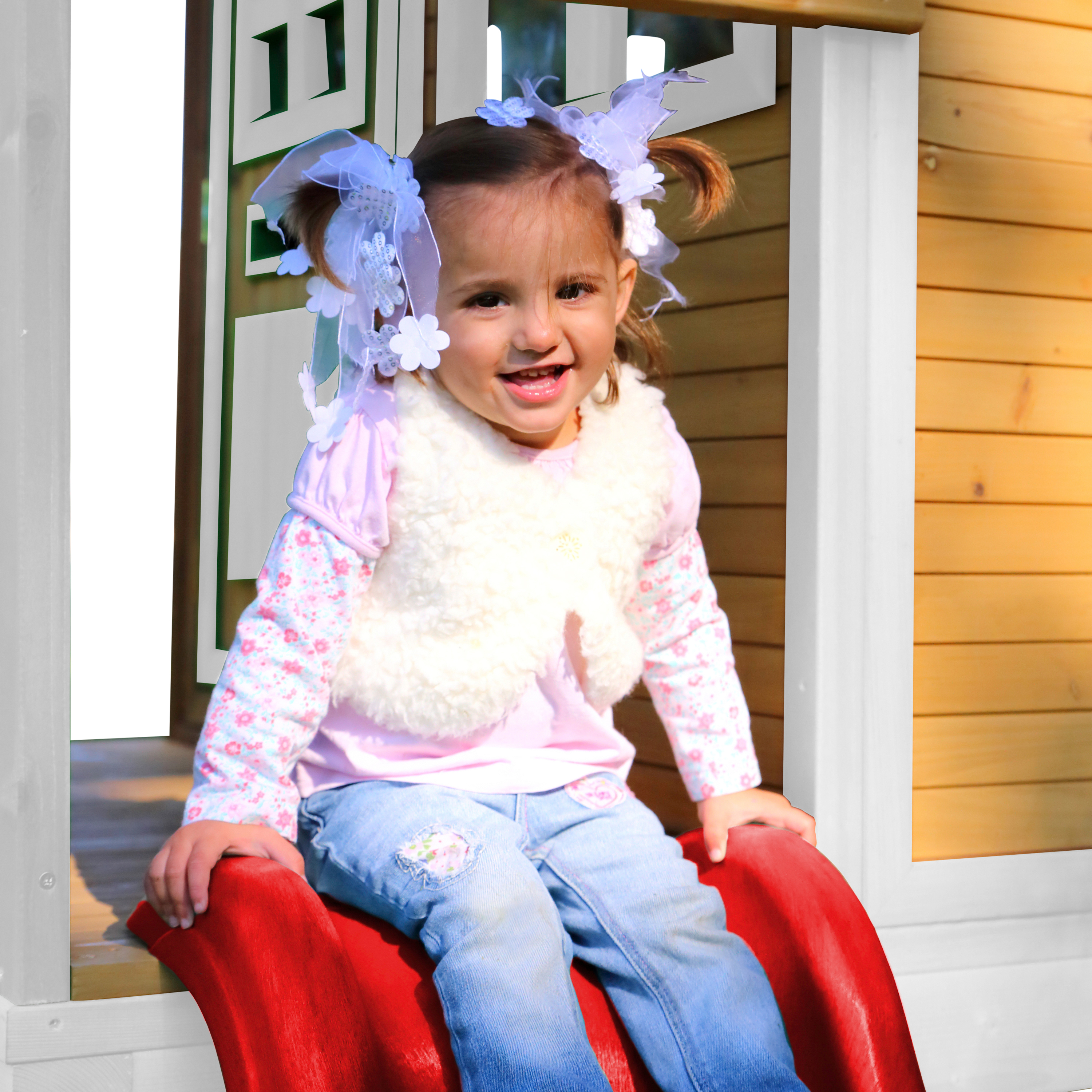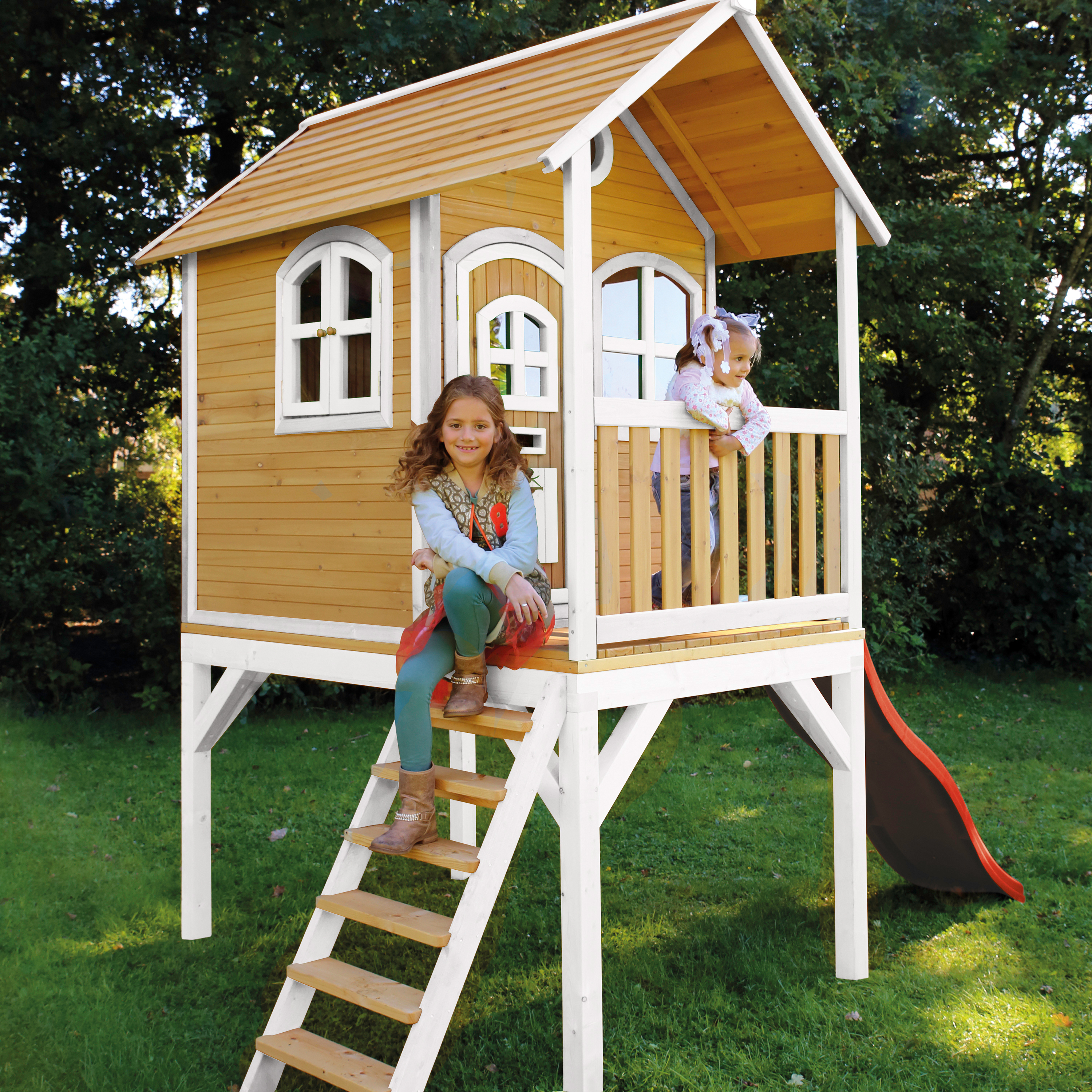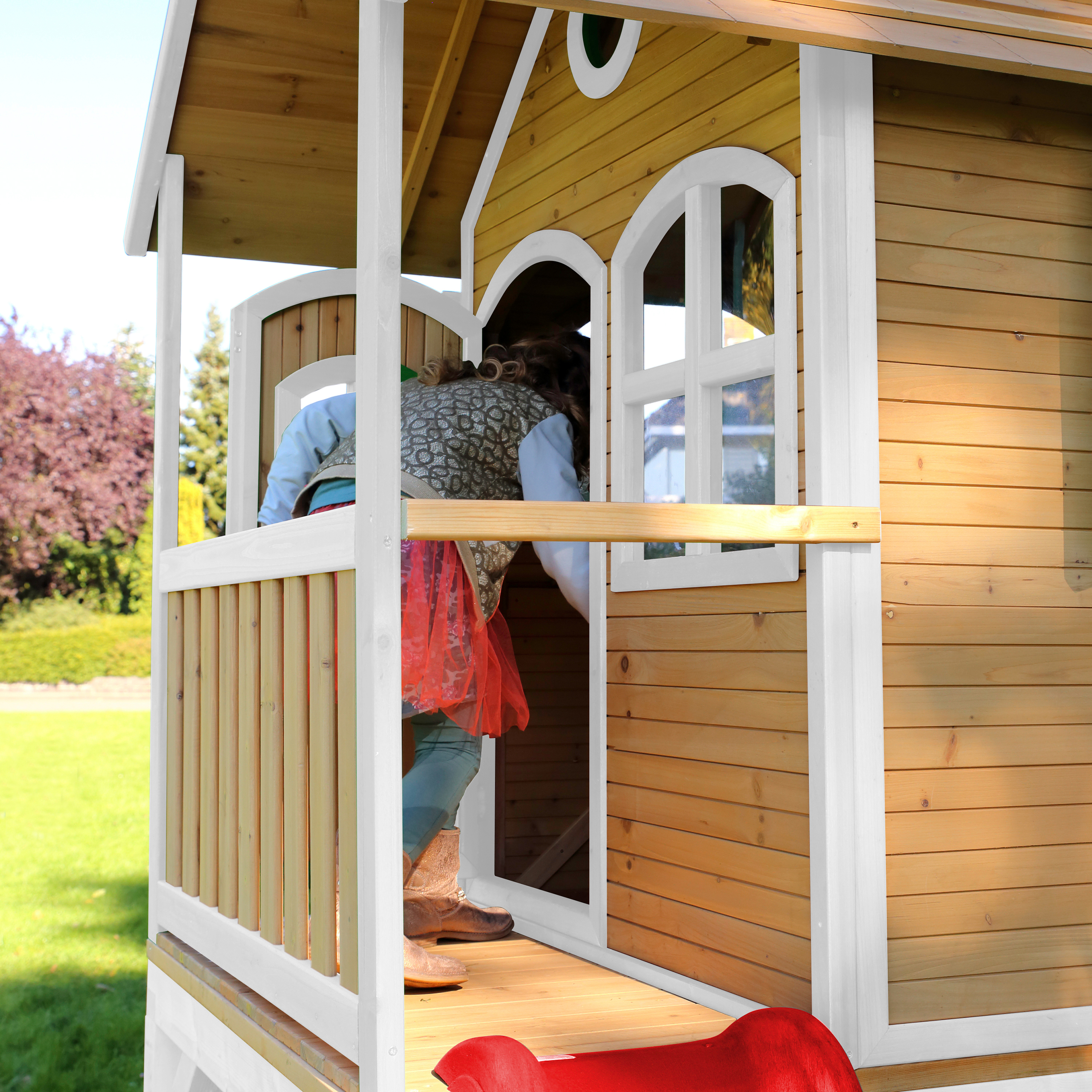 Kinderen vinden het heerlijk om met vriendjes of vriendinnetjes in het houten Laura Speelhuis Bruin/wit van AXI te spelen. Klimmen op de trap, over de veranda en snel weer naar beneden van de glijbaan. Hoe vaker ze naar beneden glijden, hoe leuker ze het vinden! In dit speelhuis kunnen ze elkaar de mooiste geheimen vertellen. Zodra ze de ramen en deur dicht doen, kan niemand ze meer afluisteren! Laura is een veelzijdig houten speelhuis met een halfronde deur en ramen. De deur heeft een brievenbus waar kinderen post doorheen kunnen gooien als ze postbodetje spelen. Het speelhuisje is uitgevoerd in moderne bruin/witte kleuren welke perfect in iedere hedendaagse tuin passen. Laura speelhuis heeft een platformhoogte van 98 cm en is uitgevoerd met een middelgrote glijbaan van 175 cm lang. Het trapje en glijbaan kunnen zowel links als rechts aan het speelhuis worden bevestigd.