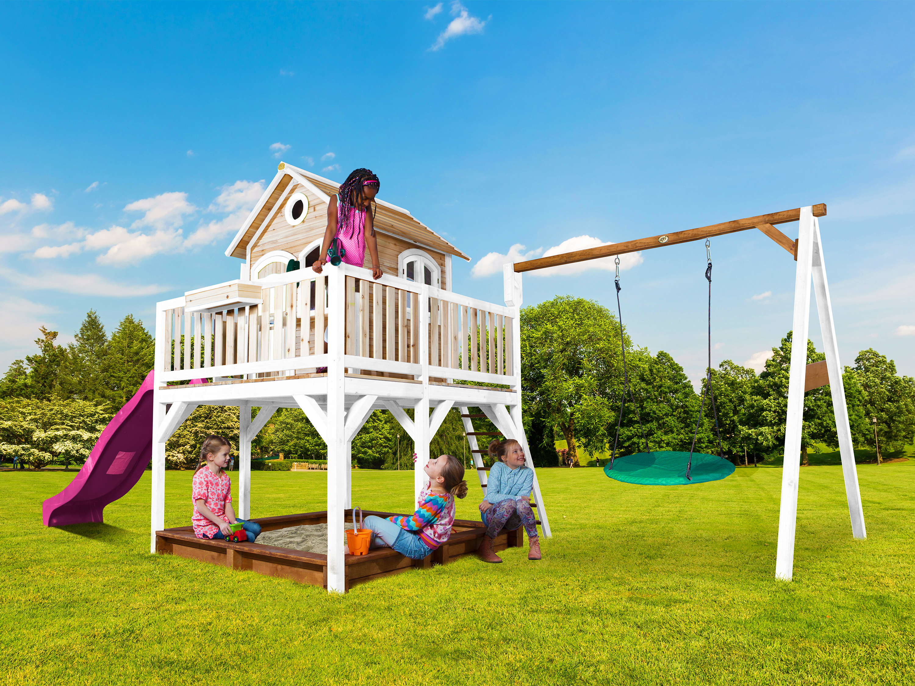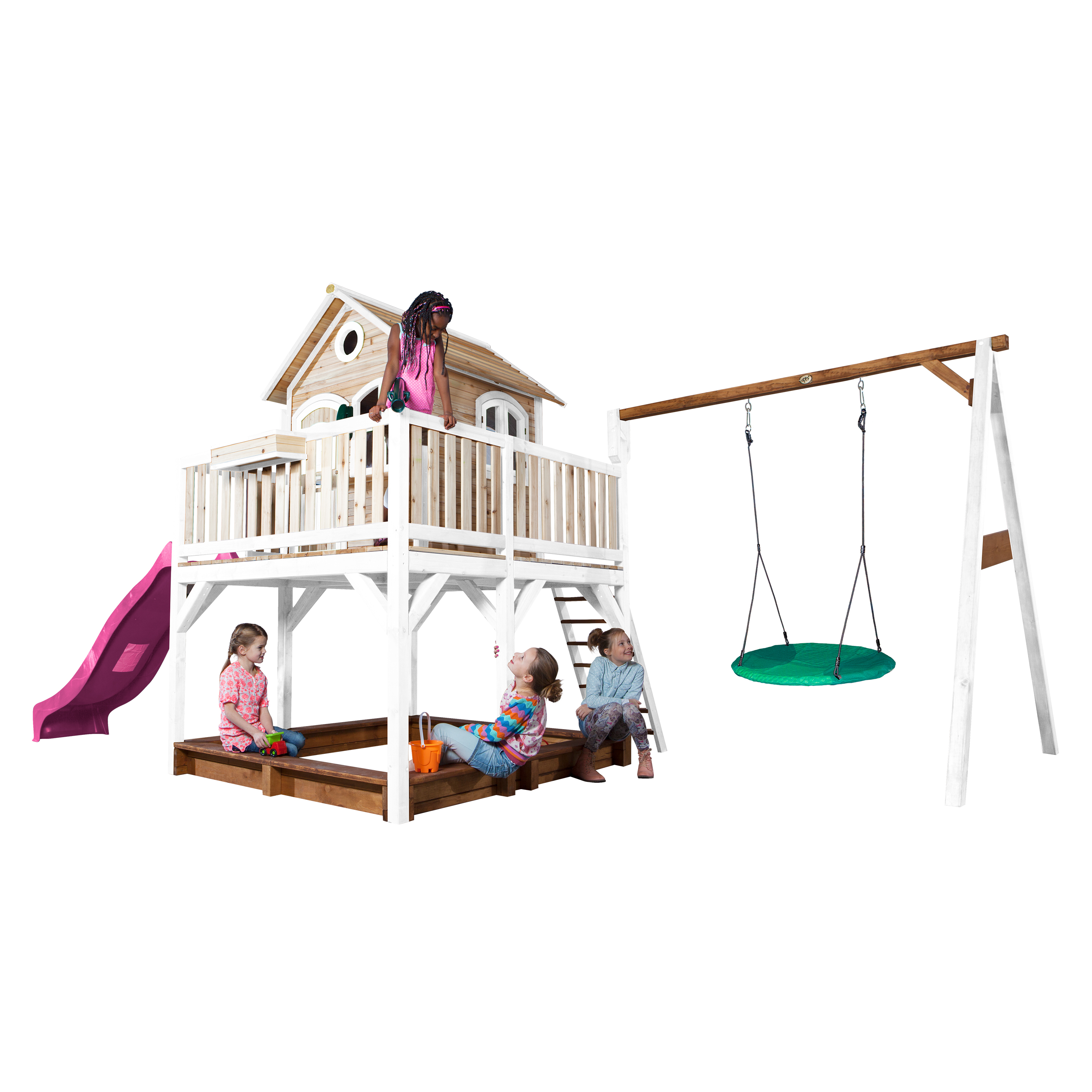 Liam Speelhuis met Summer Nestschommel Bruin/wit van AXI geeft je kinderen oneindig veel speelplezier! Klimmen, glijden en schommelen zijn de favoriete bezigheden van jonge kinderen. En dat is nou juist allemaal mogelijk met Liam. Het is onmogelijk dat kinderen zich hier niet uren mee zullen vermaken op een mooie zonnige dag. De grote veranda maakt het allemaal nog unieker. Daarmee kunnen de kinderen turen over de omgeving en kunnen ze vriendjes en vriendinnetjes van veraf aan zien komen. Naast het uitzicht vanaf de veranda kunnen ze heerlijk genieten van hun vrijheid als ze aan het schommelen zijn. Gelukkig hoeven ze op deze nestschommel niet alleen te zwaaien, maar het kan met één of meerdere vriendjes of vriendinnetjes tegelijk.