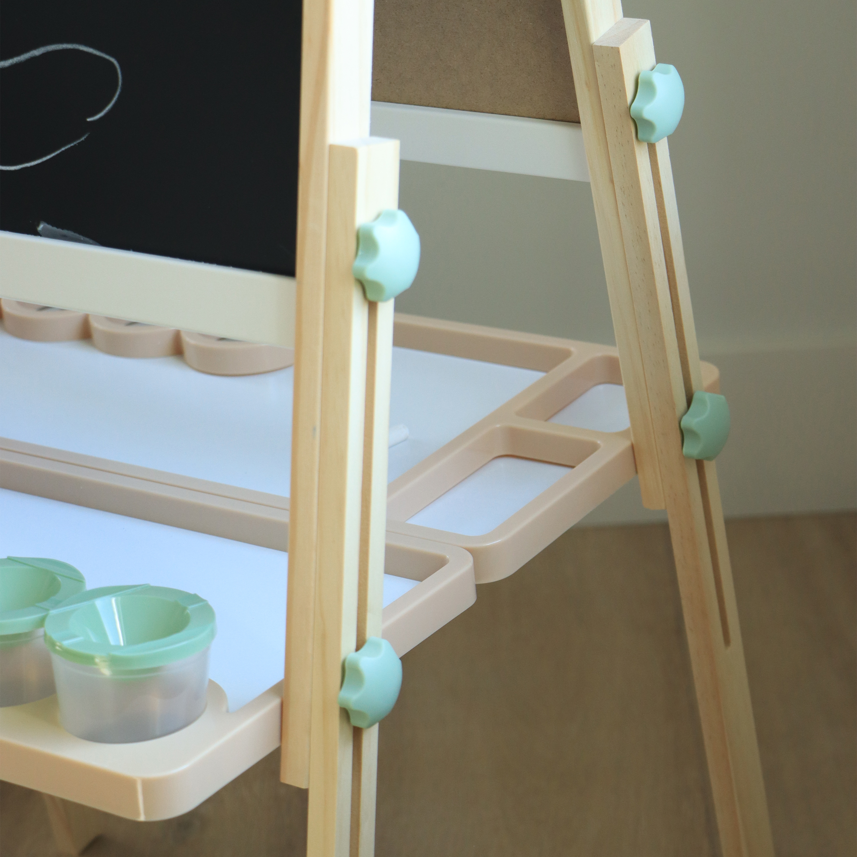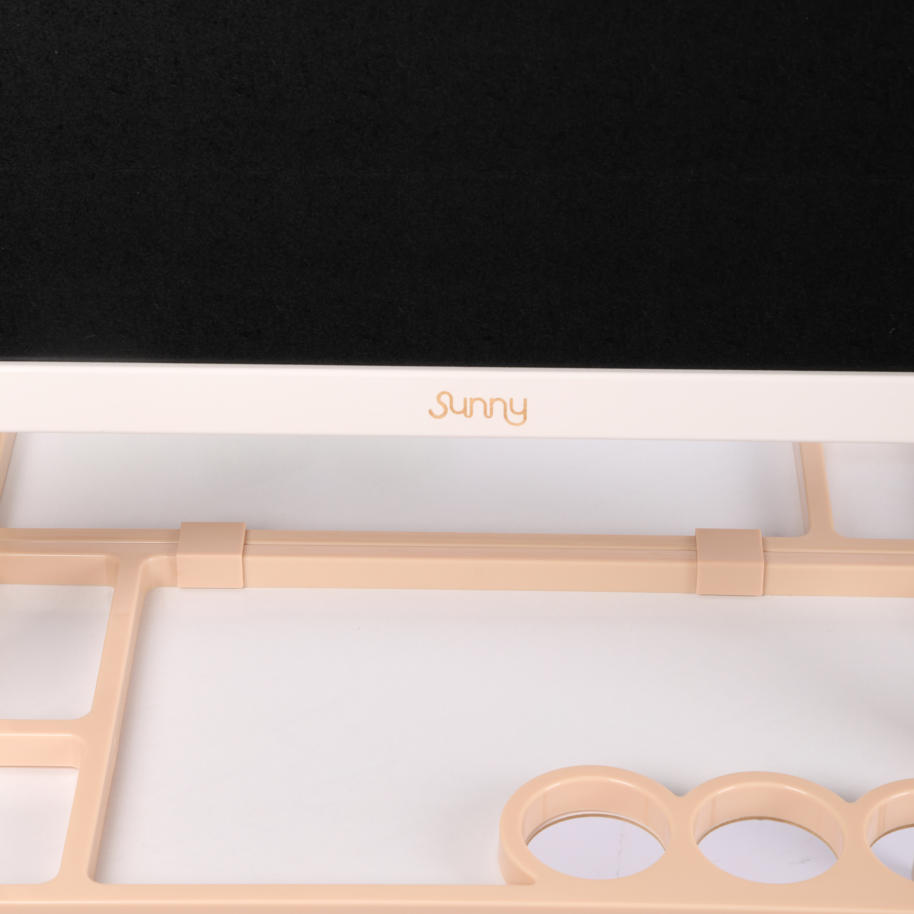 Dankzij de verstelbare hoogte groeit de Sunny Luna mee met je kindje – jarenlang speel- en leerplezier gegarandeerd! Het brede werkblad onder het bord is voorzien van handige bekerhouders en vakjes, perfect voor stiften, kwasten en krijtjes. Zo blijft alles netjes bij elkaar en binnen handbereik.