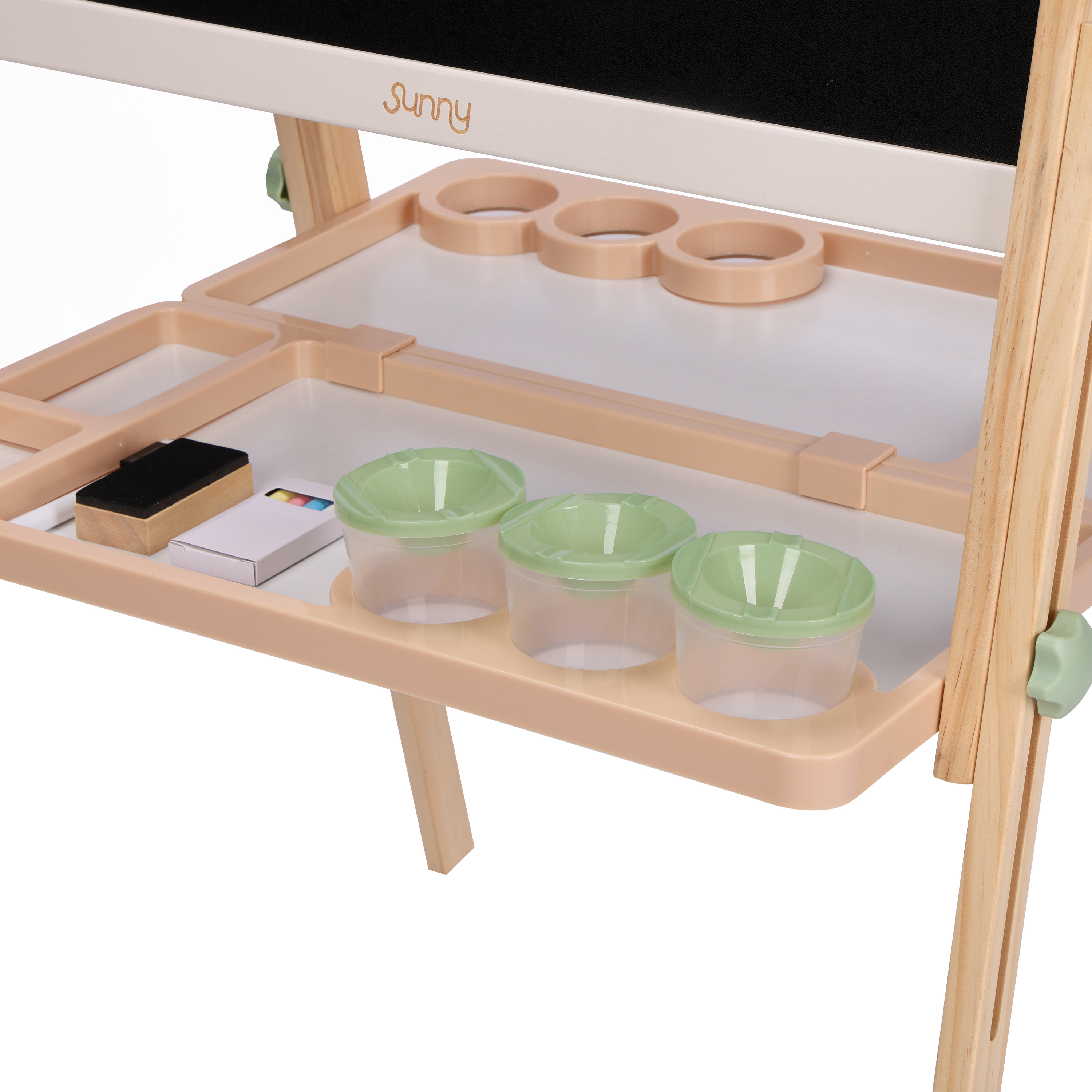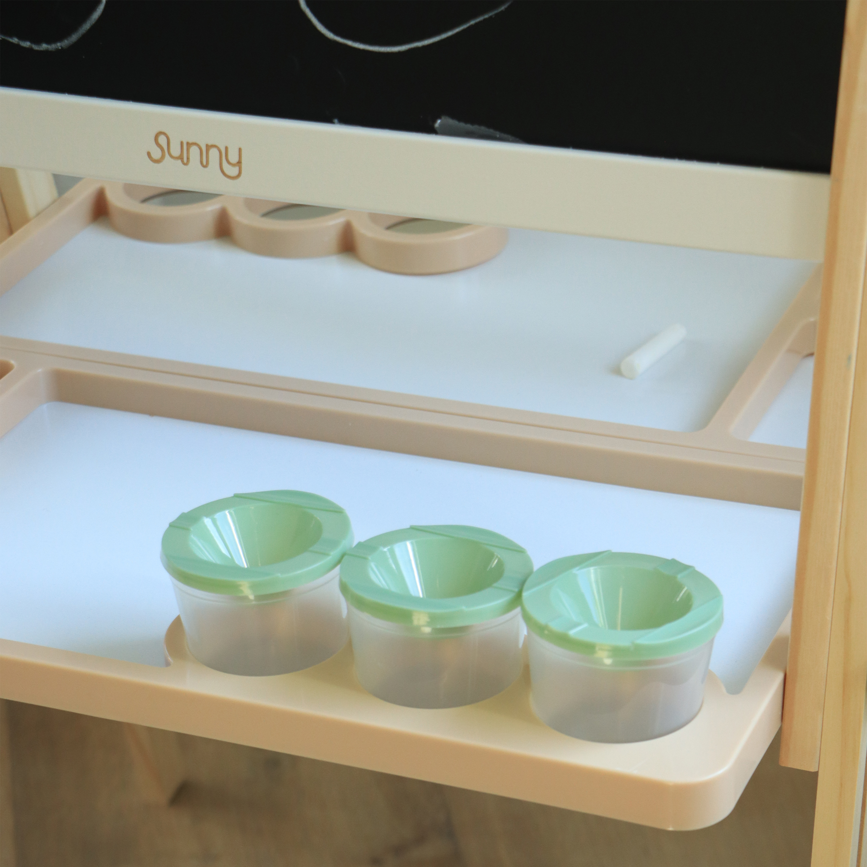 De Sunny Luna wordt geleverd met een papierrol, bekers en verschillende accessoires, zodat je kindje direct aan de slag kan. Met zijn stevige houten frame en slimme indeling past de ezel in elke speelkamer, woonkamer of zelfs in de tuin op een zonnige dag.