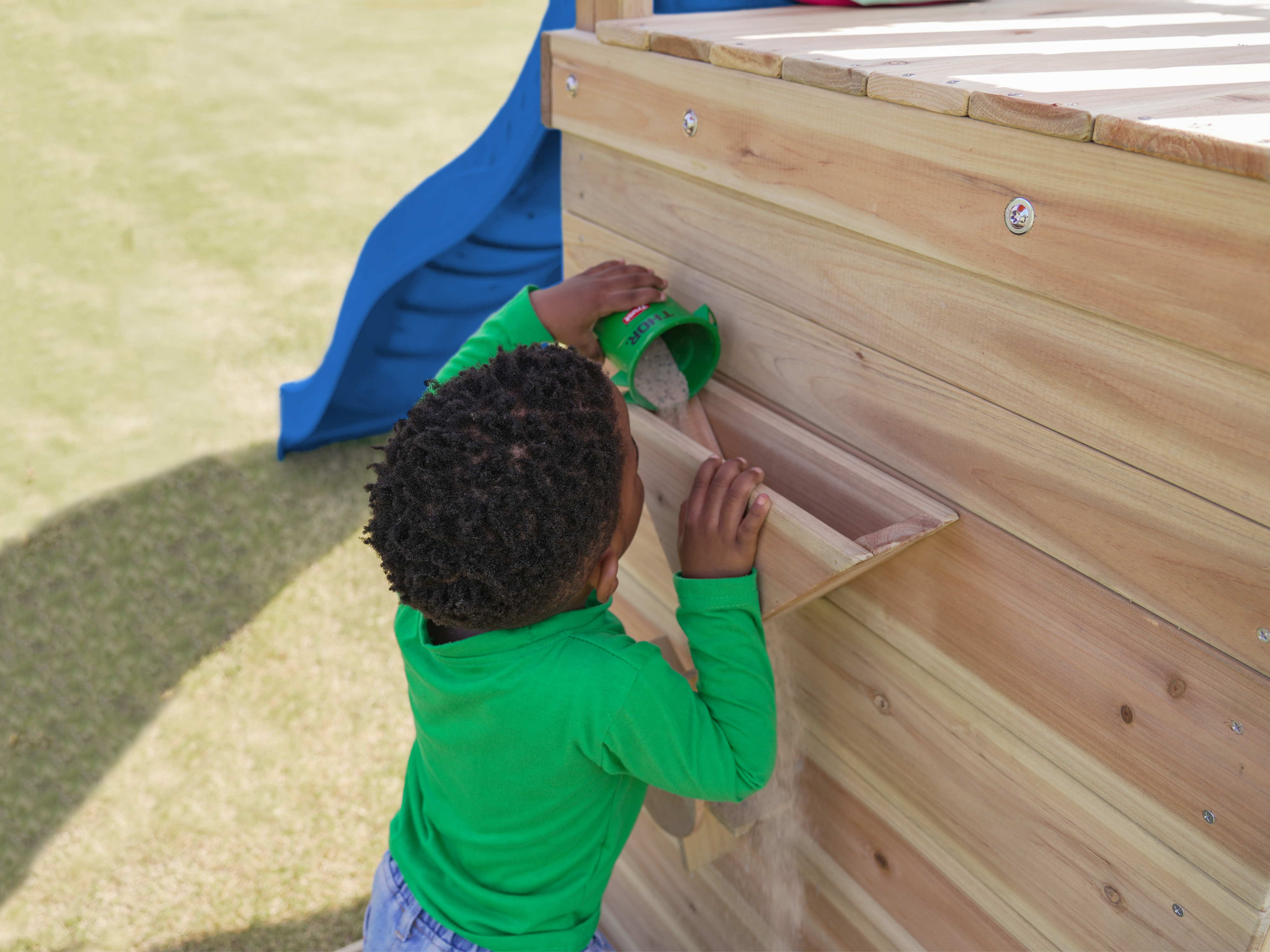 Via de trap betreden kinderen de toren, waar ze worden getrakteerd op een adembenemend uitzicht over de hele tuin. Wanneer het tijd is om af te dalen, biedt de lange glijbaan een snelle en moeiteloze weg naar beneden. De glijbaan is voorzien van een wateraansluiting die eenvoudig doorgeboord kan worden. Zo kan je op warme zonnige dagen ook nog eens genieten van heel veel waterpret! Naast de speeltoren bevindt zich een zandbak met een speciale speelwand die overdekt is met een luifel. Hier kunnen kinderen zand gieten in de bak van de speelwand en draaien aan het rad of lekkere zandtaartjes bakken.