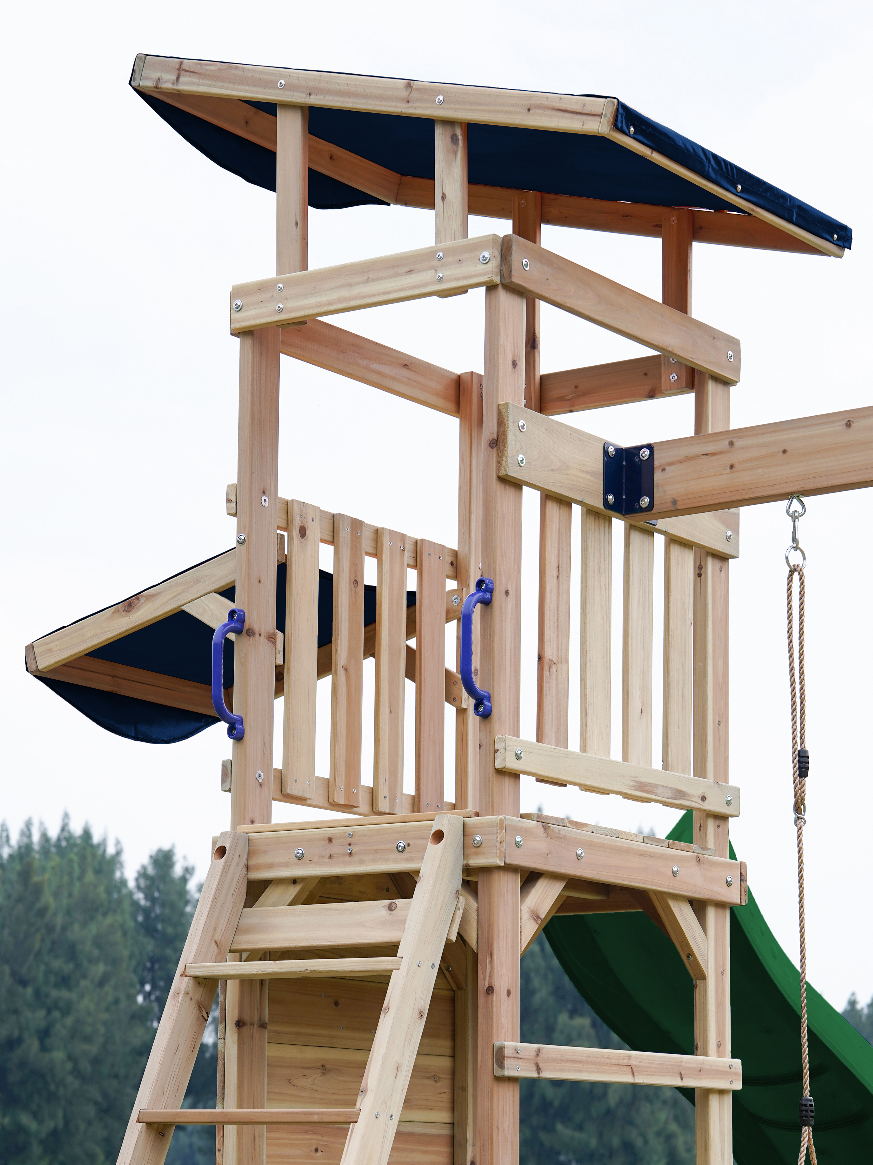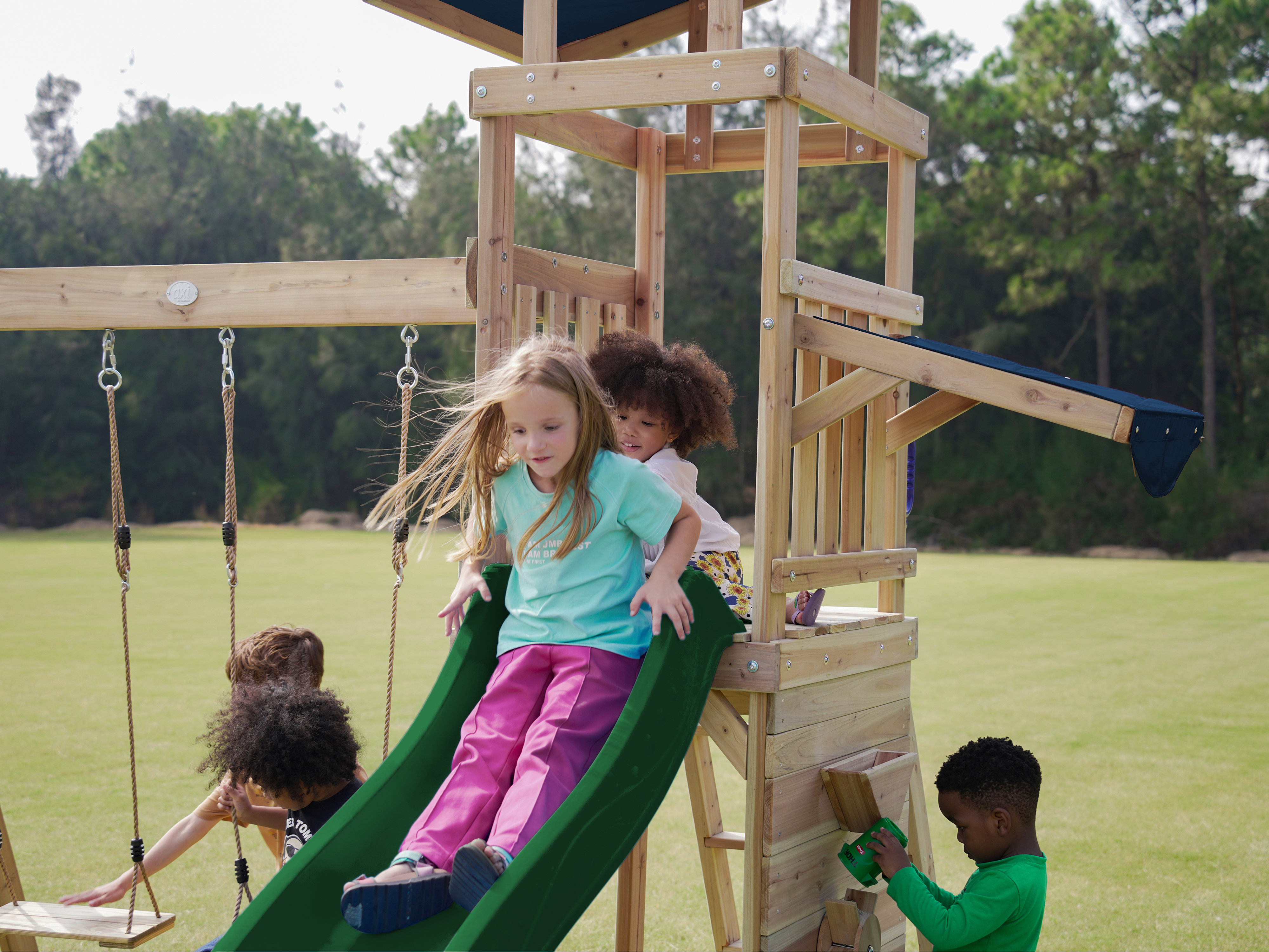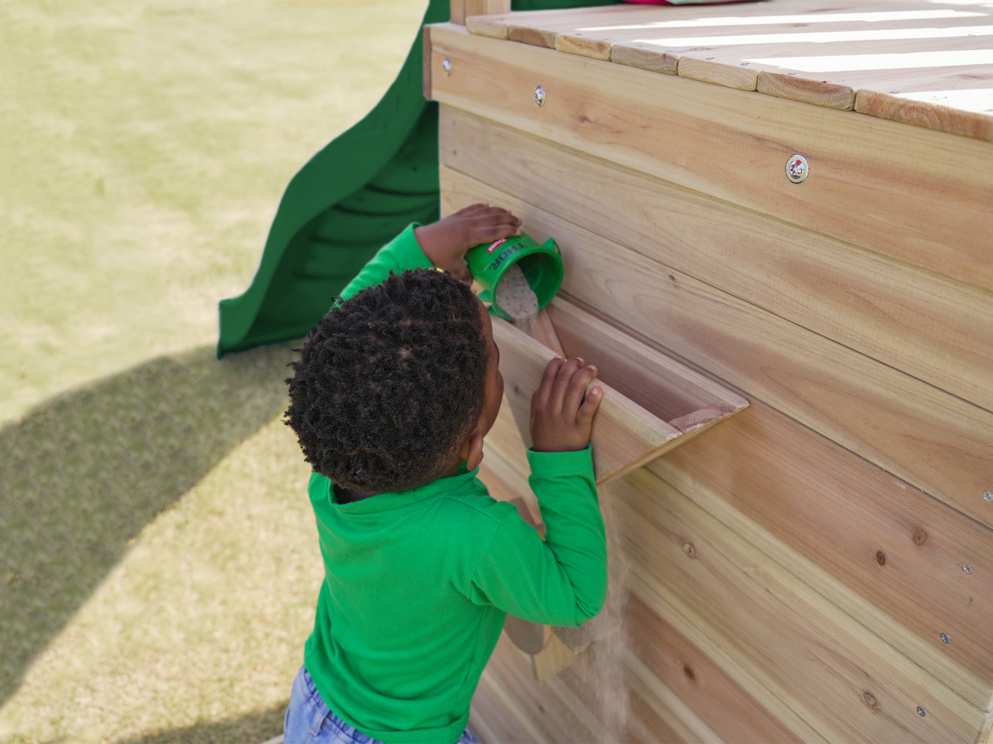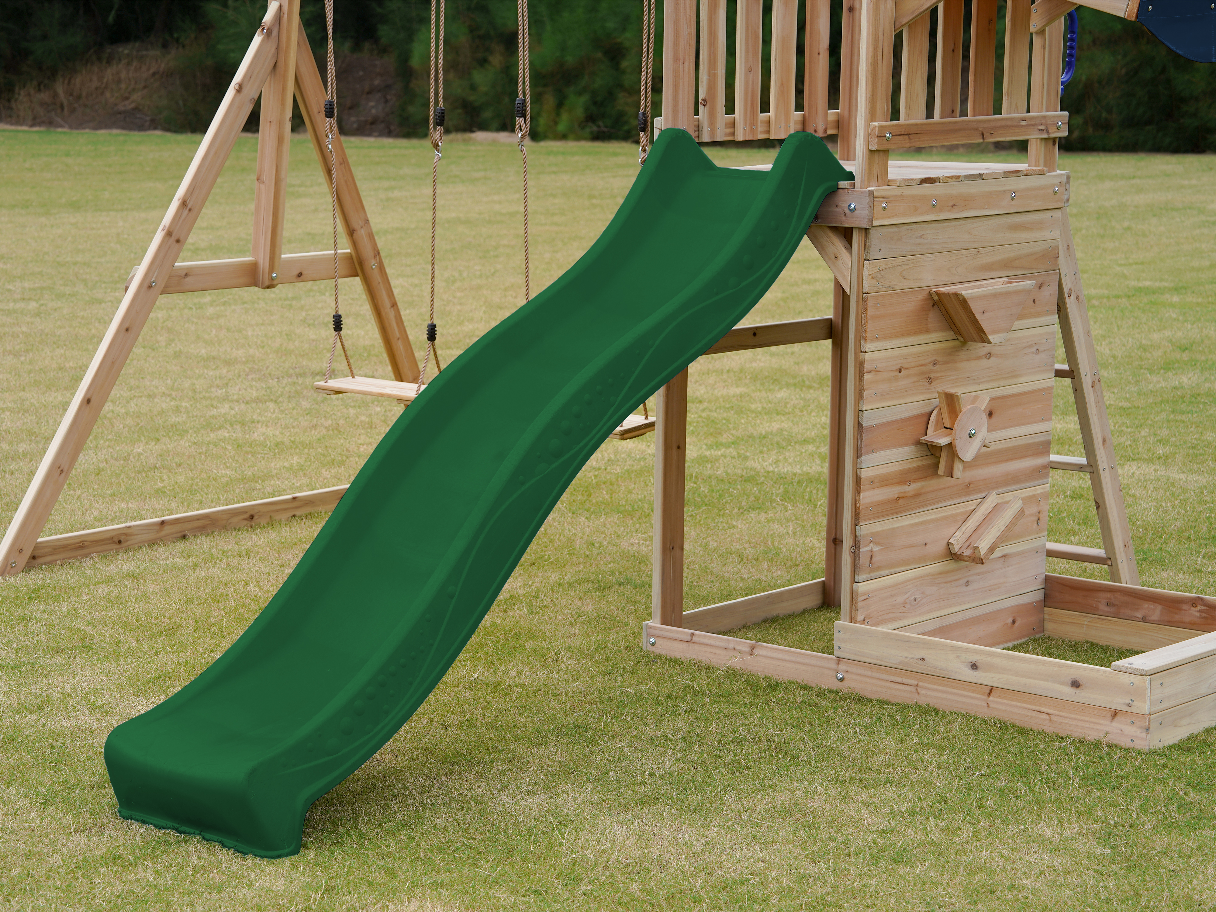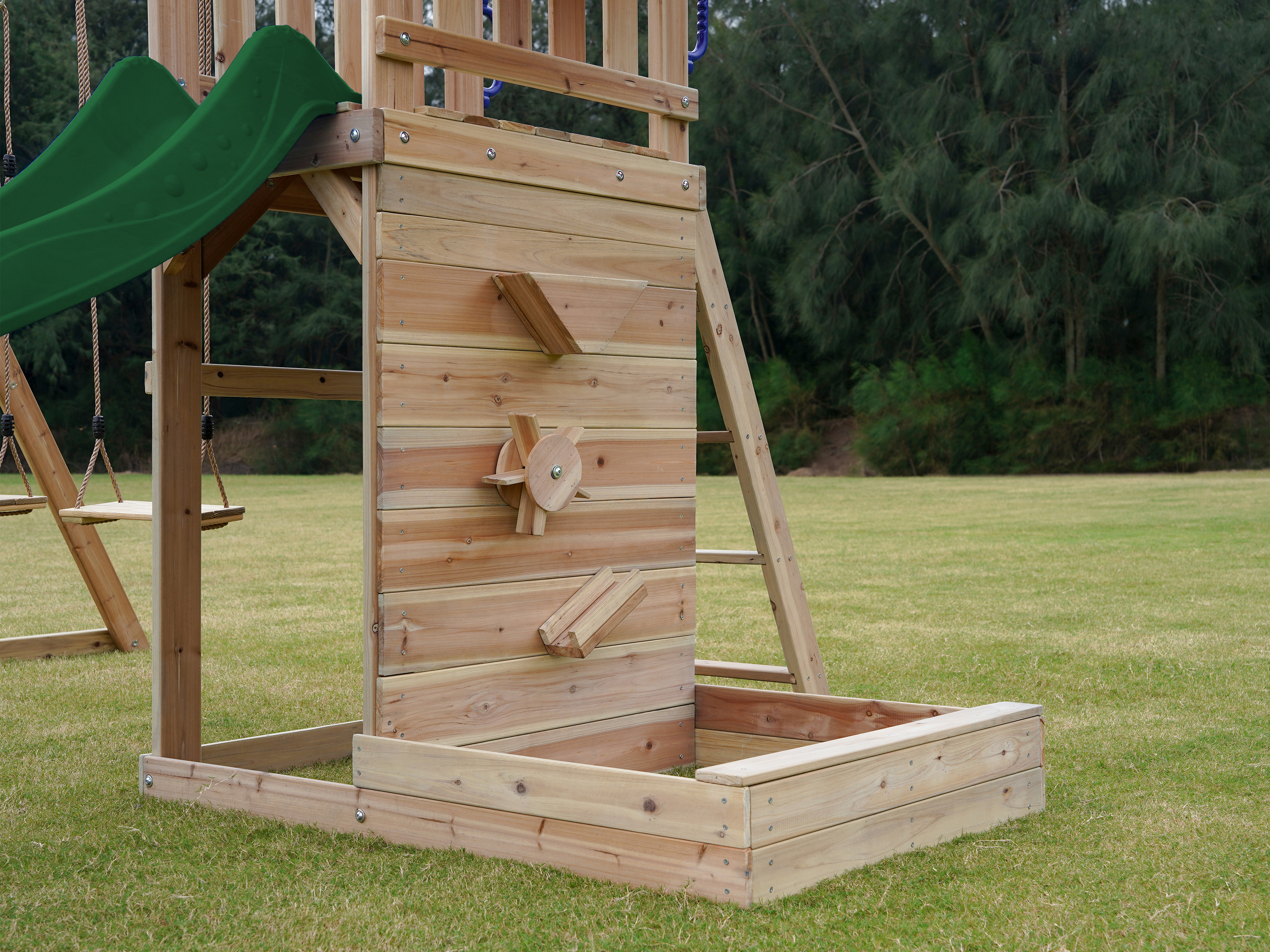 Via de trap betreden kinderen de toren, waar ze worden getrakteerd op een adembenemend uitzicht over de hele tuin. Wanneer het tijd is om af te dalen, biedt de lange glijbaan een snelle en moeiteloze weg naar beneden. De glijbaan is voorzien van een wateraansluiting die eenvoudig doorgeboord kan worden. Zo kan je op warme zonnige dagen ook nog eens genieten van heel veel waterpret! Naast de speeltoren bevindt zich een zandbak met een speciale speelwand die overdekt is met een luifel. Hier kunnen kinderen zand gieten in de bak van de speelwand en draaien aan het rad of lekkere zandtaartjes bakken.