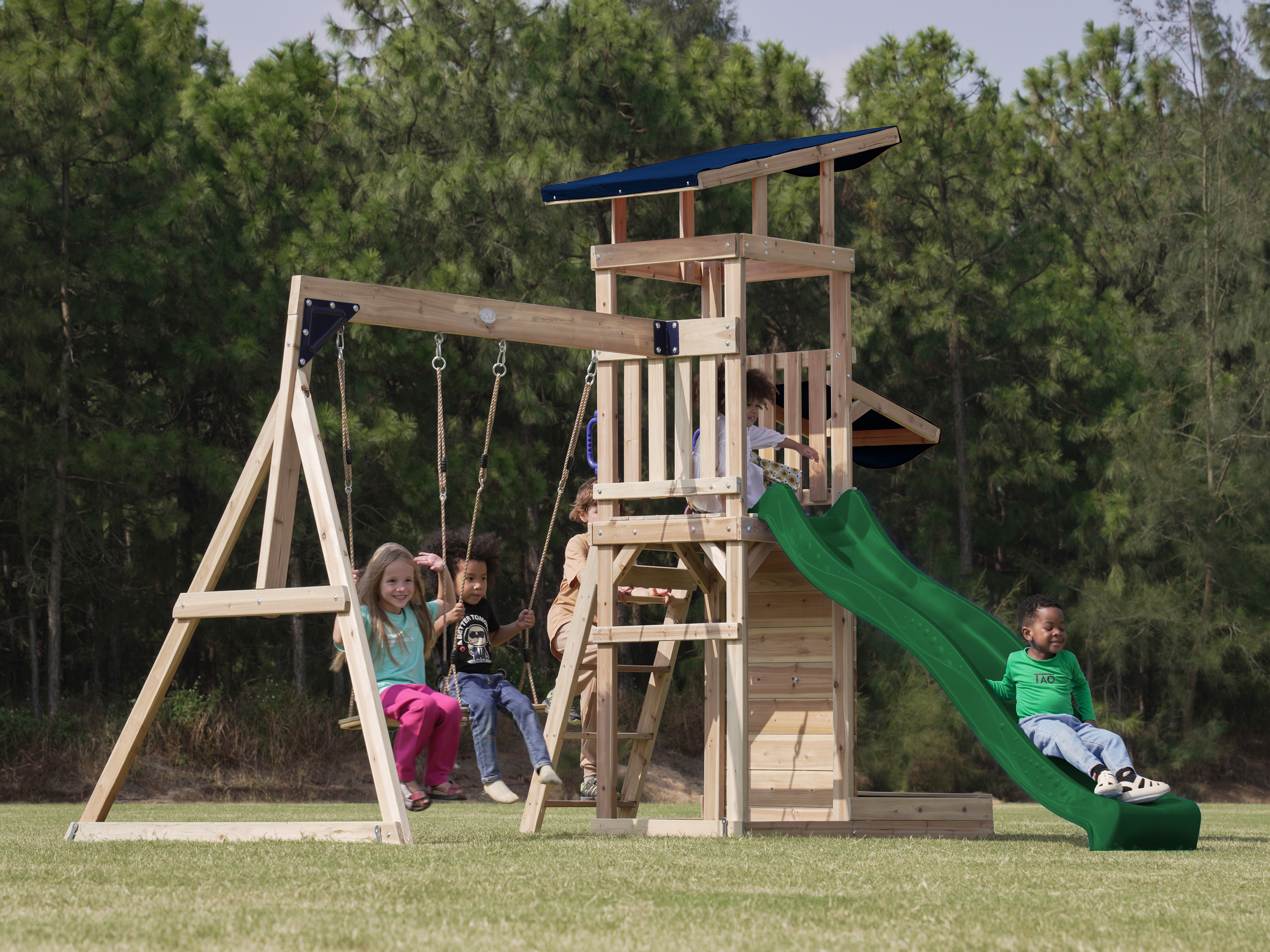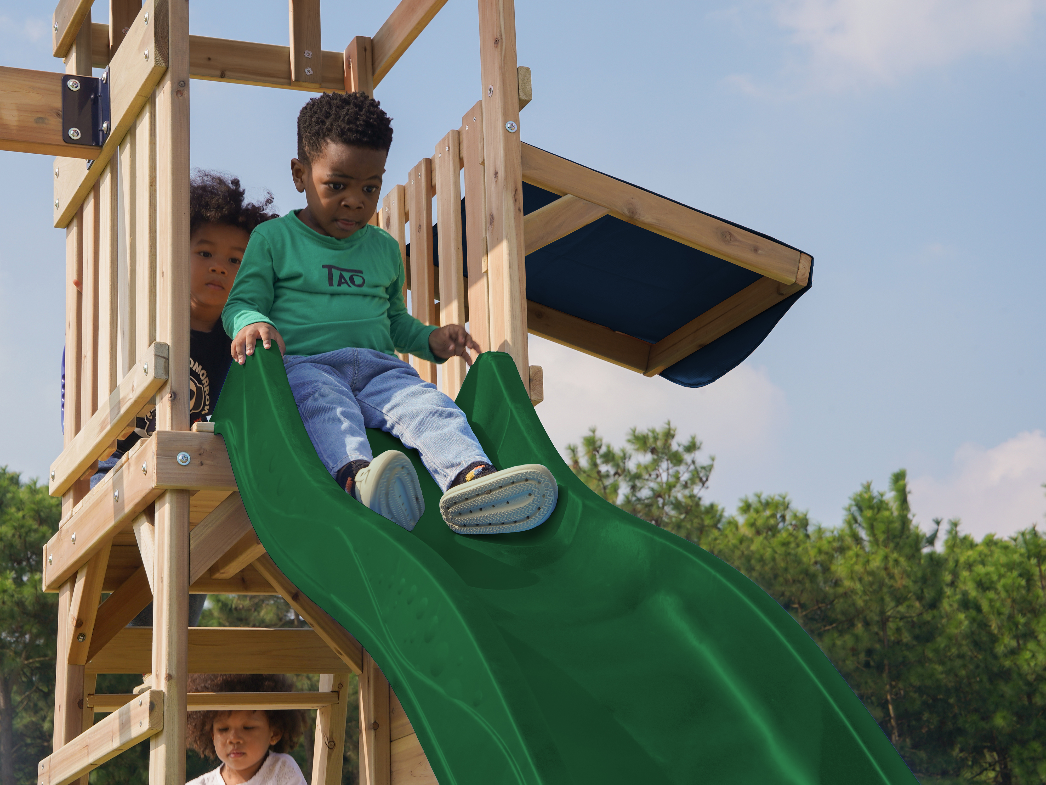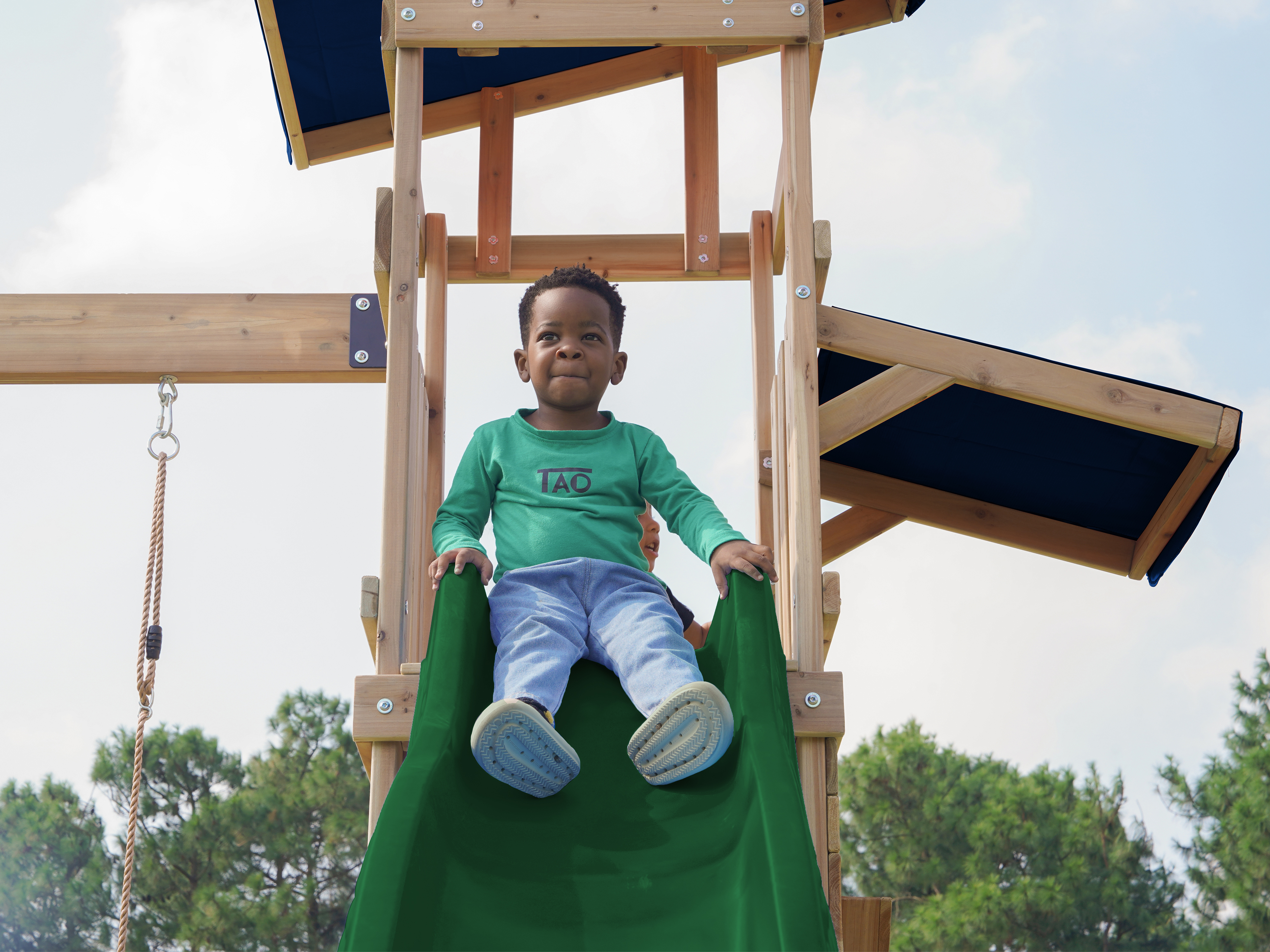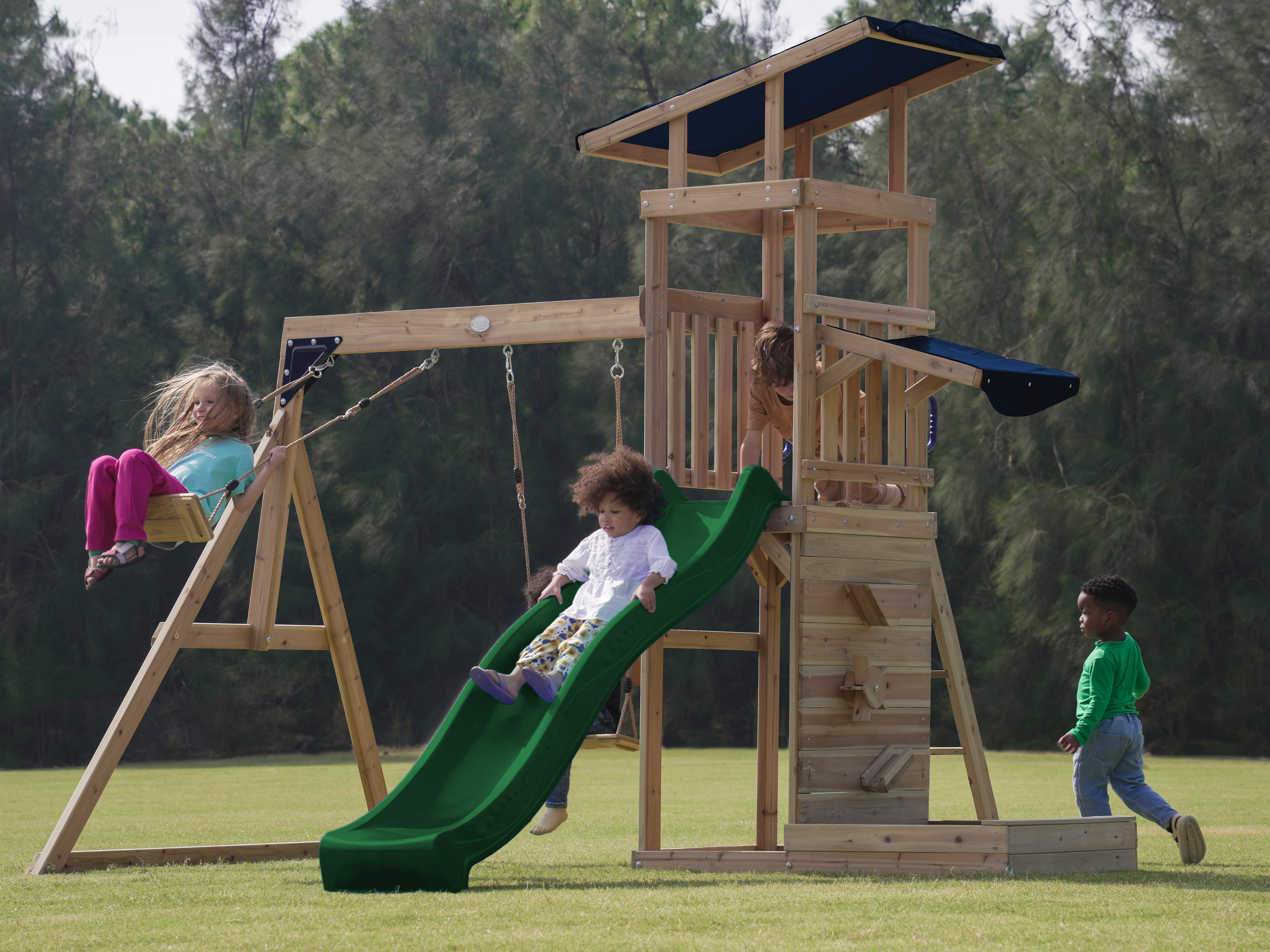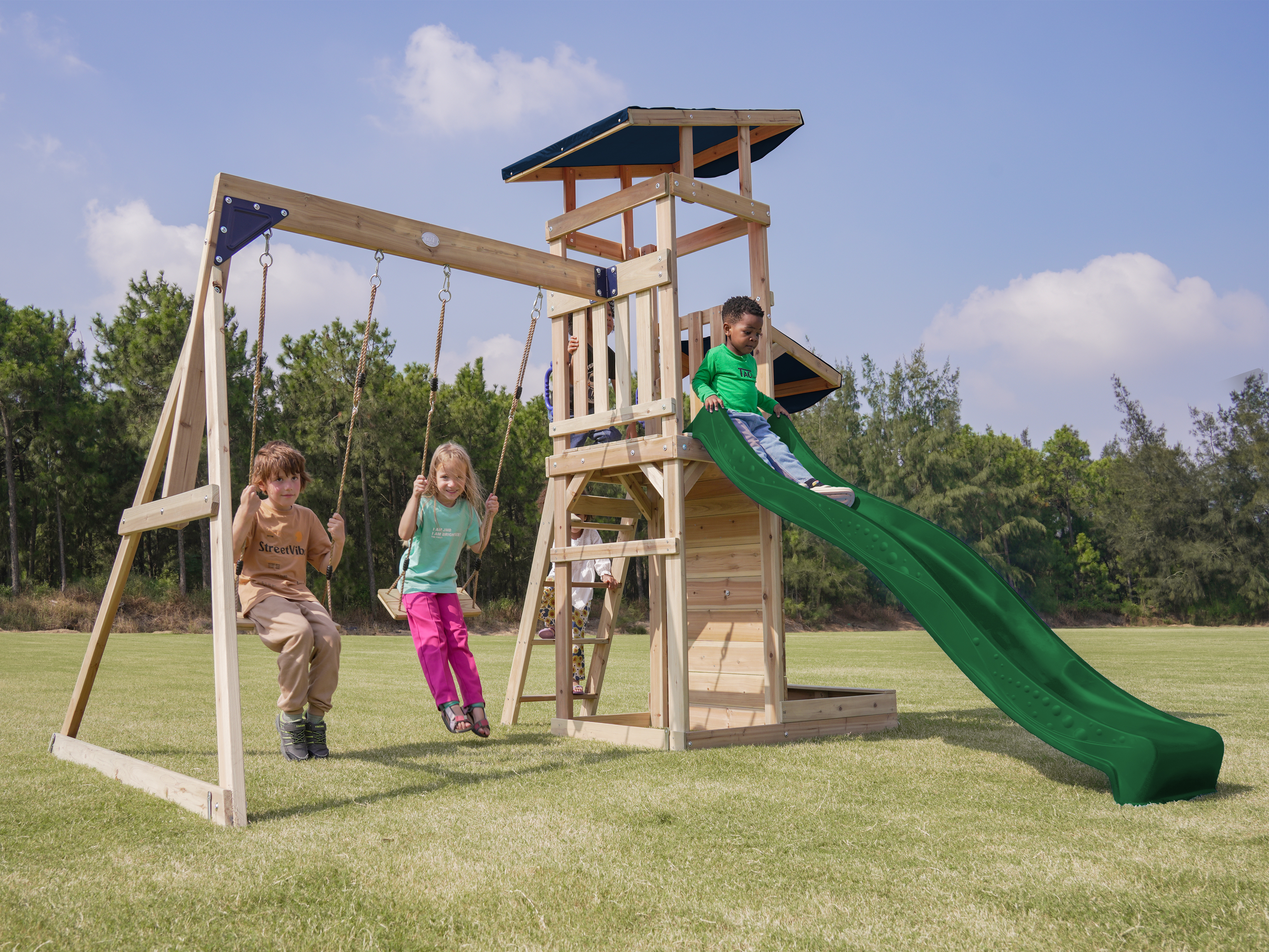 Via de trap betreden kinderen de toren, waar ze worden getrakteerd op een adembenemend uitzicht over de hele tuin. Wanneer het tijd is om af te dalen, biedt de lange glijbaan een snelle en moeiteloze weg naar beneden. De glijbaan is voorzien van een wateraansluiting die eenvoudig doorgeboord kan worden. Zo kan je op warme zonnige dagen ook nog eens genieten van heel veel waterpret! Naast de speeltoren bevindt zich een zandbak met een speciale speelwand die overdekt is met een luifel. Hier kunnen kinderen zand gieten in de bak van de speelwand en draaien aan het rad of lekkere zandtaartjes bakken.