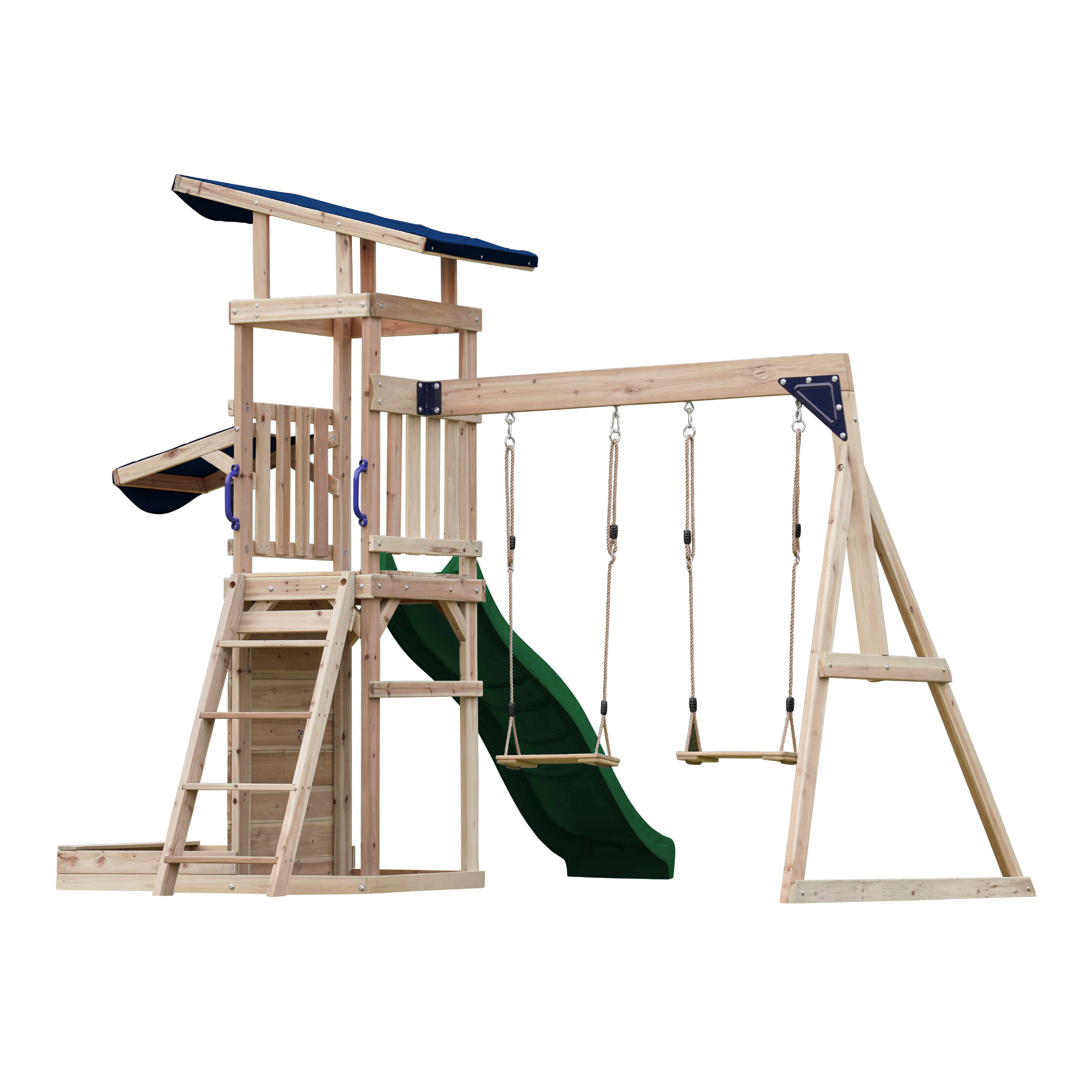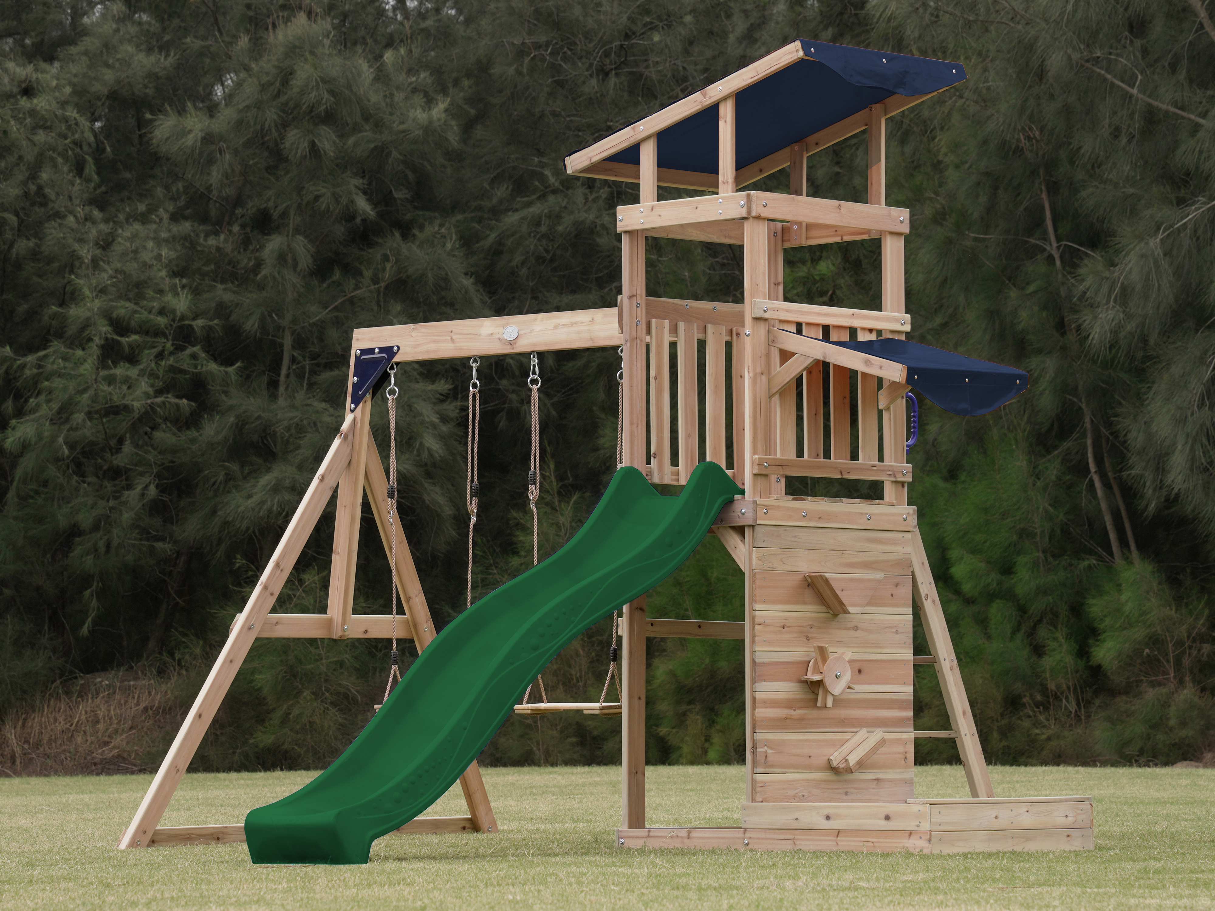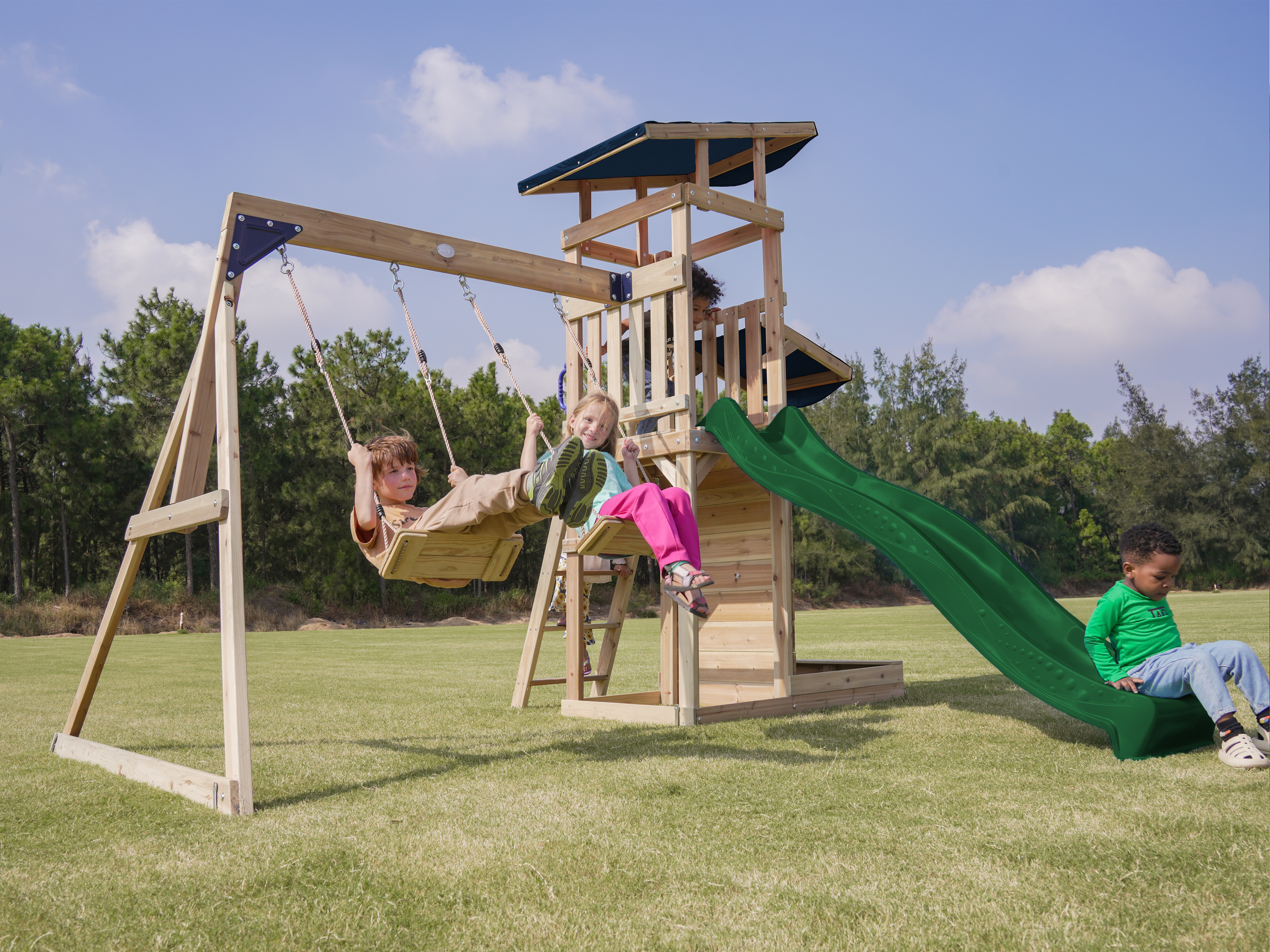 Productinformatie "Malik Speeltoestel met Schommel Bruin - Groene Glijbaan"