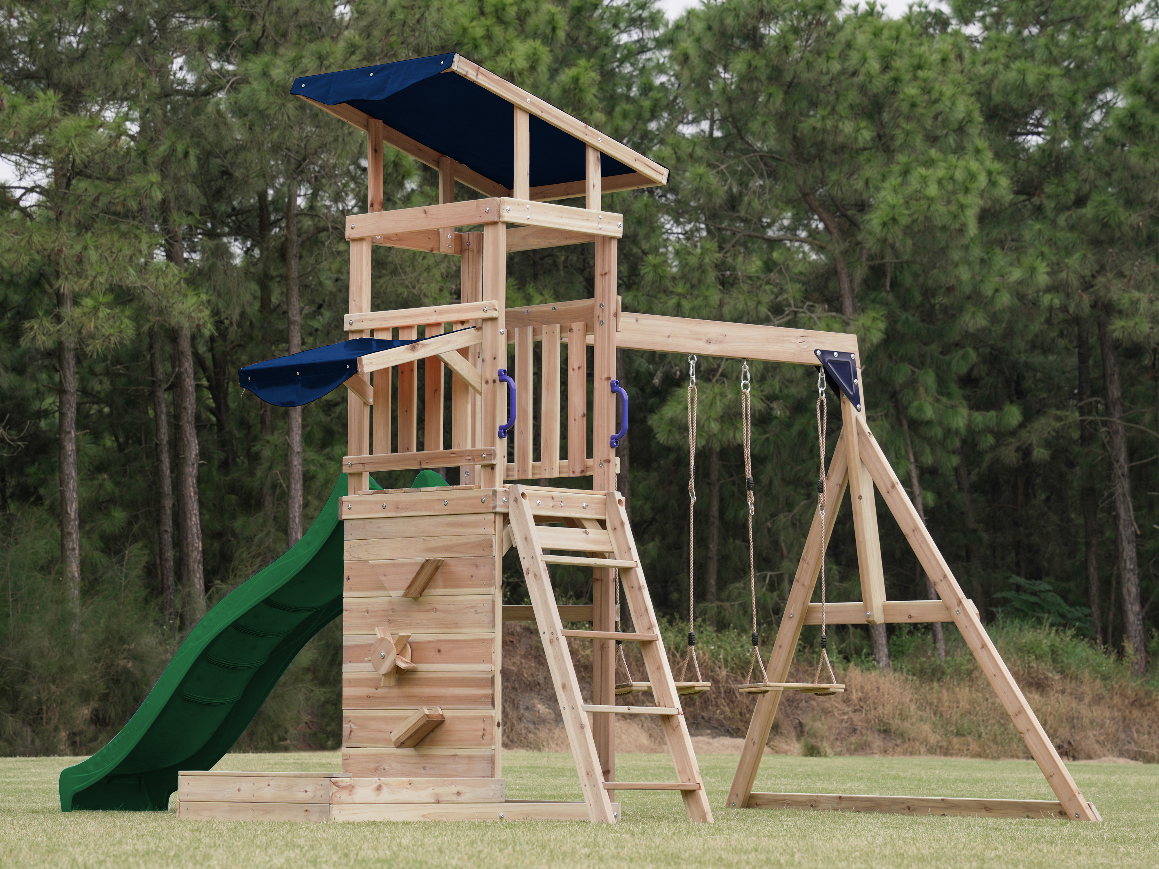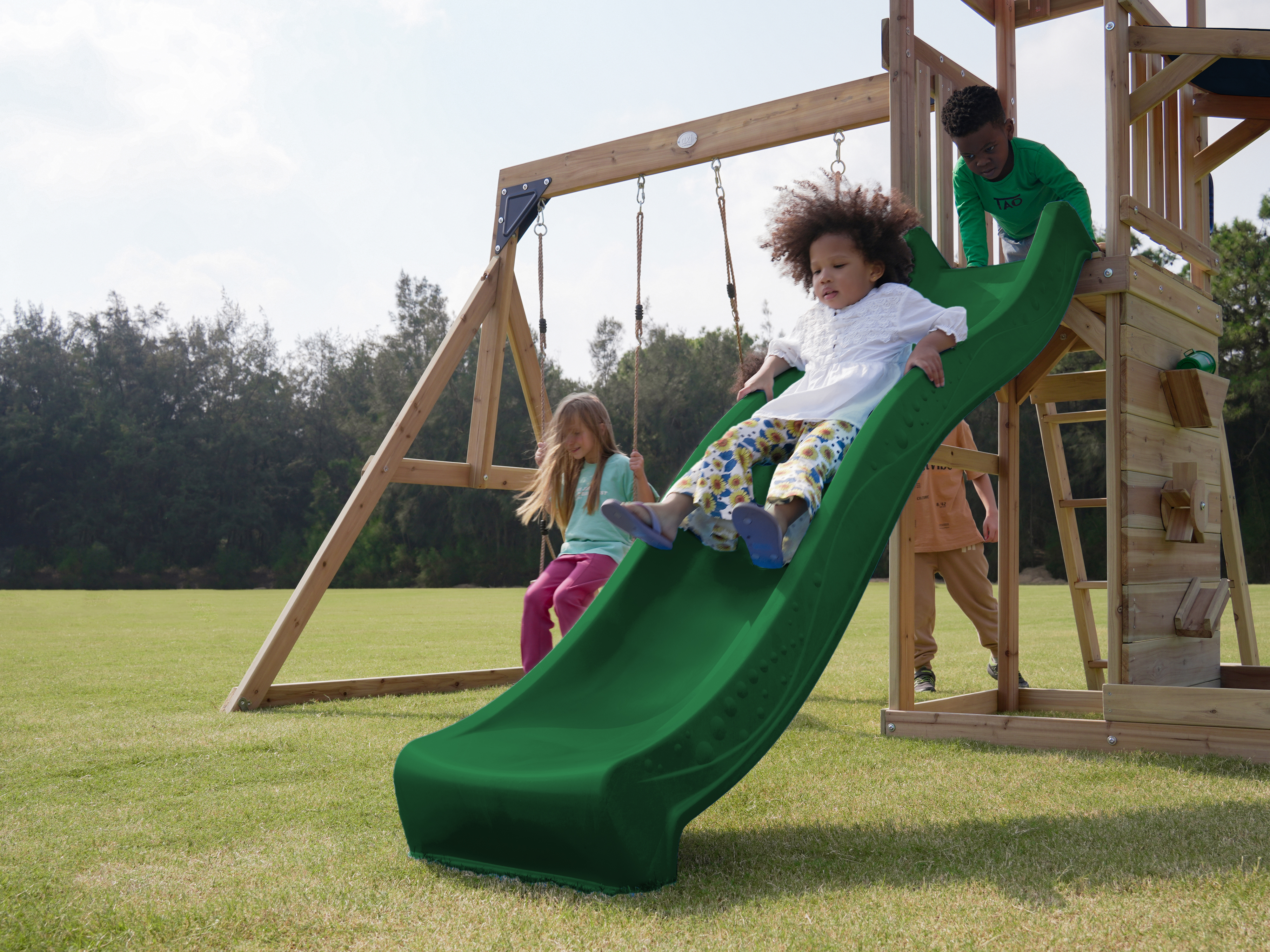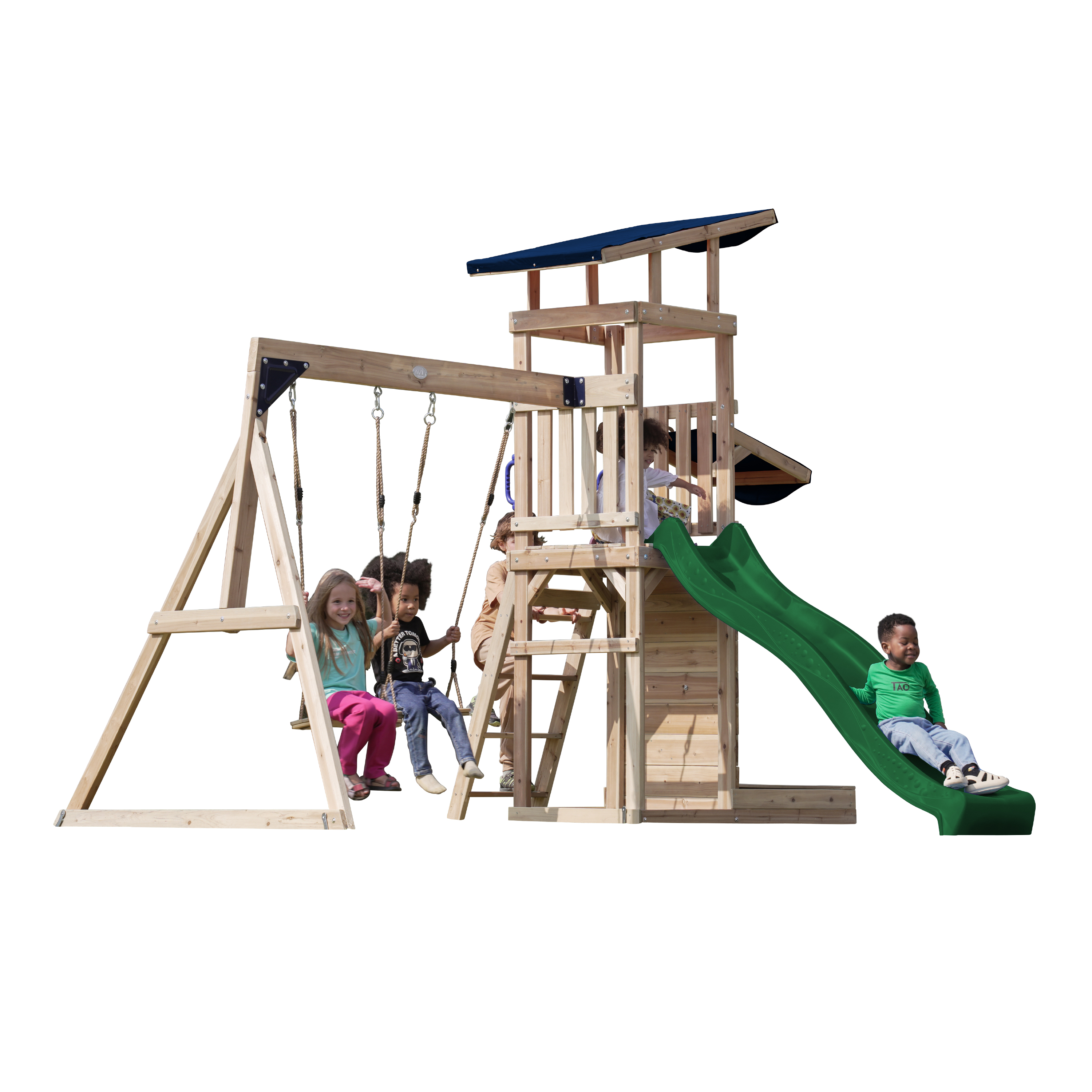 Productinformatie "Malik Speeltoestel met Schommel Bruin - Groene Glijbaan"