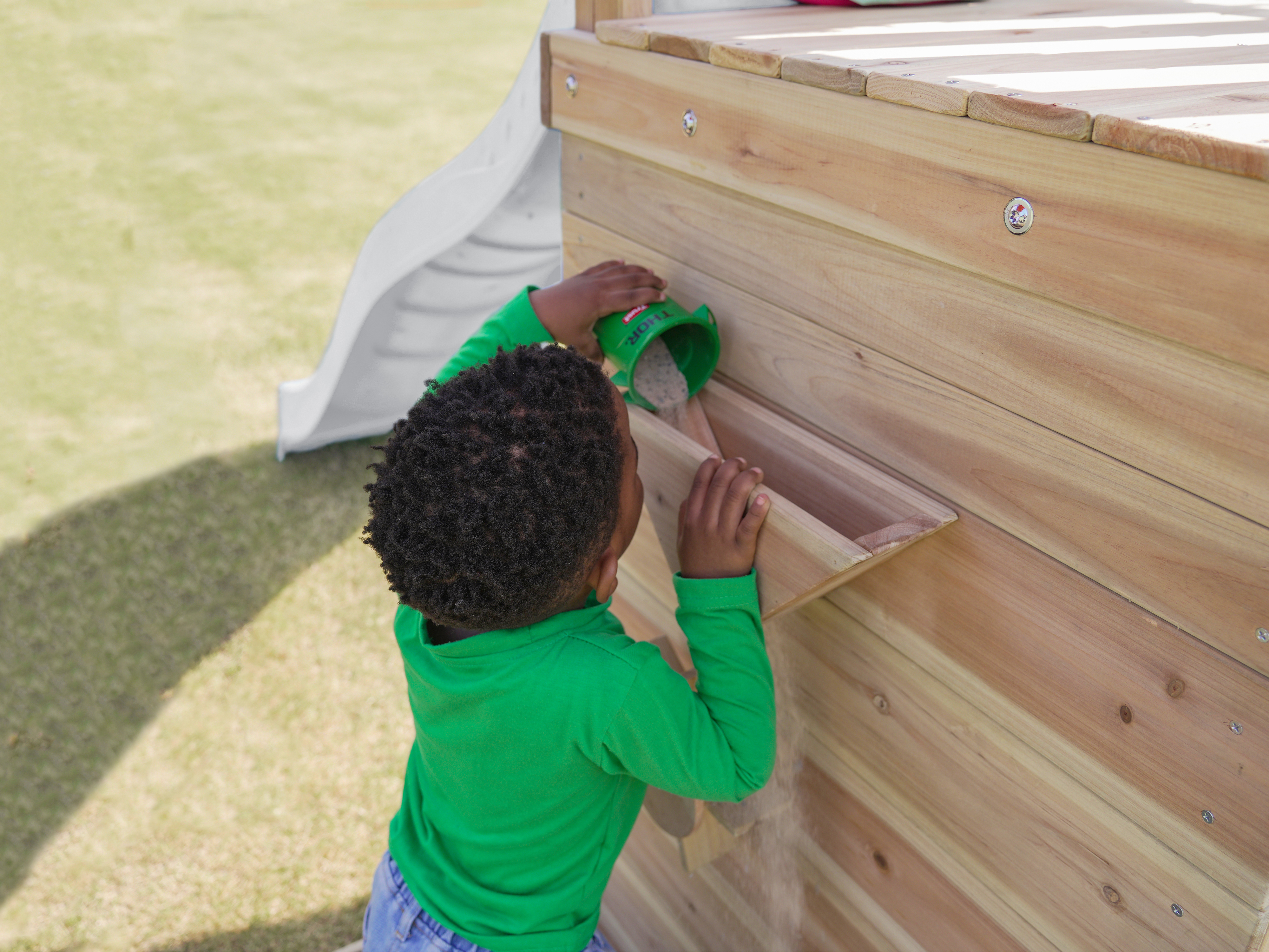 Via de trap betreden kinderen de toren, waar ze worden getrakteerd op een adembenemend uitzicht over de hele tuin. Wanneer het tijd is om af te dalen, biedt de lange glijbaan een snelle en moeiteloze weg naar beneden. De glijbaan is voorzien van een wateraansluiting die eenvoudig doorgeboord kan worden. Zo kan je op warme zonnige dagen ook nog eens genieten van heel veel waterpret! Naast de speeltoren bevindt zich een zandbak met een speciale speelwand die overdekt is met een luifel. Hier kunnen kinderen zand gieten in de bak van de speelwand en draaien aan het rad of lekkere zandtaartjes bakken.