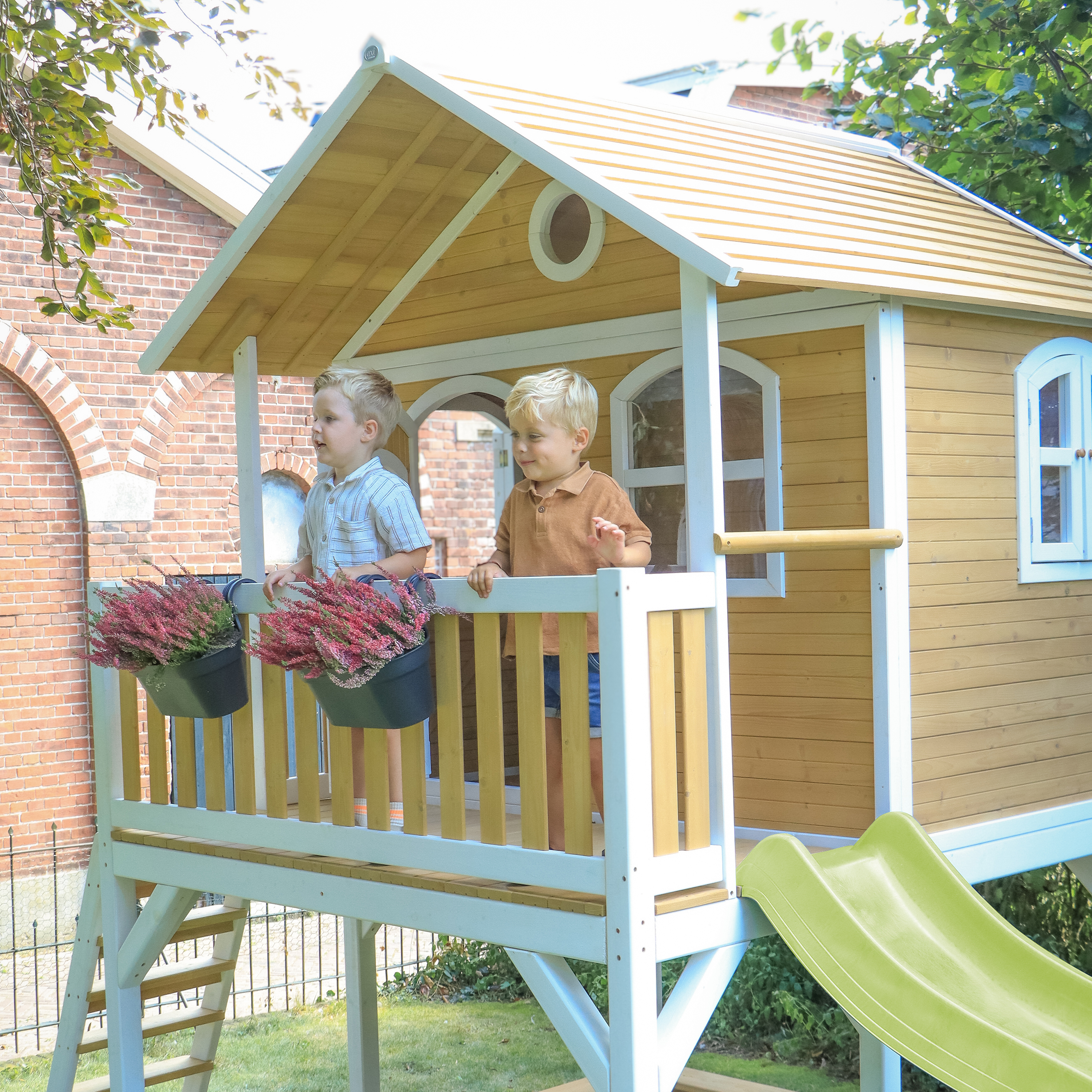 Marc Speelhuis Bruin/wit van AXI heeft echt alles wat je kinderen maar wensen kunnen! Een trap om in het huisje te klimmen en vervolgens van de lange glijbaan naar beneden te roetsjen. En dan zijn ze nog niet uitgespeeld, want onder het speelhuis is ook nog een zandbak waar ze met z'n allen zandtaartjes kunt bakken. In dit speelhuis kunnen ze elkaar de mooiste geheimen vertellen. Zodra ze de ramen en deur dicht doen, kan niemand ze meer afluisteren! Marc is een veelzijdig houten speelhuis met een halfronde deur en ramen. De deur heeft een brievenbus waar kinderen post doorheen kunnen gooien als ze postbodetje spelen. Het speelhuisje is uitgevoerd in moderne bruin/witte kleuren welke perfect in iedere hedendaagse tuin passen. Marc speelhuis heeft een platformhoogte van 118 cm en is uitgevoerd met een grote glijbaan van 228 cm lang. Het trapje en glijbaan kunnen zowel links als rechts aan het speelhuis worden bevestigd. Als de kinderen zijn uitgespeeld kan de zandbak eenvoudig worden afgedekt met de meegeleverde afdekhoes.