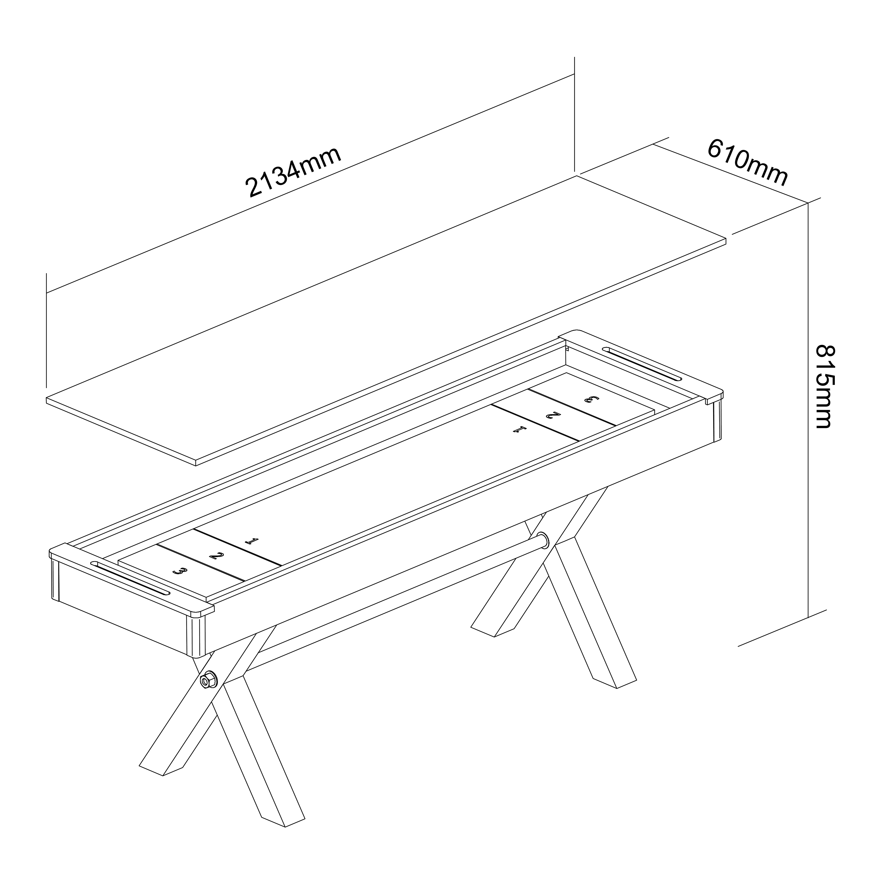 Daarnaast wordt er een tafelblad meegeleverd dat je eenvoudig op de Mason legt. Daarmee verander je het shuffleboard in een multifunctionele tafel die je ook als eettafel, werkplek of speeltafel kunt gebruiken. Ideaal voor wanneer je de ruimte in huis slim wilt benutten: overdag gebruik je de Mason als stevige tafel en ’s avonds schuif je het blad eraf en start je een potje shuffleboard. Zo heb je twee functies in één meubel en haal je nog meer plezier én gemak uit je aankoop.