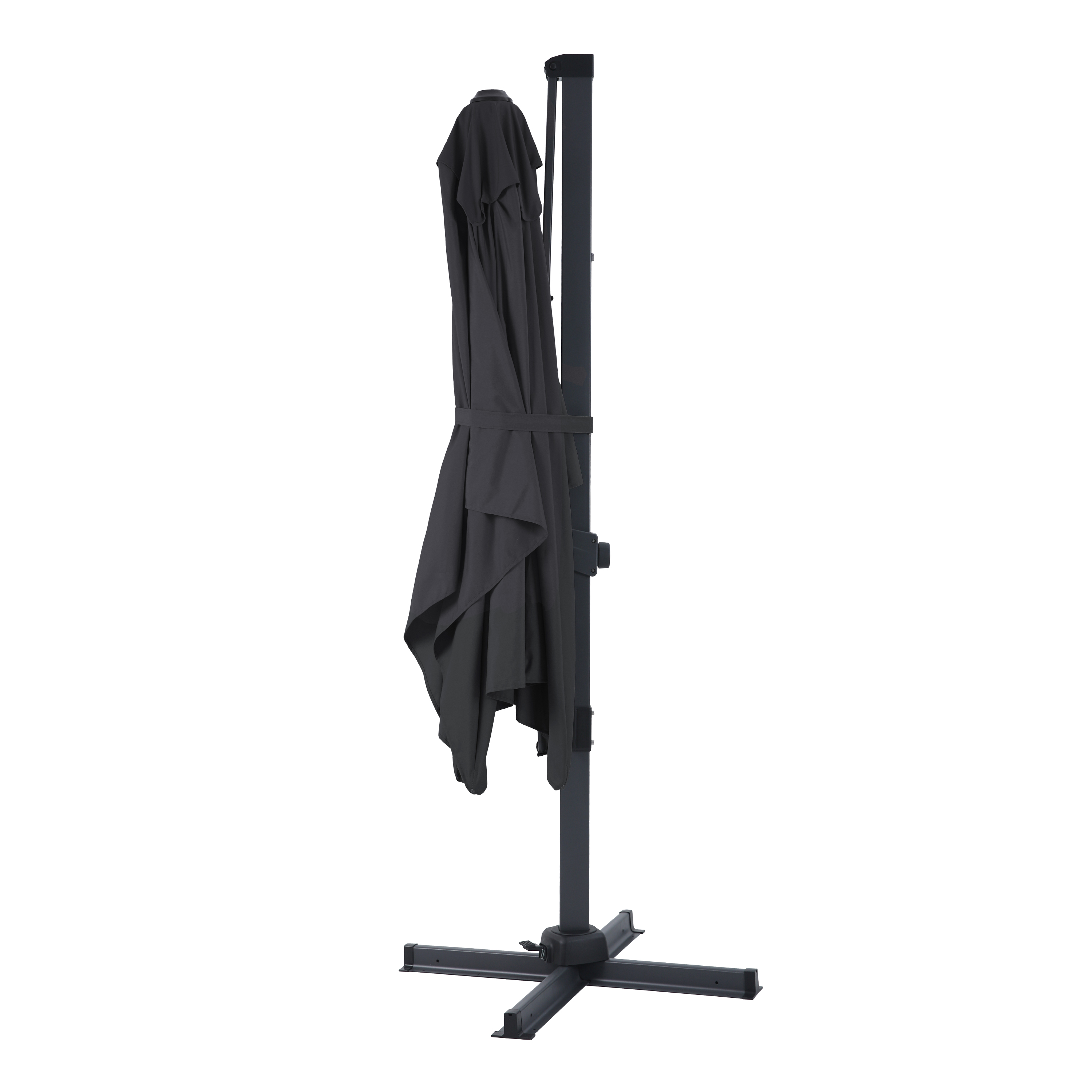 Bij de parasol wordt een praktische kruisvoet meegeleverd. Verzwaar de kruisvoet met zware tuintegels om ervoor te zorgen dat de zweefparasol stabiel blijft staan op je terras. We adviseren het gebruik van 4 zware tegels, elk met een gewicht van minimaal 20 kg. Met de bijpassende parasolhoes kan je de parasol extra beschermen tegen verschillende weersinvloeden. Om de levensduur te verlengen is het aan te raden om de parasol in extreme weersomstandigheden binnen op te slaan.