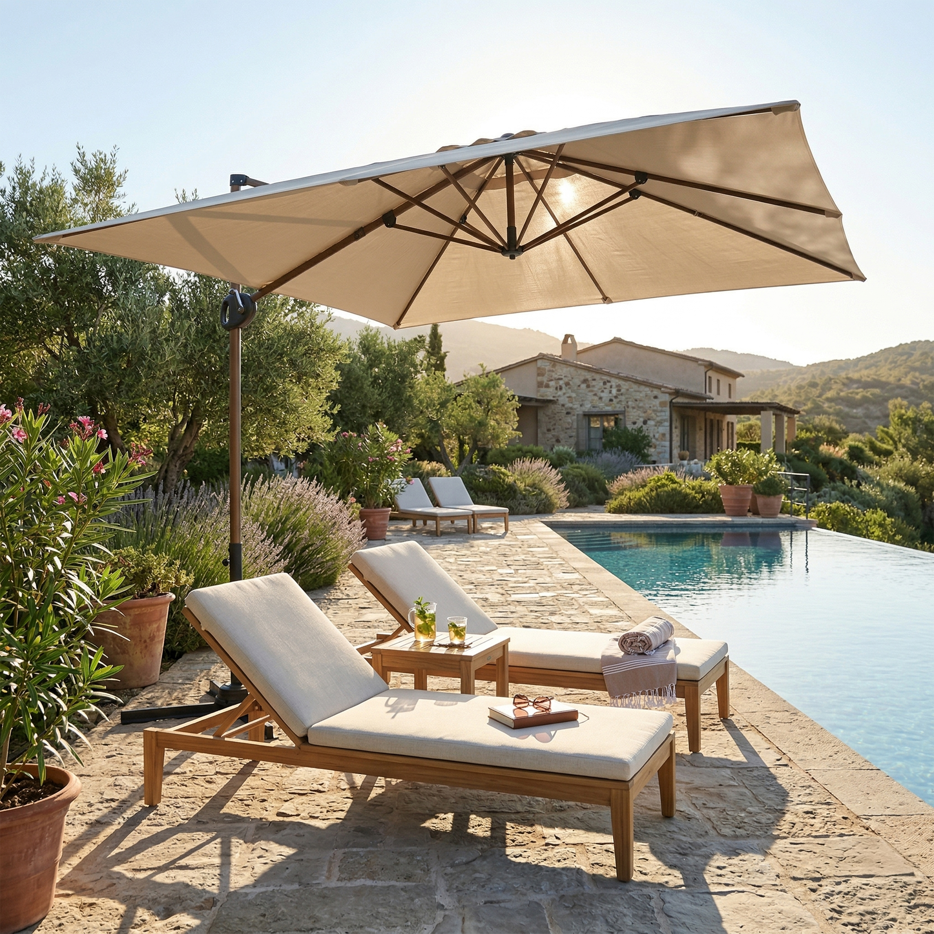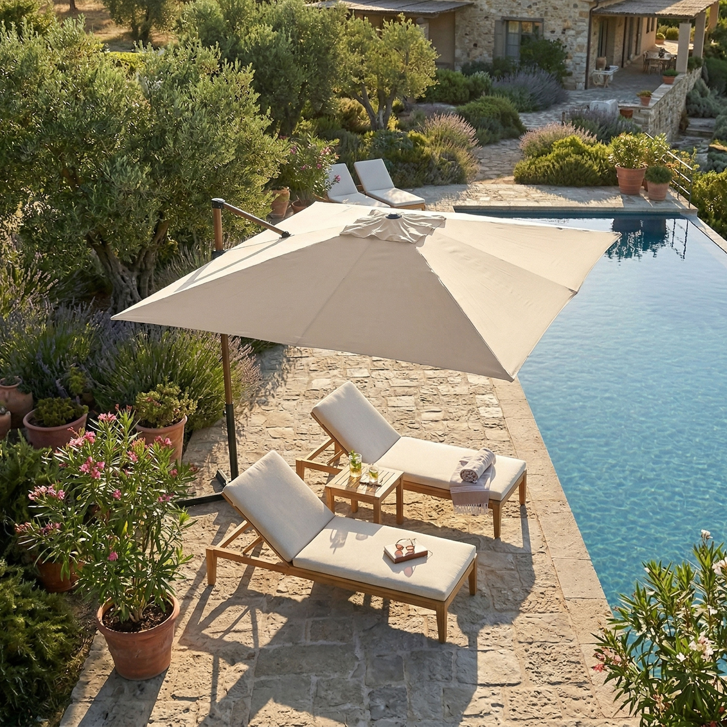 - Parasol van 300 x 300 cm voor een groot schaduwoppervlak.