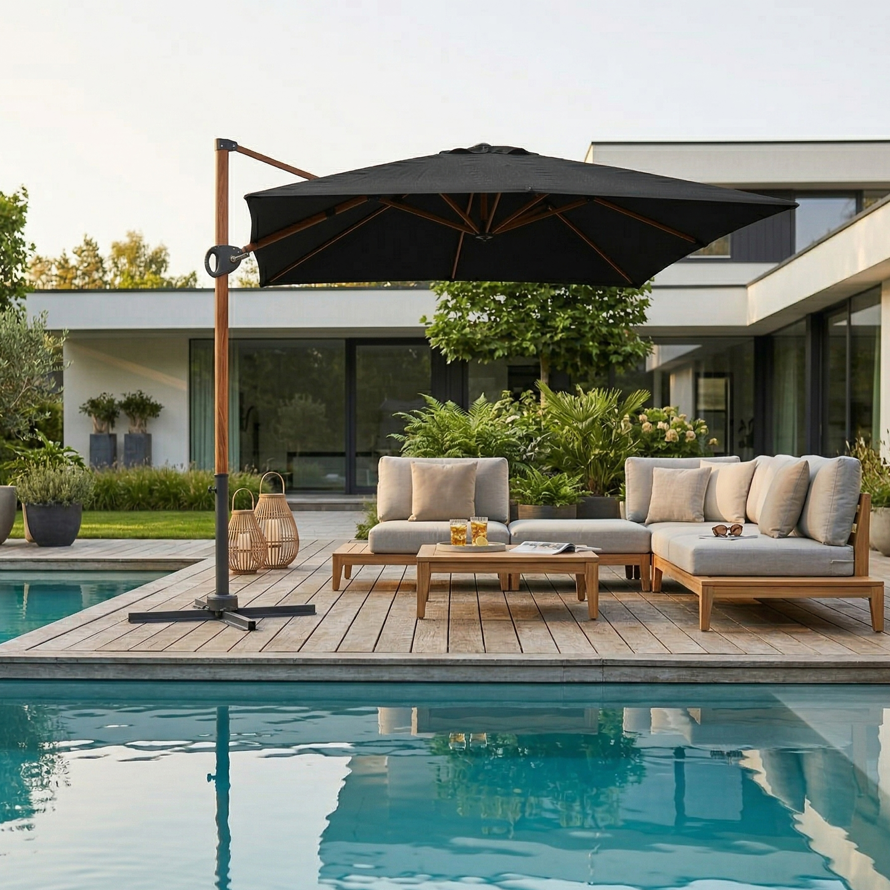 Dankzij het zwevende ontwerp heb je geen last van een middenpaal. Hierdoor blijft de ruimte onder de parasol volledig vrij en kun je je tuinmeubelen flexibel plaatsen. Perfect voor een loungeset, eettafel of ligbedden. Zo creëer je een open en ruimtelijk geheel waarin comfort centraal staat.