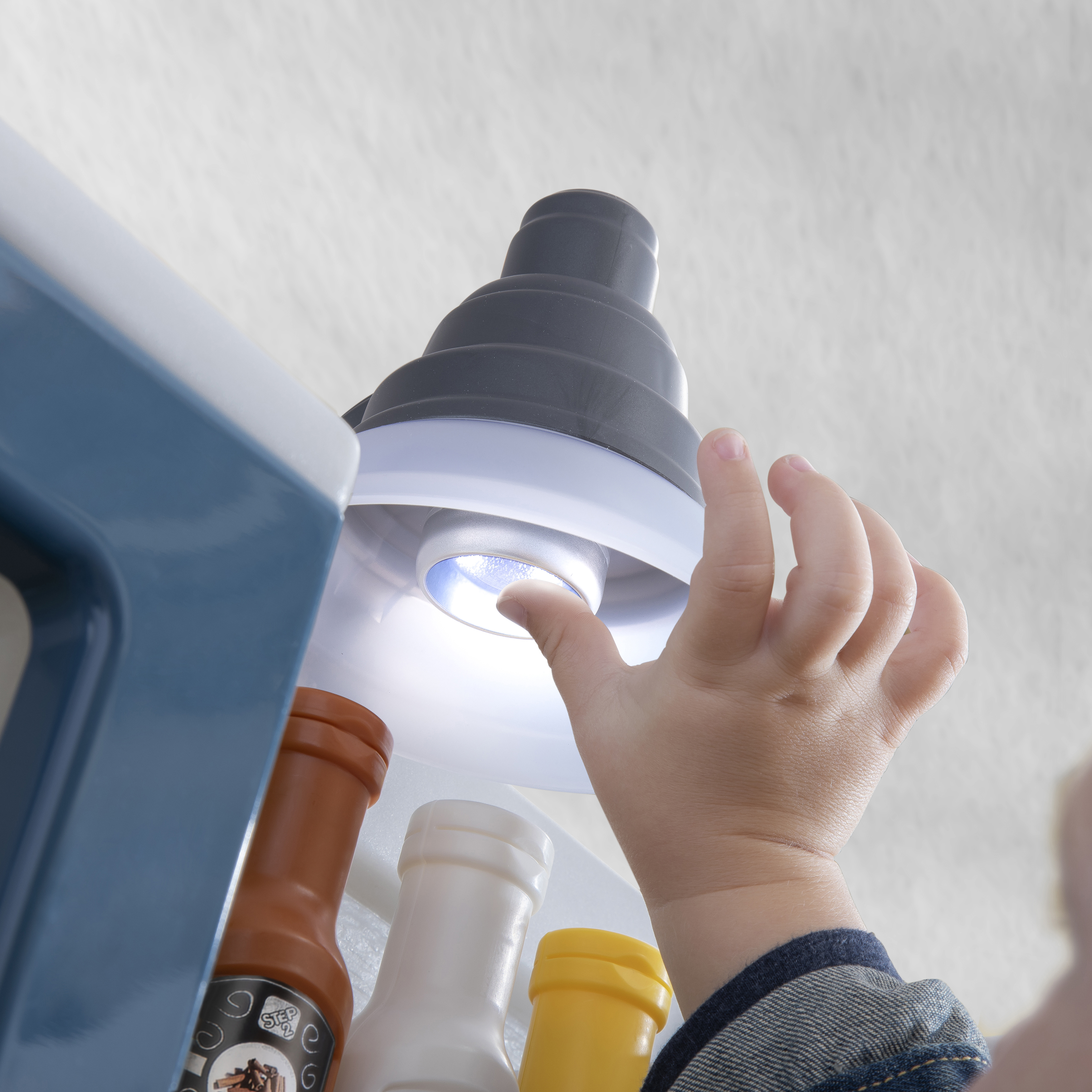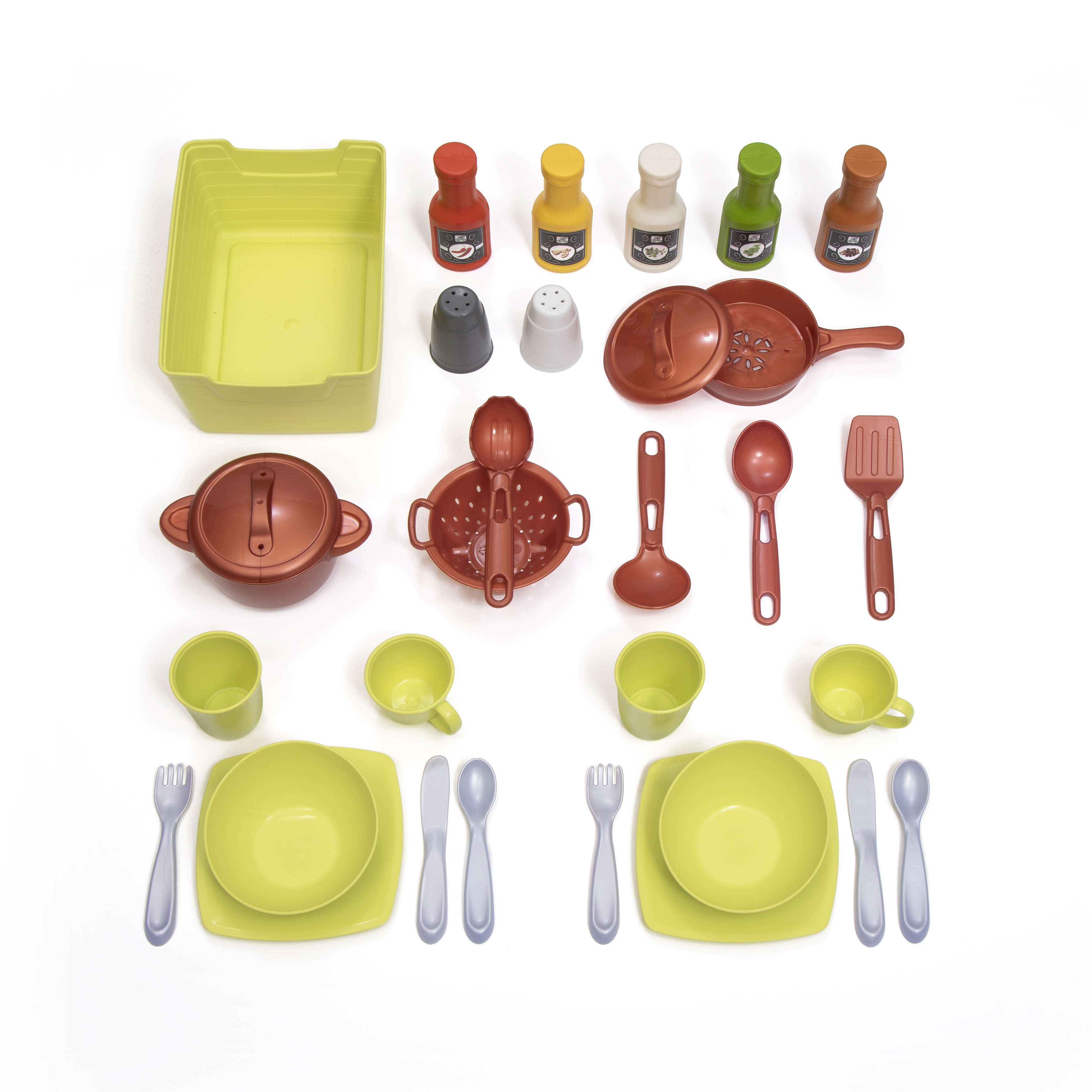 - In de doos: speelkeuken, 5 fantasiekruiken, 1 pot en 1 pan met deksels, hanglamp, 2 couverts (kopjes, kommen, borden, bestek), kookgerei, opbergbak.