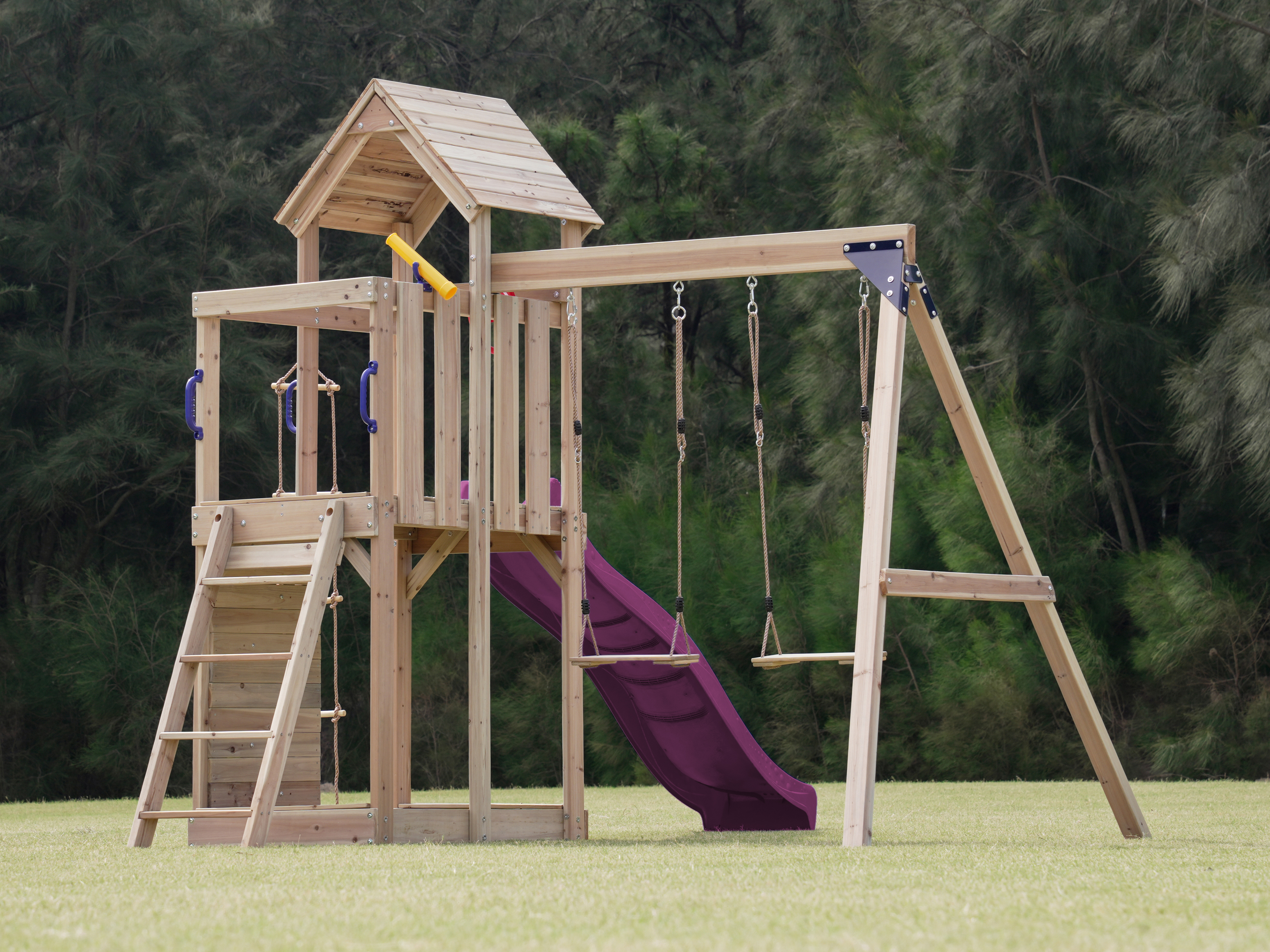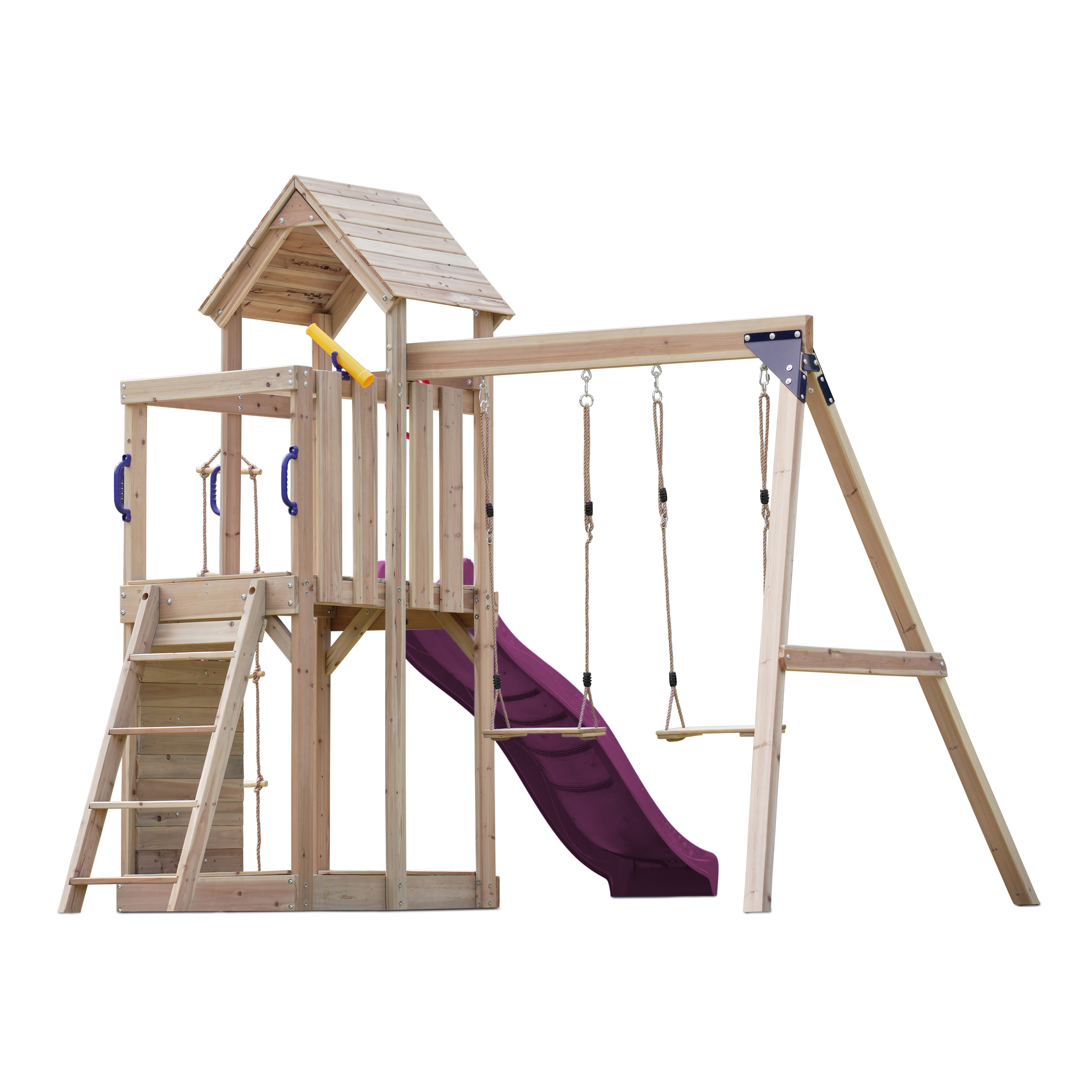 Productinformatie "Moos Speeltoestel met Schommel Bruin - Paarse Glijbaan"