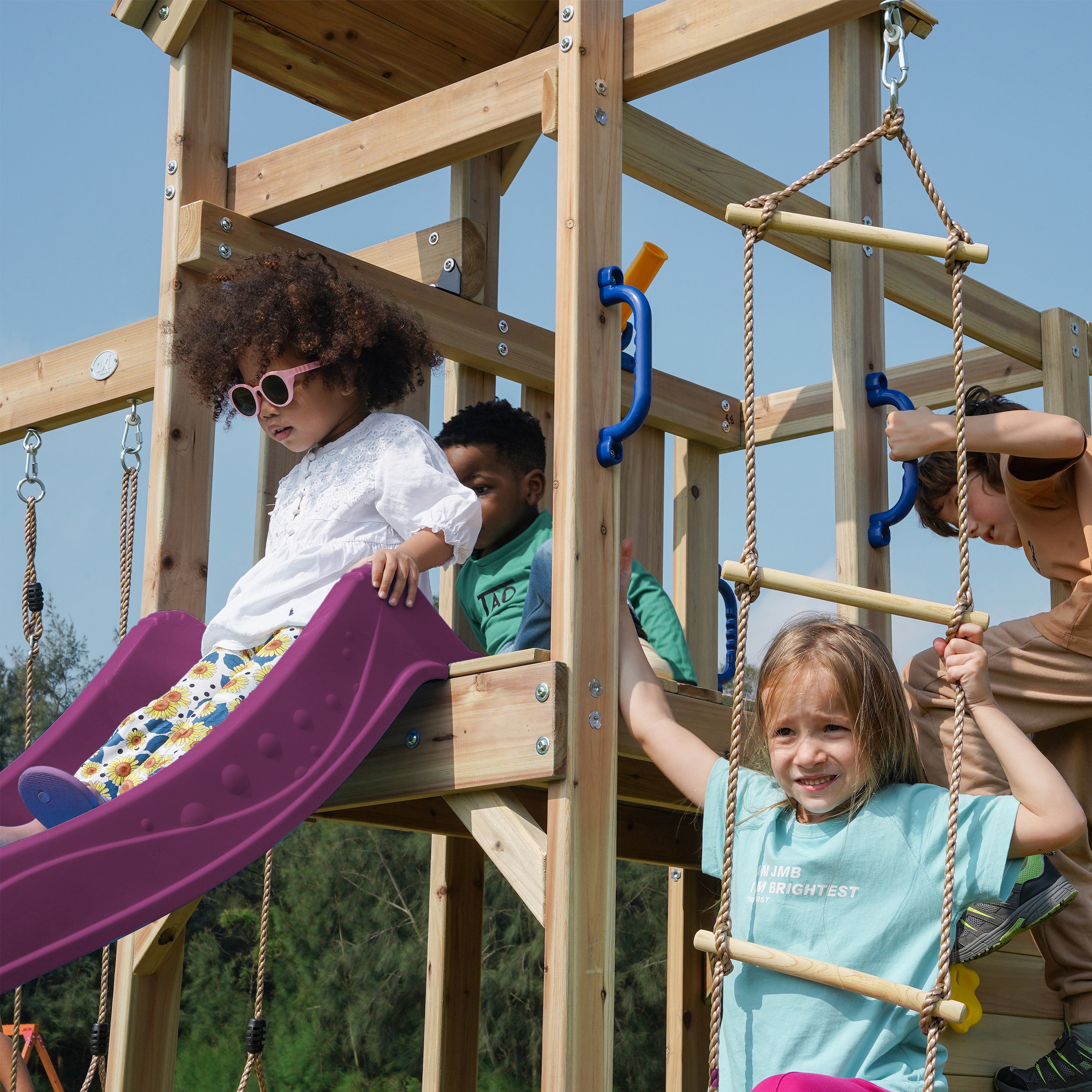 Er zijn drie manieren om naar de top te klimmen, afhankelijk van de leeftijd en klimniveau van je kindje. Beginners kunnen het rustig aan doen op de ladder. Gevorderden kunnen over de klimwand klimmen en experts kunnen de slingerende touwladder trotseren. Eenmaal boven kunnen ze alles goed in de gaten houden door de telescoop of spelen met het stuur. Wanneer het tijd is om naar beneden te gaan, biedt de lange glijbaan een snelle en moeiteloze afdaling. De glijbaan is voorzien van een wateraansluiting die eenvoudig doorgeboord kan worden. Zo kan je op warme zonnige dagen ook genieten van heel veel waterpret! Onder de speeltoren bevindt zich een zandbak waar kinderen samen zandtaartjes kunnen bakken.