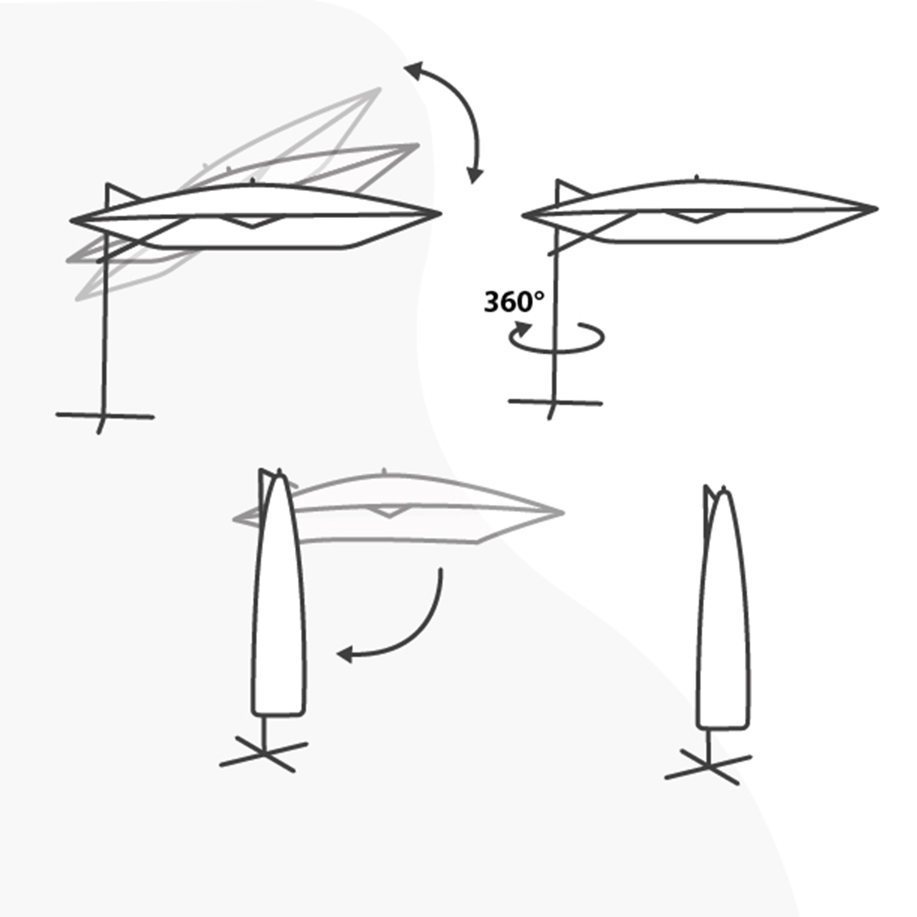 Met het kantelmechanisme kun je de parasol eenvoudig aanpassen aan de stand van de zon, of deze nu laag staat of recht van boven komt. Dankzij het voetpedaal draai je de parasol moeiteloos 360 graden, zodat je altijd schaduw hebt waar je het nodig hebt – zonder de parasol te hoeven verplaatsen.