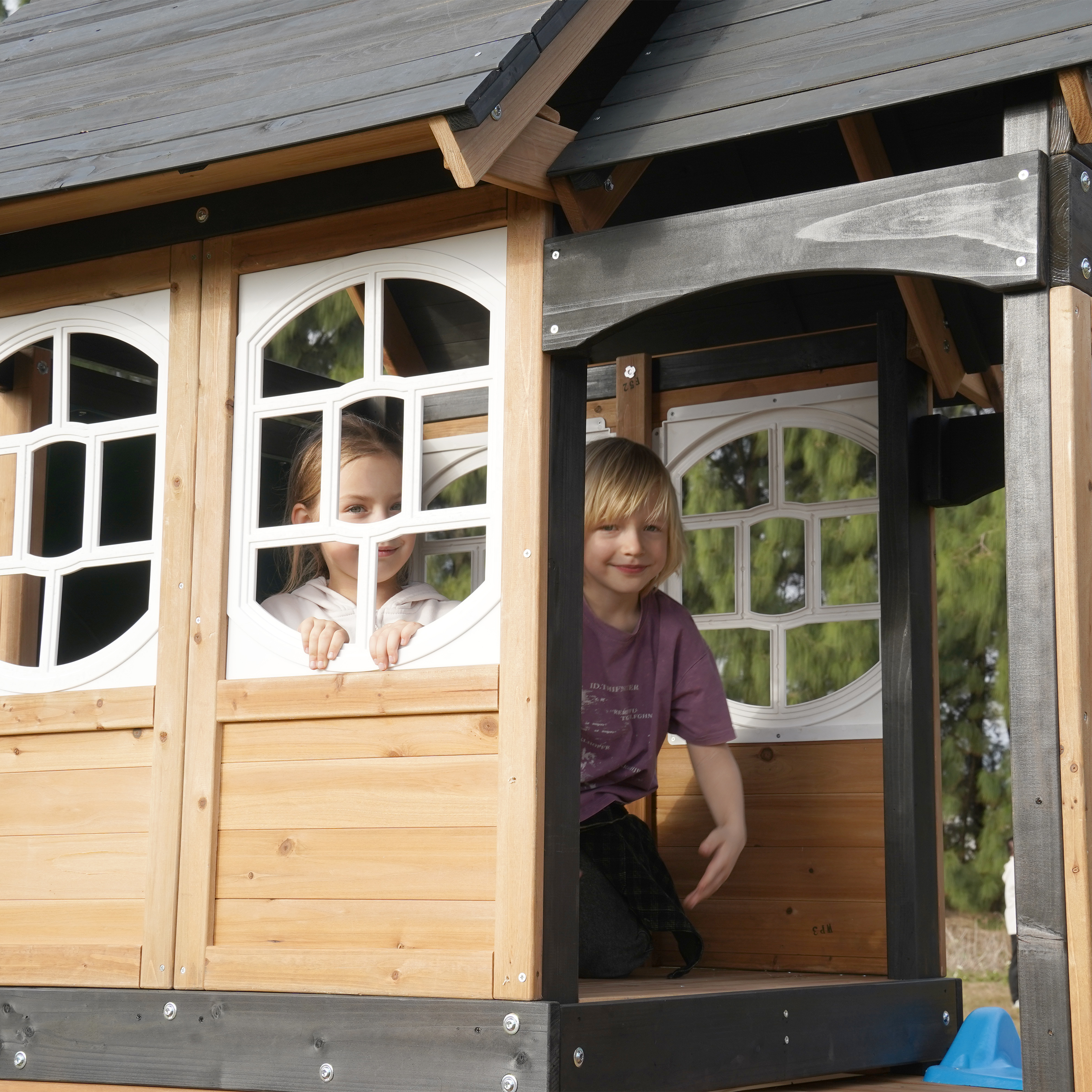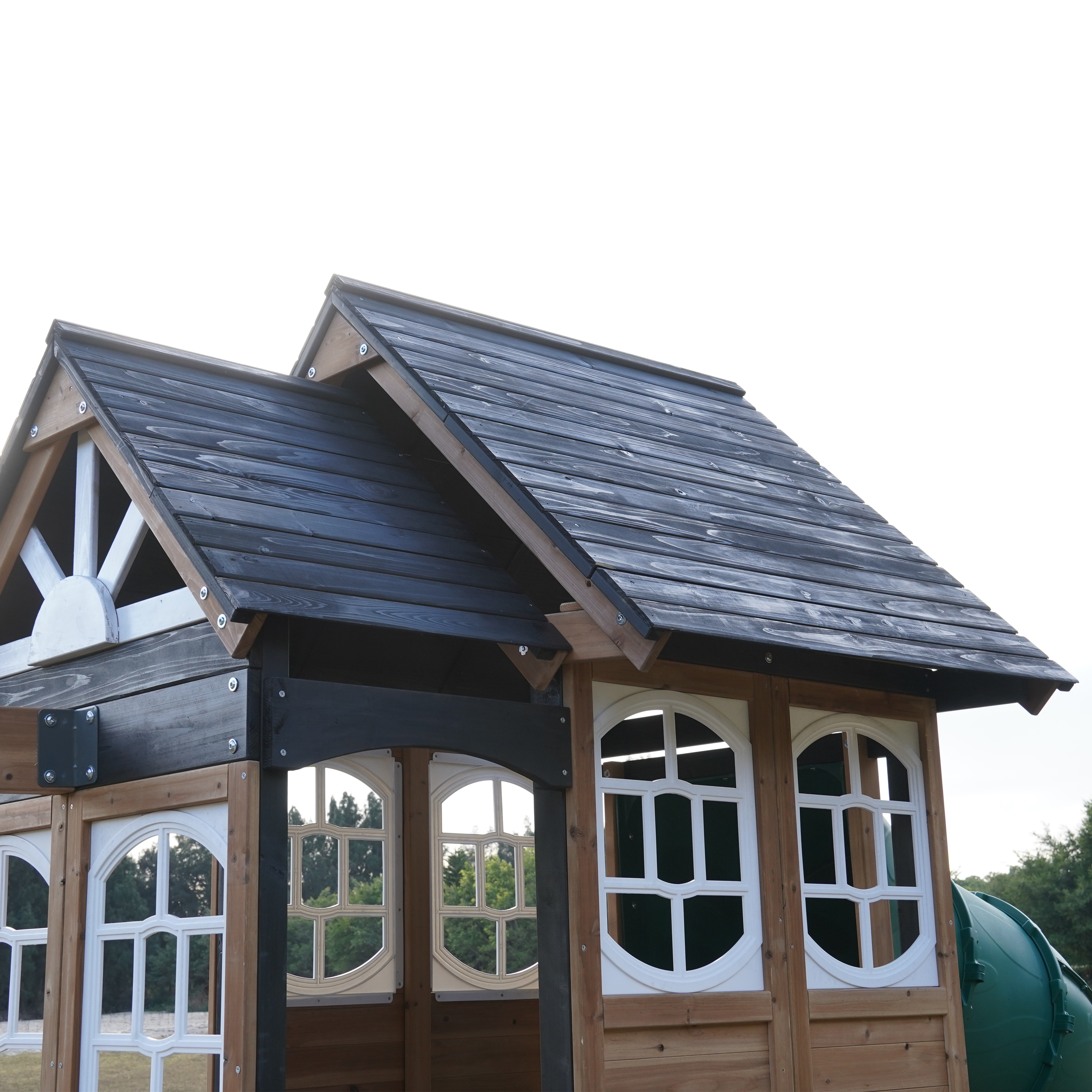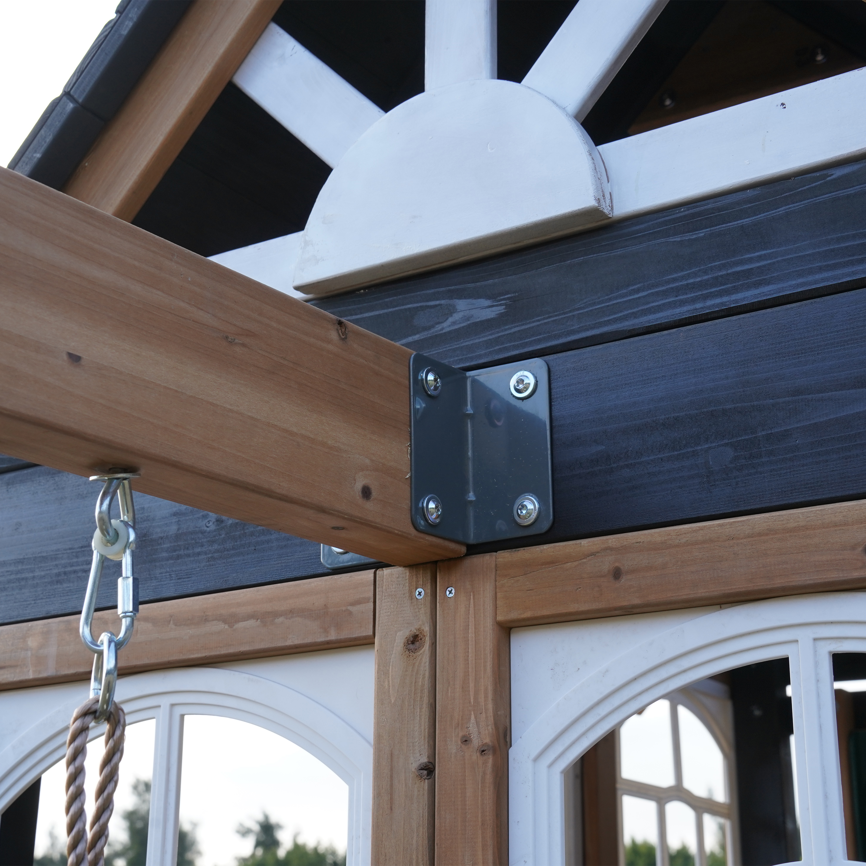 Naast de speeltoren zorgen twee schommels en een trapeze voor extra speelplezier. Onder het platform bevindt zich bovendien een speelhuisje met luik en bankje, waar kinderen even kunnen uitrusten, gezellig kunnen kletsen of samen winkeltje kunnen spelen.